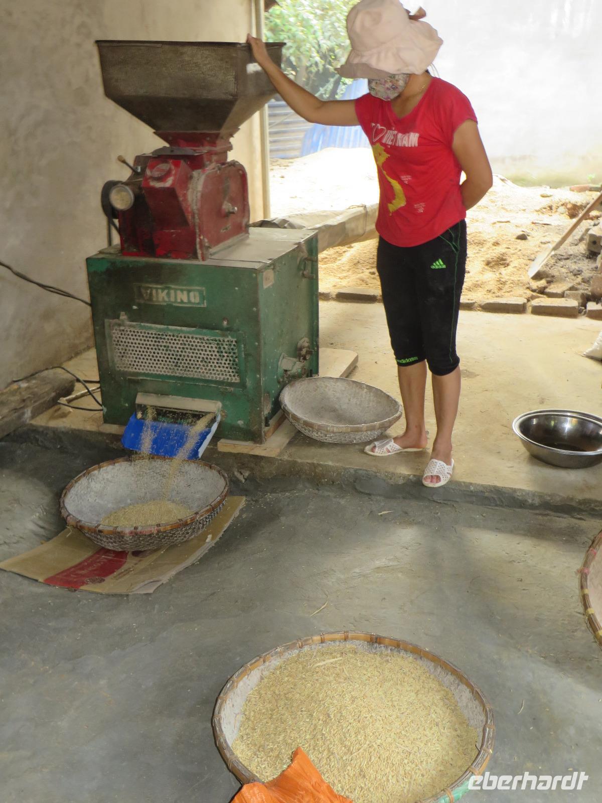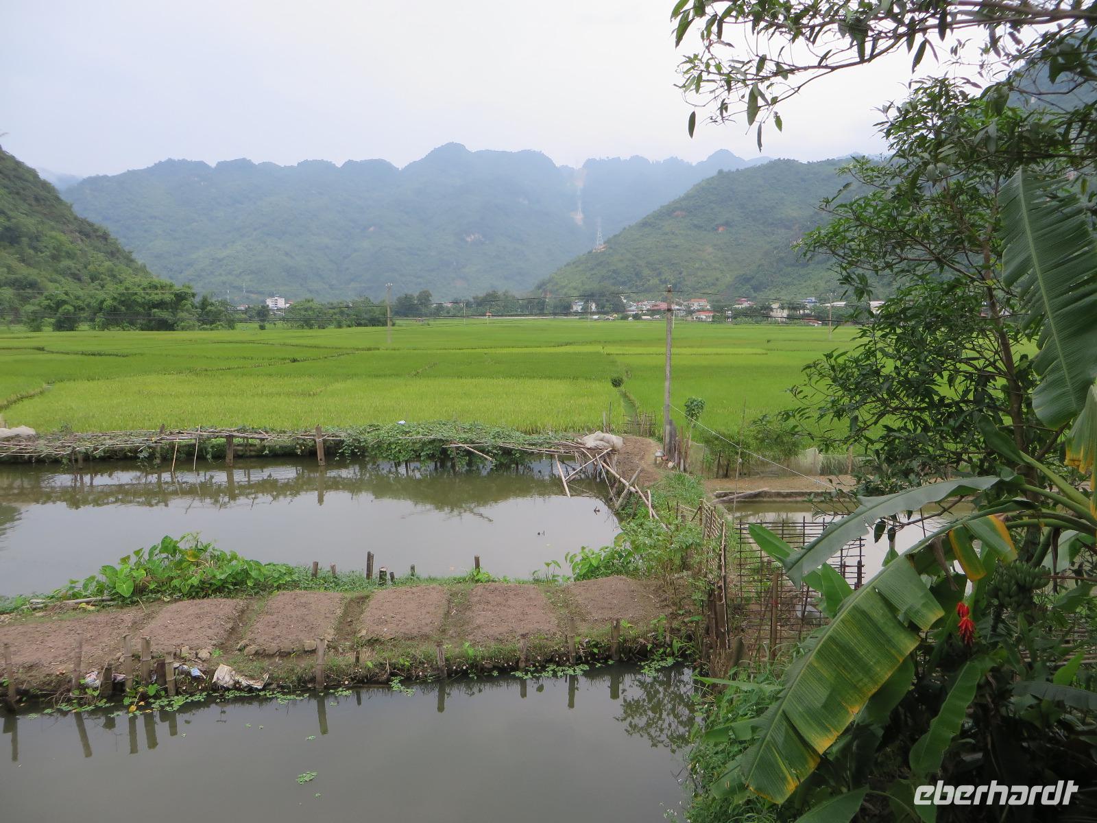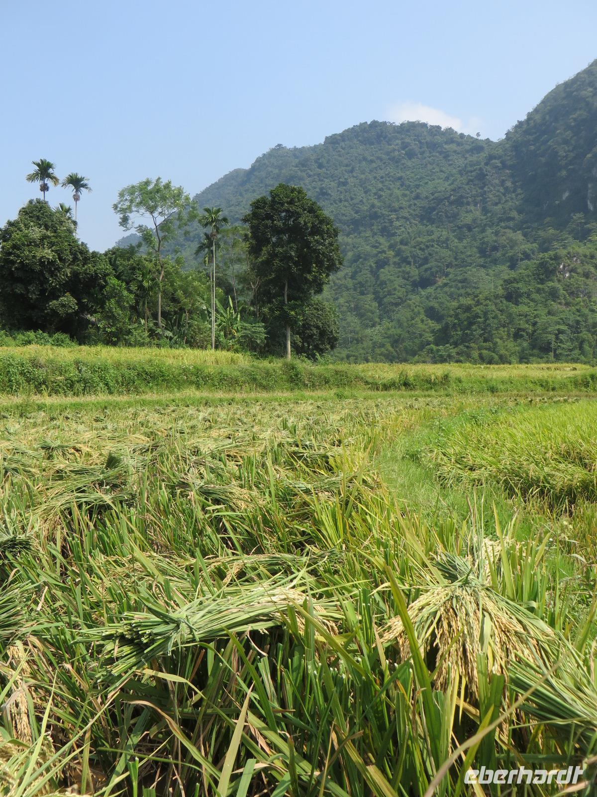 Nachdem wir Hanoi hinter uns gelassen haben, fallen uns sofort die ganzen Reis- und Zuckerrohrfelder in die Augen. Früher, so erklärt uns Han, wurde einmal im Jahr Reis geerntet, mittlerweile im Norden zwei-, im Süden sogar dreimal.