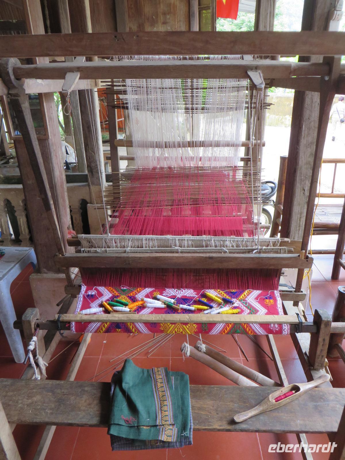 Wir machen nach etwa 50 Kilometern eine kleine Kaffeepause und vertreten uns die Beine. Leider hat es mittlerweile doch angefangen zu regnen, aber wir hoffen doch darauf, dass es bis zu unserer Ankunft aufhört. Die Straßen werden immer spannender, die Hügel werden zu ausgewachsenen Bergen und die Vegetation verändert sich mit der Höhe auch auffällig. Kurz vor unserer Mittagspause machen wir eine kurze Fotopause, zu der wir Sonne bestellen. Und kaum steigen wir aus dem Auto aus, fängt die Sonne auch schon an zu scheinen! Die letzten Tropfen Regen ignorieren wir geflissentlich... Unser Mittagessen nehmen wir in einem tollen Dorf der Thai ein, der Minderheit, bei der wir den Tag verbringen werden. Mit einem herrlichen Blick auf Reisfelder schmeckt das Essen fantastisch! Nach dem Essen nutzen wir die Zeit und bummeln durch das Dorf. Hier werden wunderschöne Webstoffe hergestellt, und Viele von uns greifen zu.