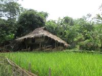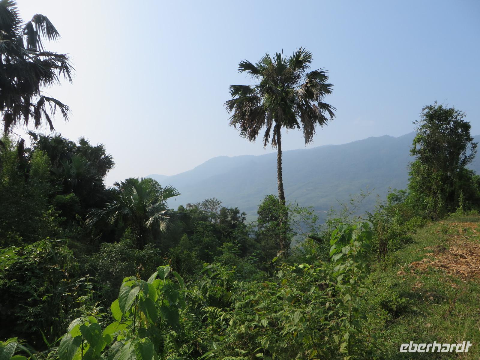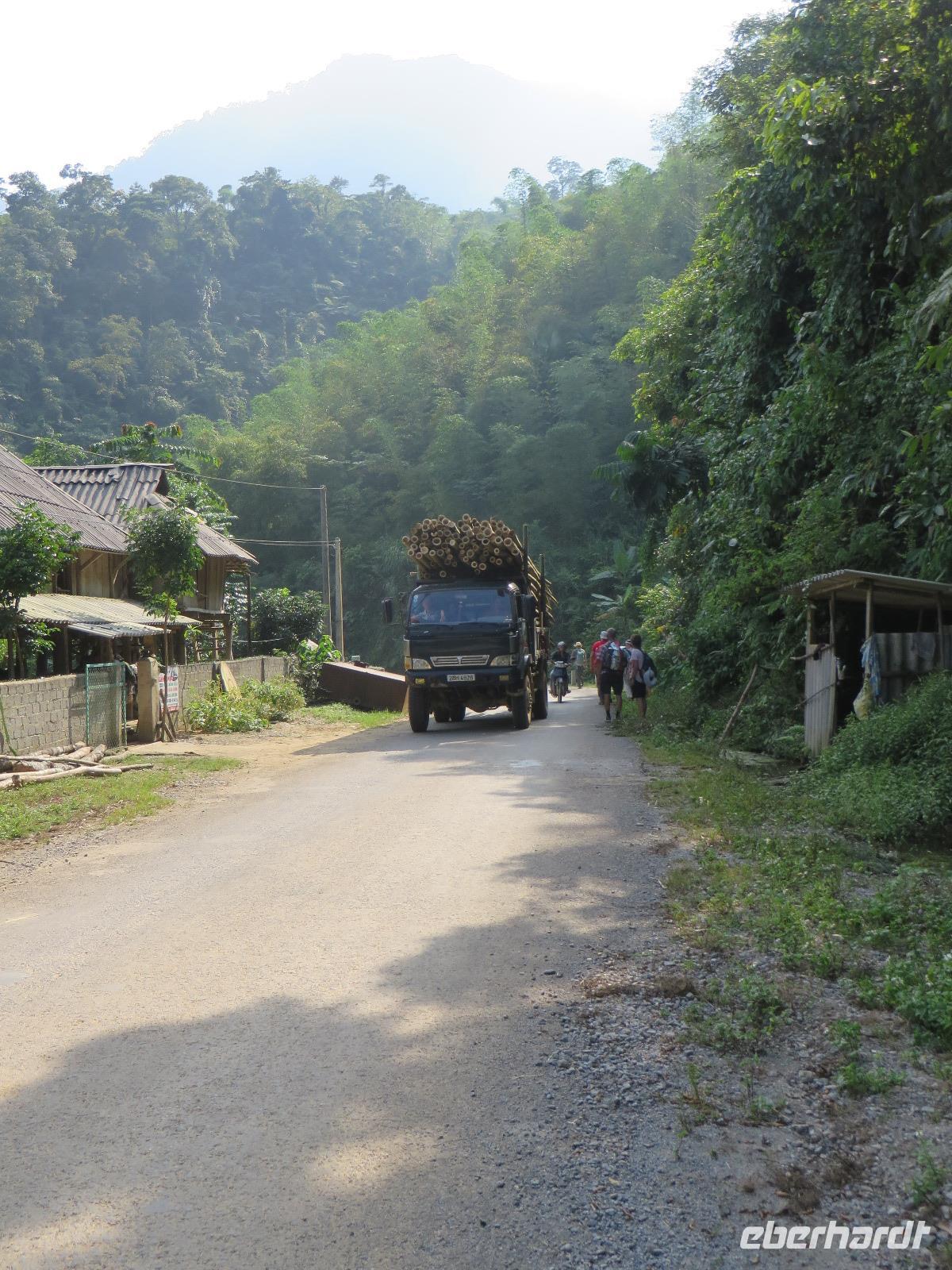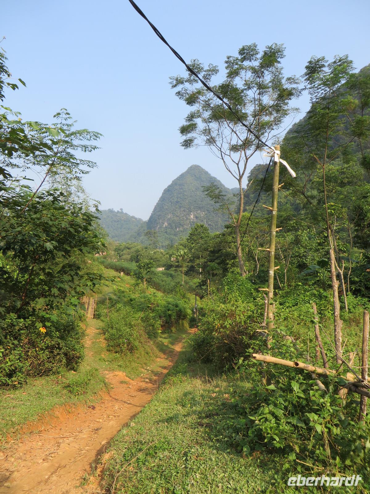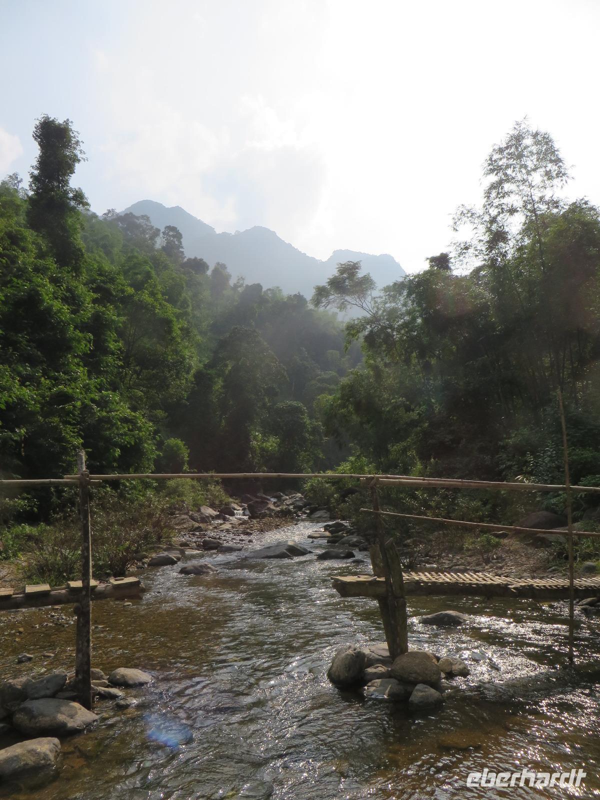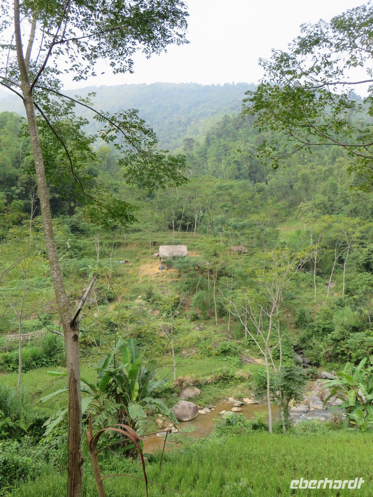 Nach der Pause geht es auf die letzte Wegstrecke. Mittlerweile sind wir doch ein wenig müde und fragen Han, wie weit es noch ungefähr ist. Wir lernen hier zwei neue Formen der Weg- beziehungsweise Längenmessung: Zum einen wird bei den Thai, die wohl keine eigenen Zahlen beziehungsweise Wörter hierfür haben, eine Strecke in der Wurfdistanz eines Messers angegeben. Zum anderen lernen wir die Bedeutung der "vietnamesischen Streckenangabe": Wenn es heißt, noch 400 Meter, fragen wir zurück, ob deutsche oder vietnamesische, denn meist sind die vietnamesischen ein wenig länger .