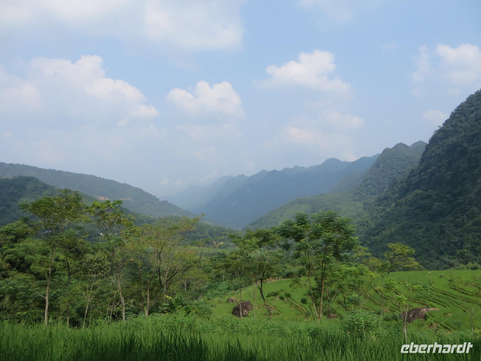 Heute steht die letzte Wanderung im Norden Vietnams auf dem Plan, und so geht es früh am Morgen zurück in die Berge. Nach einer schönen Wanderung mit herrlichen Ausblicken auf unser "Postkarten-Vietnam" erreichen wir unseren Bus und müssen uns hier leider von unseren beiden tollen Köchen und unserem Wanderreiseleiter verabschieden. Zugegebenermaßen freuen wir uns alle auch ein bisschen auf saubere Kleidung, was uns den Abschied versüßt .