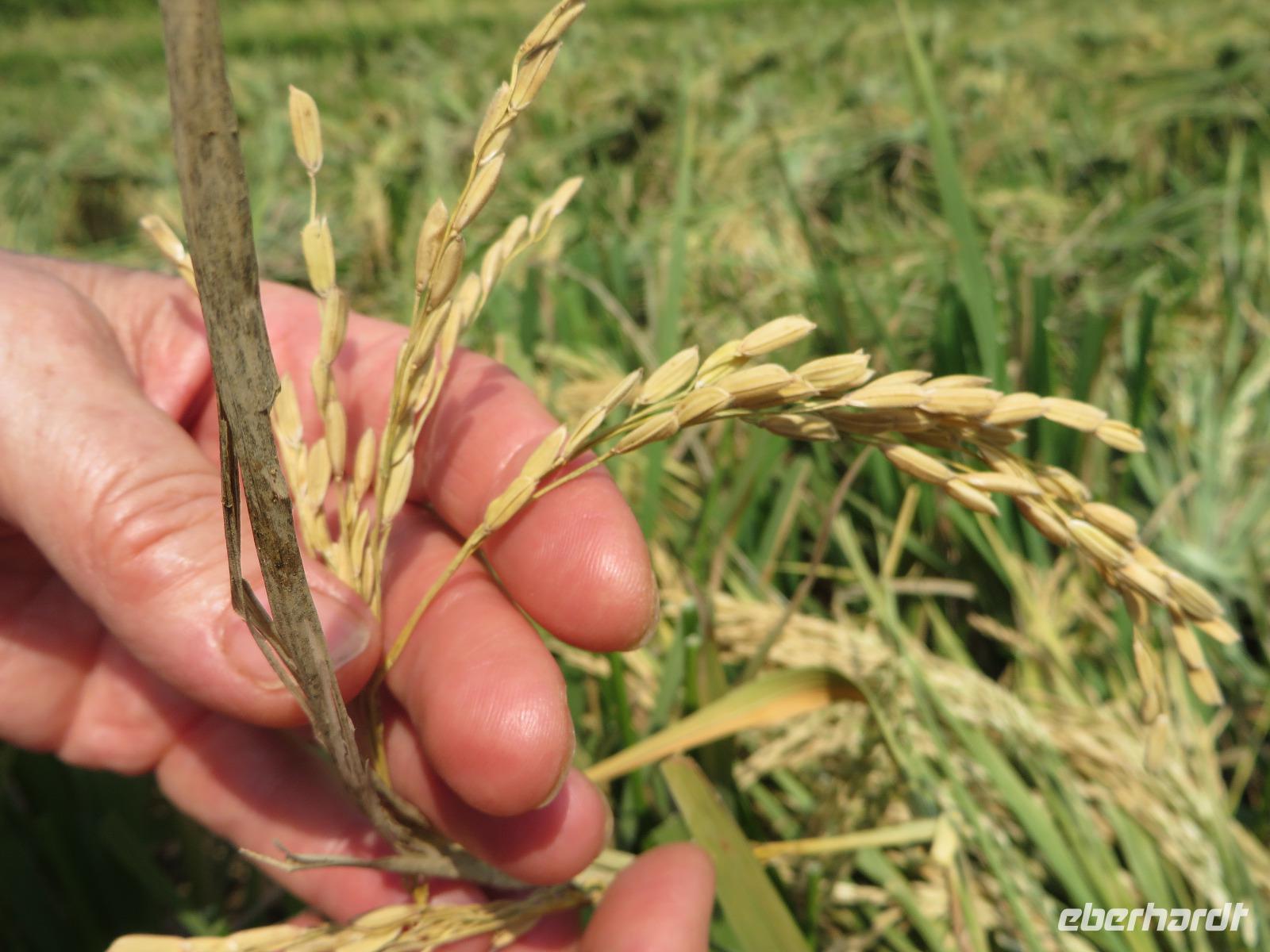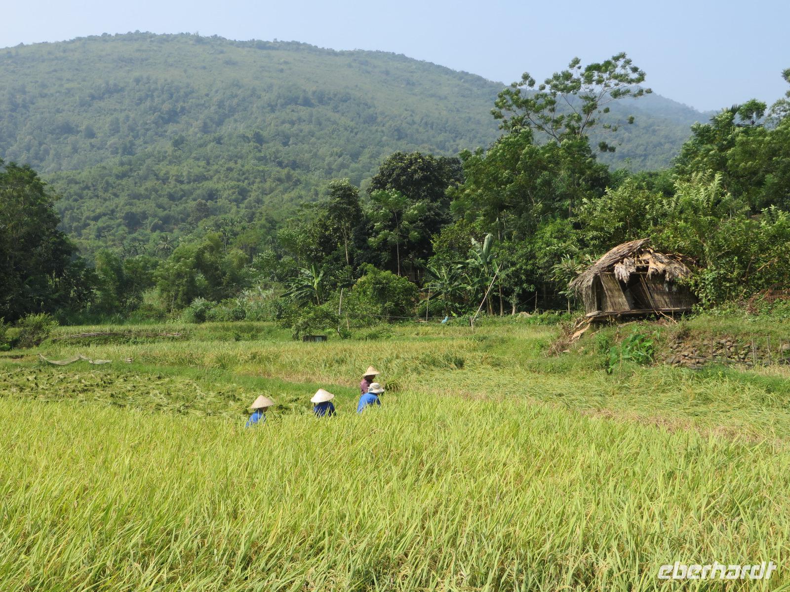 Mit dem Bus geht es nun weiter Richtung Ninh Binh und zur Trockenen Halong Bucht. Während der Fahrt genießen wir den Ausblick auf die unterschiedlichen Landschaften und die verschiedenen Feldfrüchte am Wegesrand. Der Reis ist mittlerweilse reif und wird geerntet, das müssen wir natürlich aus der Nähe begutachten! Aber auch an jeder Menge Zuckerrohr, Maniok, Einbaum- und Teepflanzen kommen wir vorbei, und die Straßenhindernisse in Form von Kühen, sehr voll geladenen Mopeds oder auch Enten lassen uns oft die Kamera zücken.