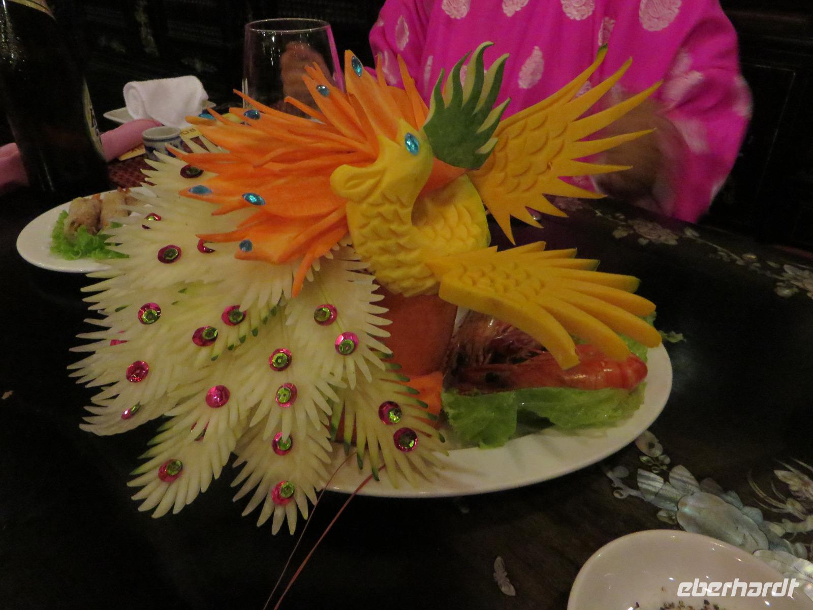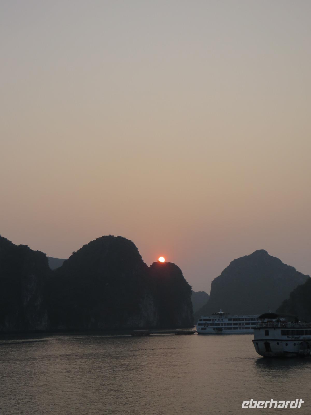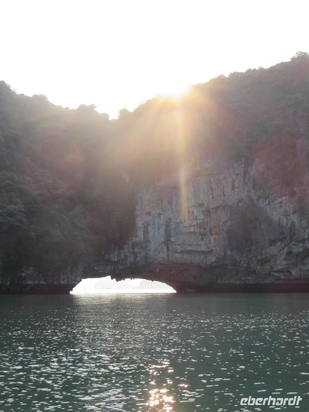 Dort erwartet uns ein sehr leckeres Mittagessen, während unser Schiffsguide Vu uns bereits auf einige besonders geformte Karstfelsen oder andere Besonderheiten aufmerksam macht. So sehen wir Felsen, die aussehen wie Enten, ein Elefantenkopf oder aber auch wie das Gesicht des Weihnachtsmannes.