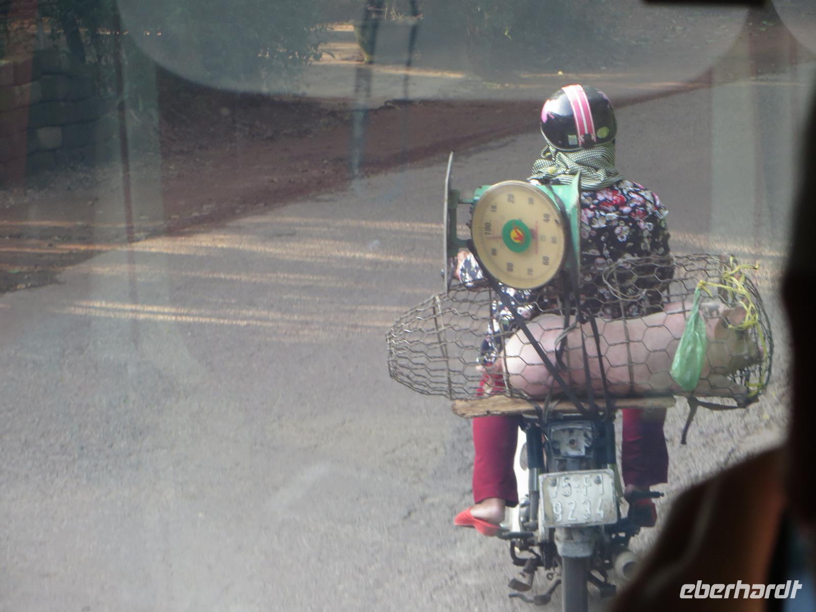 Auf dem Wege können wir schon erahnen, dass hier sehr andere Verkehrssitten zu gelten scheinen als in Deutschland: unglaublich viele Mopeds, Roller und Fahrräder sind auf den Straßen. Viele sind voll beladen mit verschiedensten Verkaufsgütern oder der Großfamilie. Wir bewundern unseren Fahrer, der immer die Nerven behält, auch beim größten Hup-Konzert.
