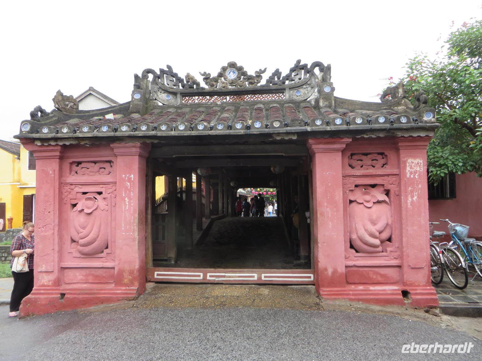 Chien führte uns durch die kleinen Gassen, und wir genossen es sehr, zu stöbern und jede Menge Mitbringsel zu kaufen. Einige Häuser der Altstadt werden seit 15 Generationen bewohnt und sehen sehr urig aus. Durch die Japanische Brücke werden die chinesischen und japanischen Stadtteile von einander getrennt. Chien erklärt uns, dass die Japanische Brücke hier in Hoi An liegen muss, weil laut japanischem Glauben ein Monster hier mit seinem Körper liegt und so in der Erde gehalten wird. Der Kopf des Monsters ist in Indien und der Schwanz in Japan - ein Glück, dass es seit Jahrtausenden schläft!