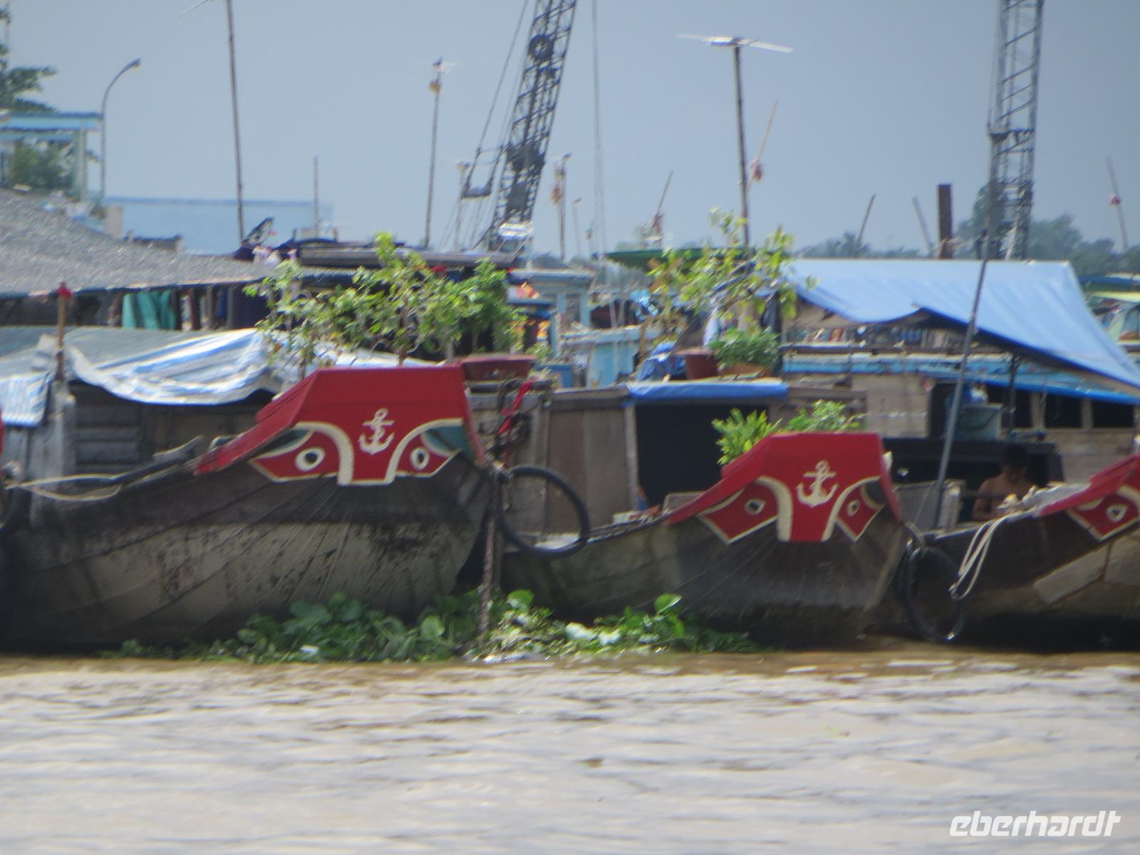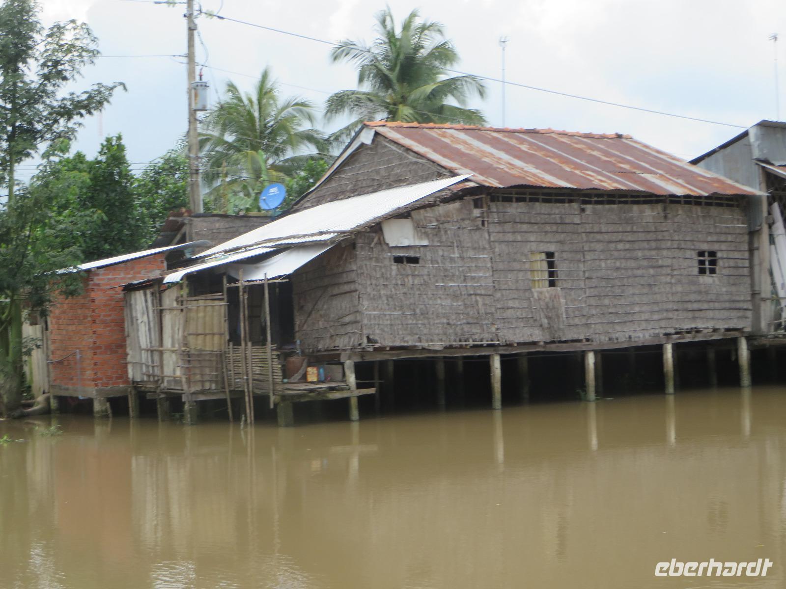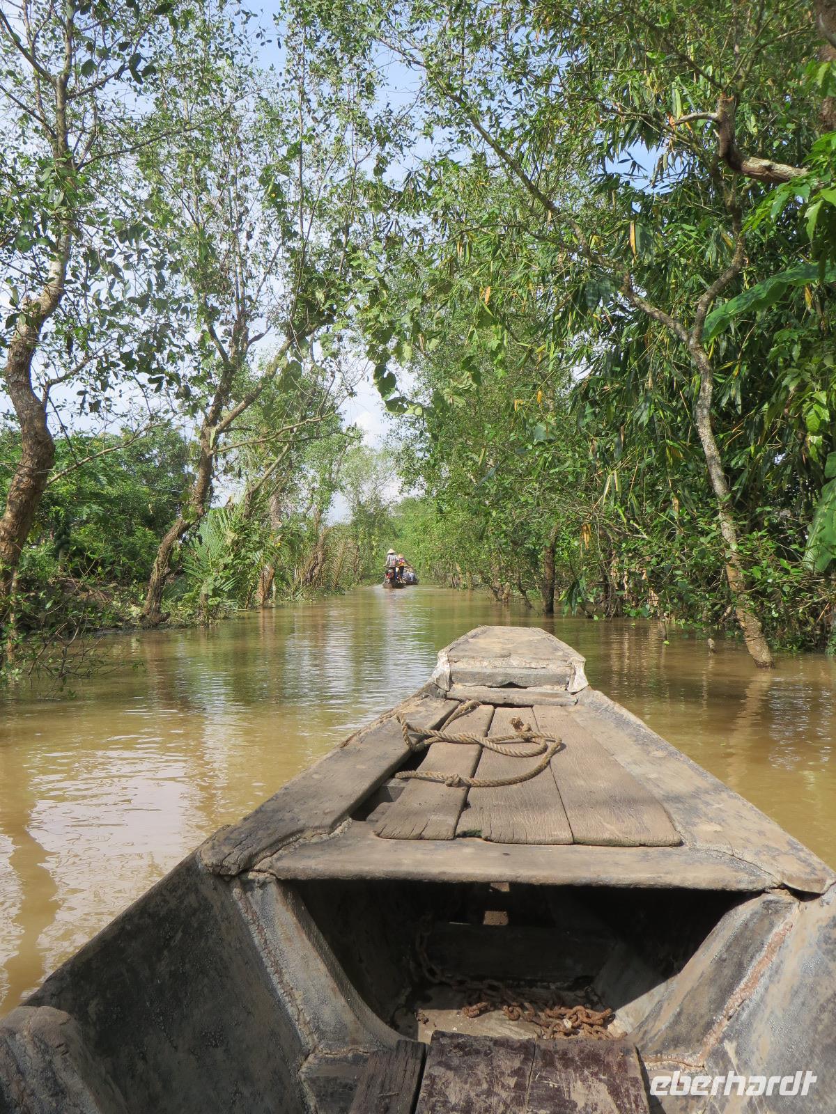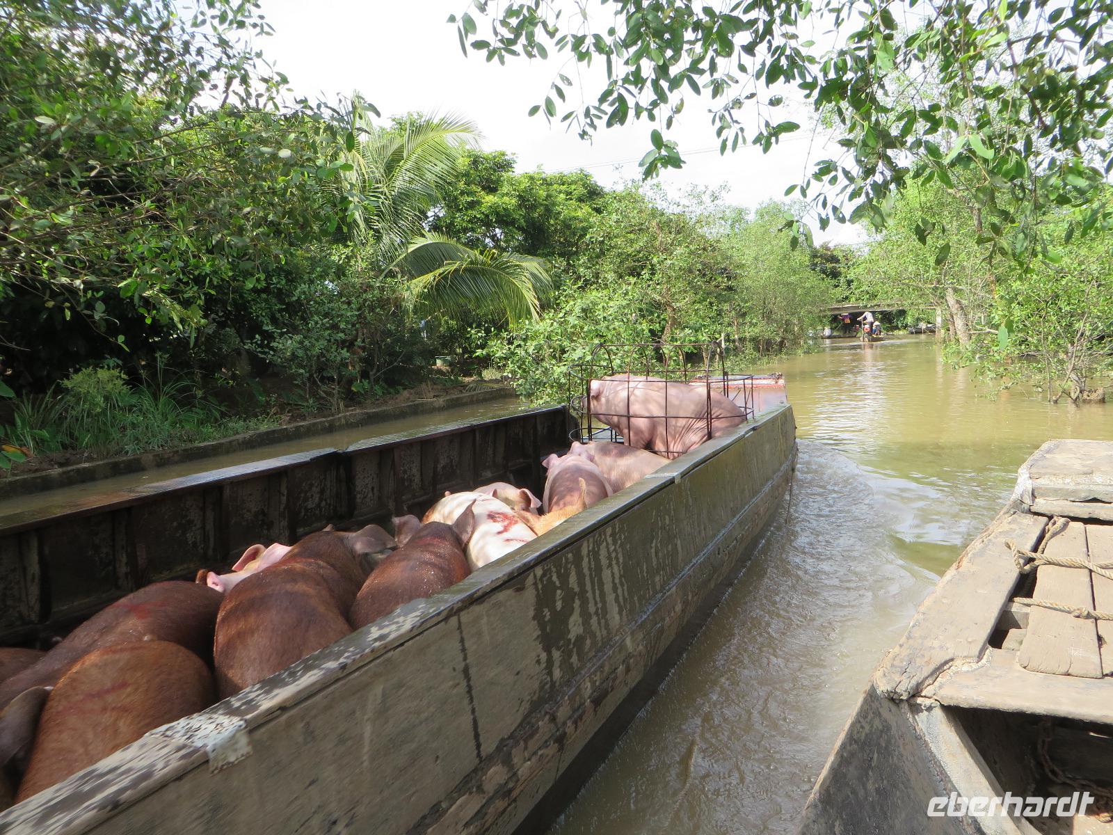 Nun aber fahren wir mit dem Bus Richtung Südwesten und Tan erklärt uns viel auf dem Weg. Angekommen steigen wir um in ein Boot und erkunden die schwimmenden Märkte. Anschließend geht es weiter zu den kleinen Dörfern, wo wir die Herstellung von Reispapier vorgestellt bekommen. Einer von uns darf es auch ausprobieren und schlägt sich gar nicht so schlecht. Außerdem können wir auch sehen, wie frischer Puffreis hergestellt wird. Natürlich wird die Qualität gleich überprüft und für sehr lecker befunden! Auch die leckeren Kokosnussbonbons lassen wir uns nicht entgehen. Anschließend fahren wir mit Boot durch die immer engeren Kanäle des Deltas und steigen auf kleinere Boote um. So kommen wir an kleinen Dörfern vorbei und können sehen, wie hoch das Wasser immer noch steht. Außerdem, so stellen wir fest, wird offenbar nicht nur auf den Mopeds alles mögliche transportiert, sondern auch mit den Booten. So werden wir von einem Boot überholt, auf dem jede Menge Schweine transportiert werden. Der vietnamesische Verkehr hört nicht auf, uns zu überraschen.