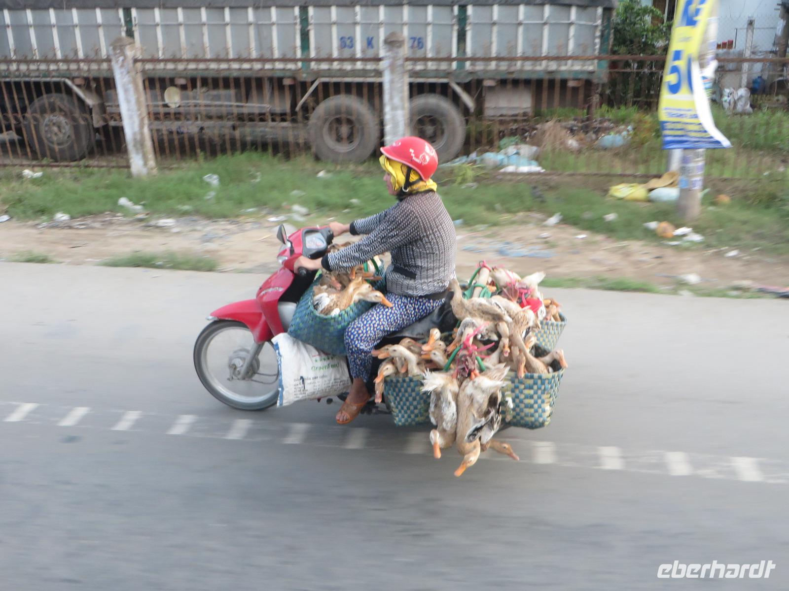 Wir erkunden heute das Mekong Delta! Unser erster Stopp gilt aber bei dem deutlich besseren Wetter der Chinatown und dem dortigen Markt. Hier lernen wir auch, wie die übervollen Mopeds beladen werden: Einer setzt sich auf das Gefährt und die andern packen darum herum!
