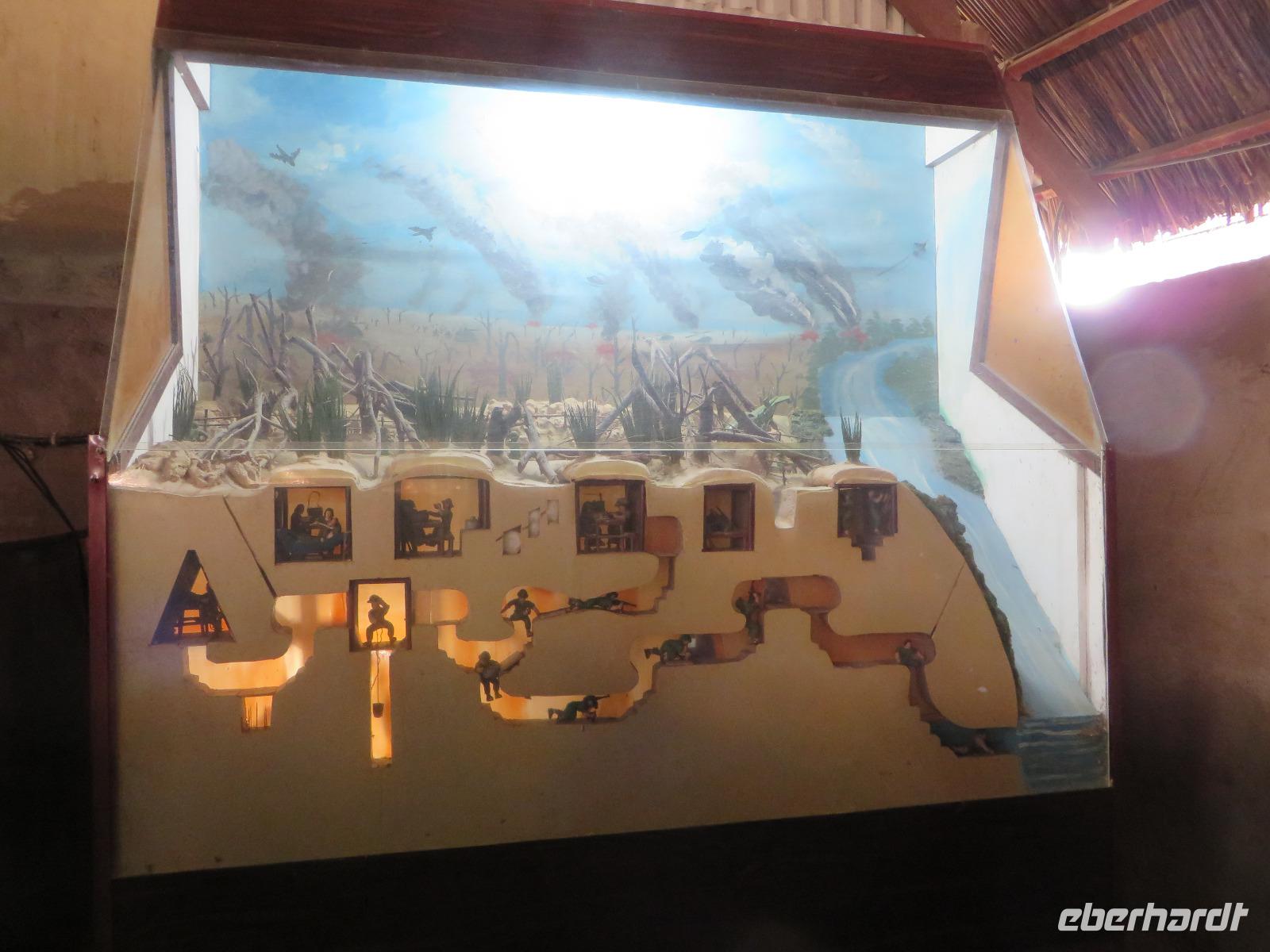In Cu Chi angekommen sehen wir zunächst einen kurzen Dokumentarfilm zu den Hintergründen, bevor wir uns das eigentliche Gelände anschauen. Wir sind beeindruckt, wie gut die Tunneleingänge getarnt waren und immernoch sind, genauso wie beispielsweise die Lüftungen der unterirdisch angelegten Küchen. Einen Teil der Gänge kann man auch begehen, allerdings traut sich nur einer von uns hinein.
