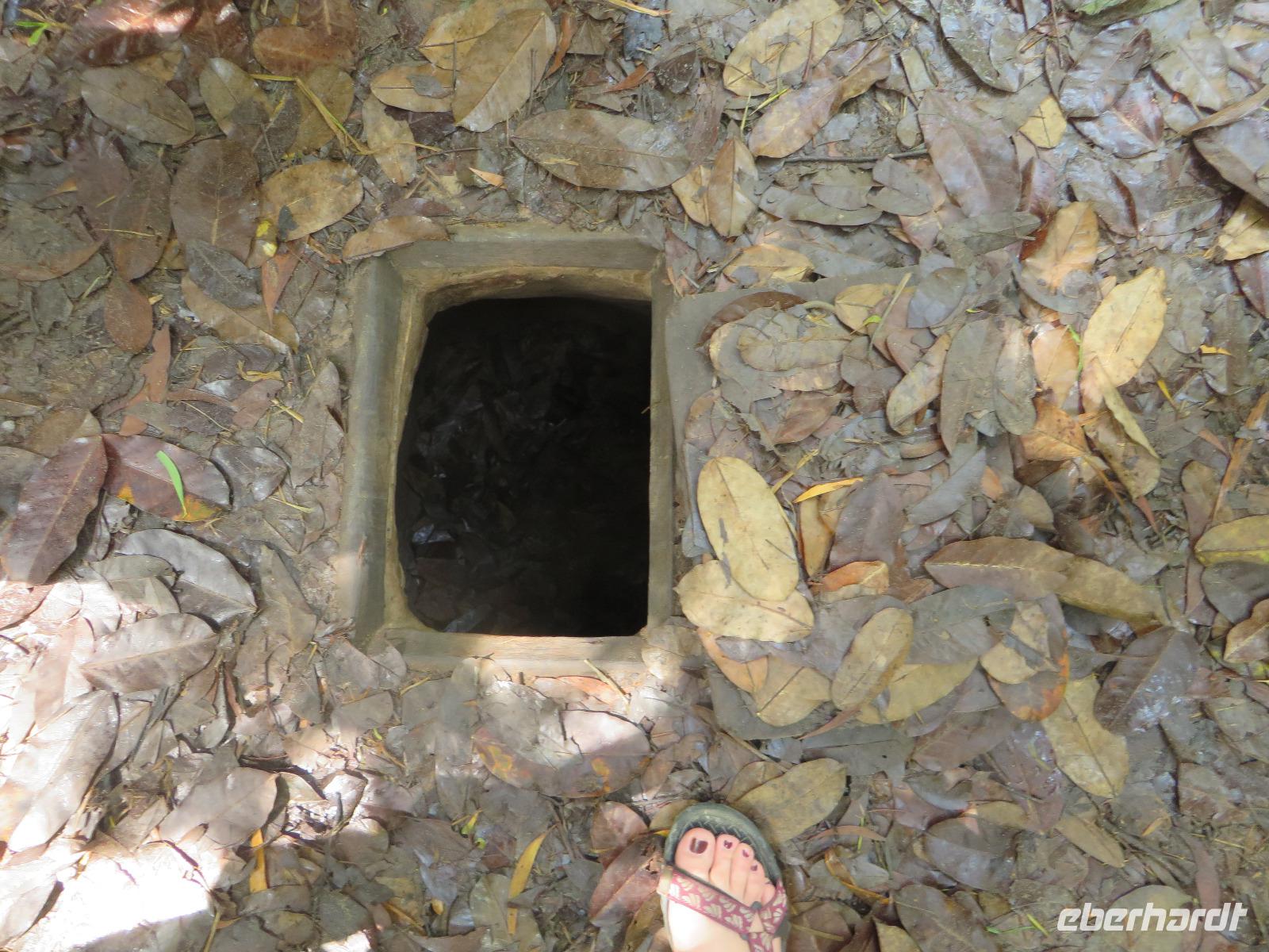 Nachdem unsere Schuhe völlig durchweicht waren haben wir die restliche Wanderung gestrichen. Auf dem Weg zum Aussichtspunkt konnten wir einen Teil des Tunnelsystems der Viet Kong sehen, die so zu den Amerikanern oben auf dem Berg gelangen konnten. Heute sind die Tunnel von Fledermäusen bewohnt.