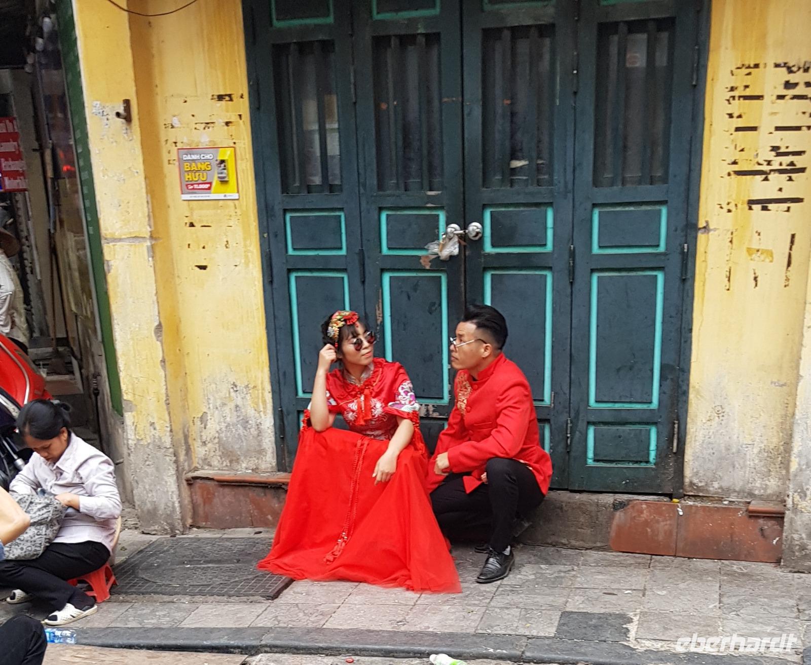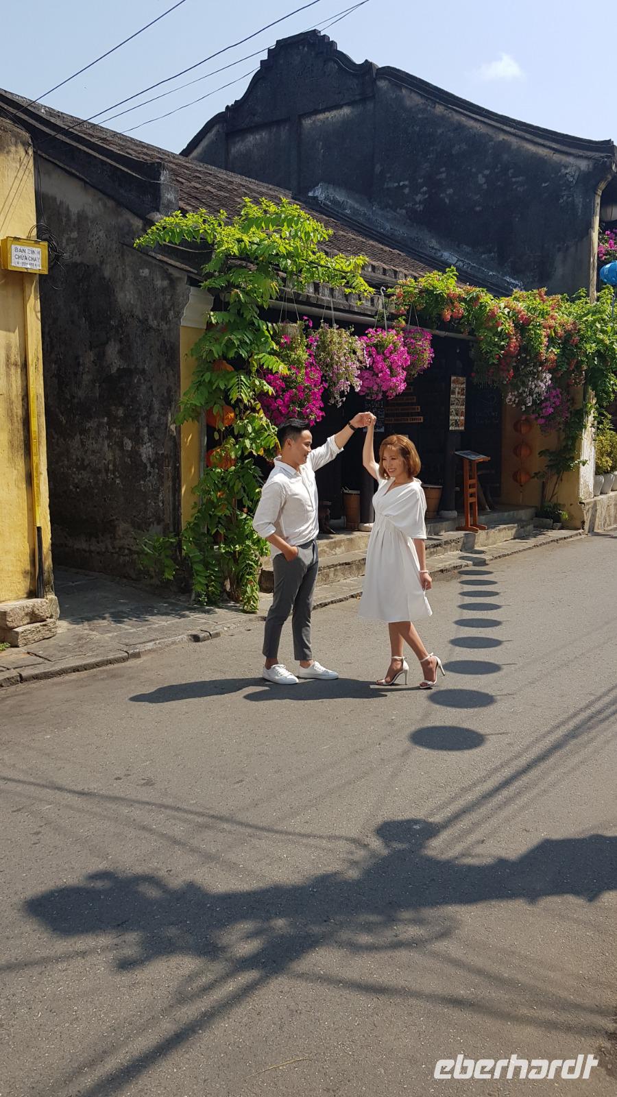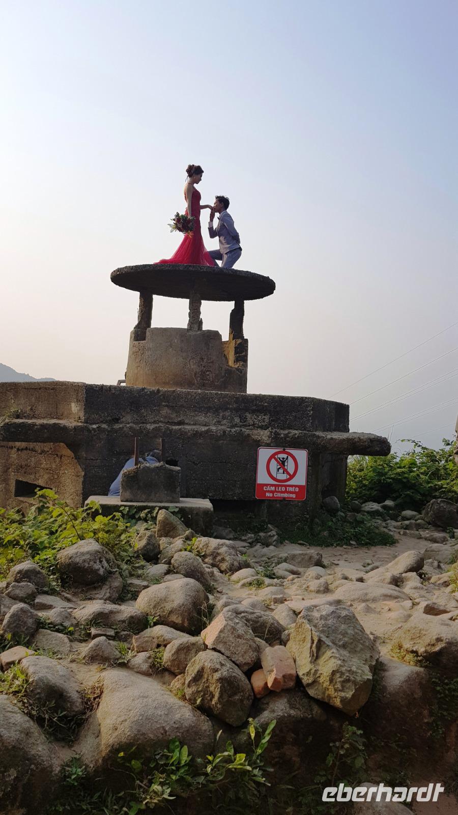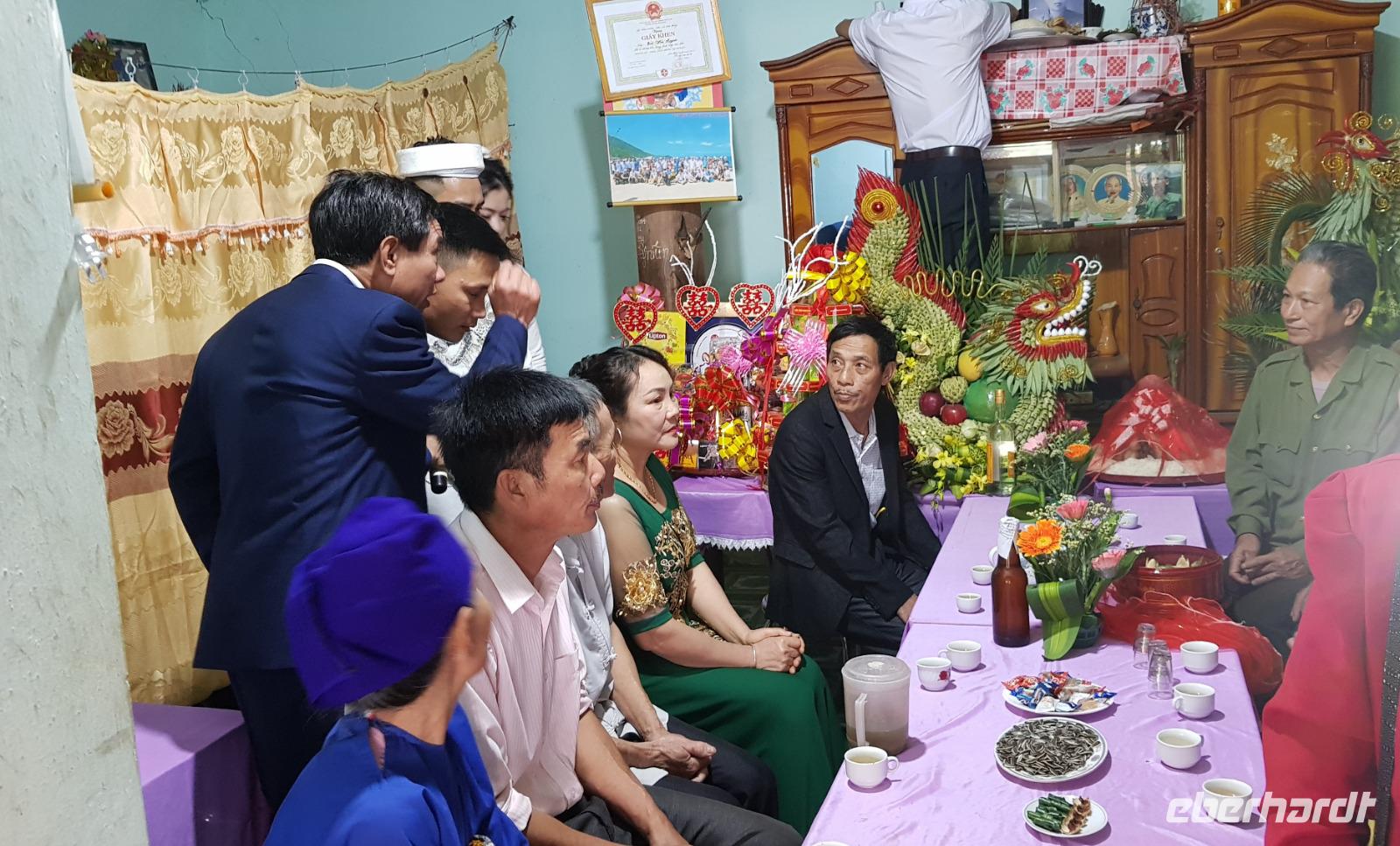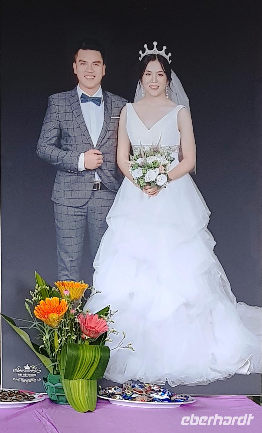Früh am Morgen wurde uns geholfen, unsere Koffer zum Bus zu tragen. Es ging weiter. Stopp! Eine Hochzeit. Unser Guide Thon war so lieb und hat das Brautpaar gefragt, ob wir kurz hereinkommen und uns das Fest anschauen dürften. In Vietnam wird eine Hochzeit mehrmals gefeiert. Es gibt Feier im Haus der Braut und Feier im Haus des Bräutigams. Dieses Fest war im Haus der Braut. Interessanterweise, die Eltern der Braut waren die ganze Zeit draussen mit den Gästen. Mit dem Paar waren die Verwandten die geholfen haben, die Hochzeit zu organisieren.