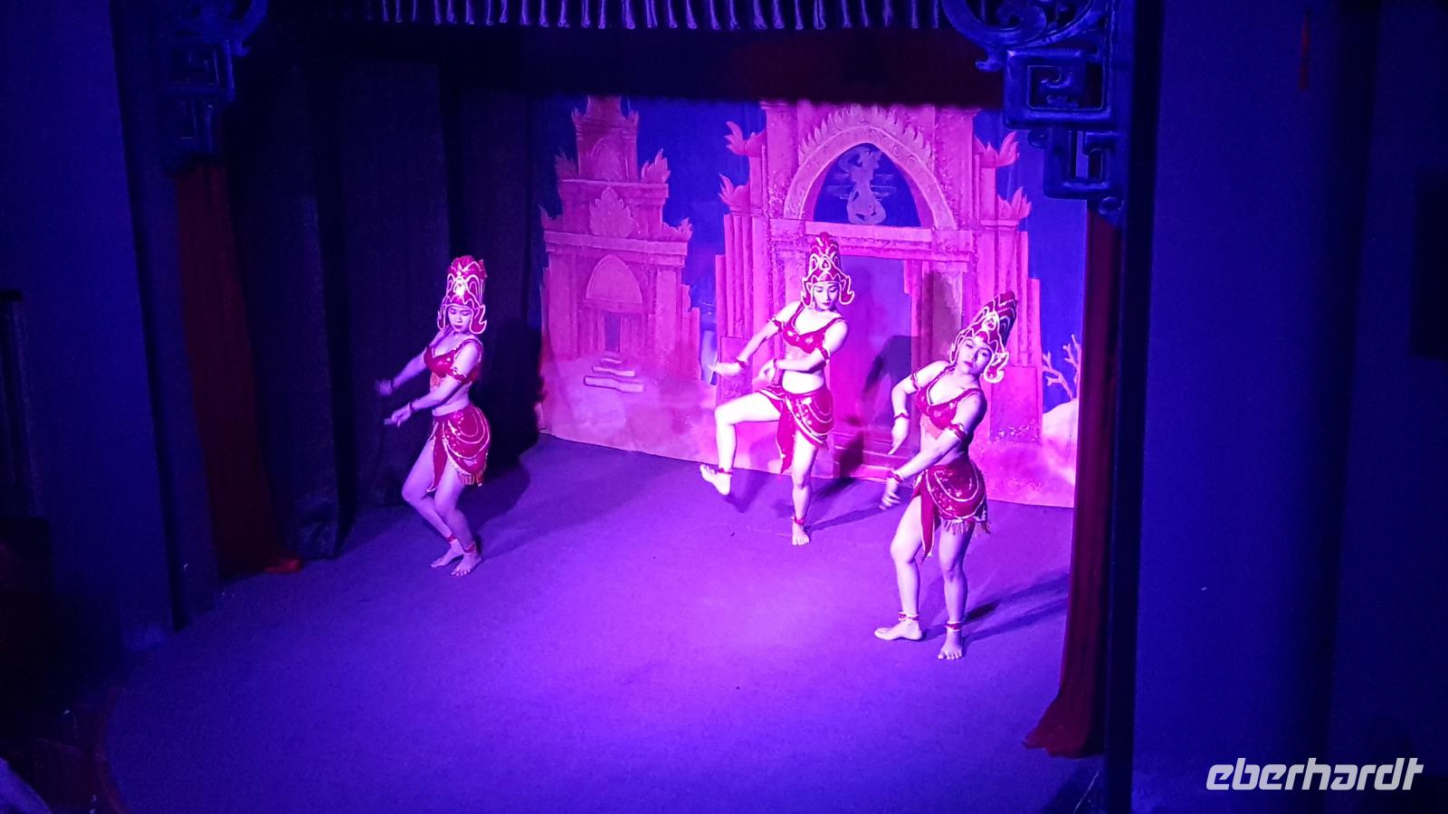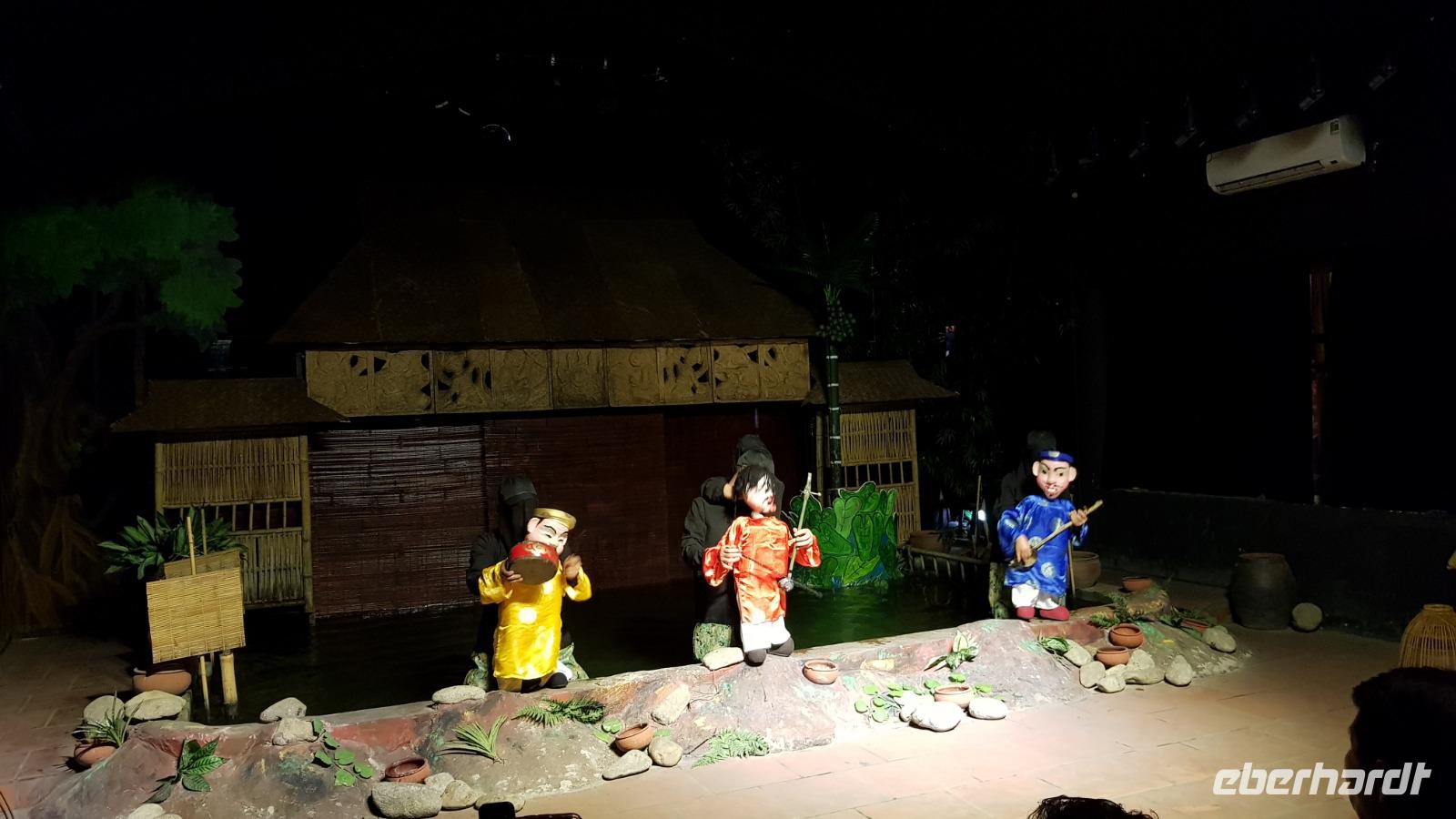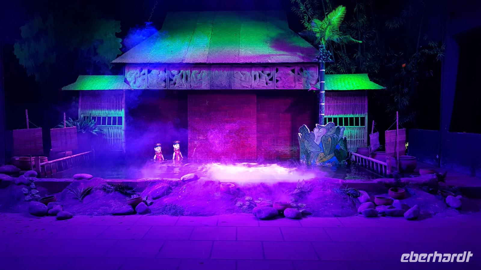 Und schon war unsere Zeit bei dem Park um. Wir mussten uns zum Wasserpuppentheater eilen. Die Vorstellung hat grade angefangen. Zuerst haben wir den Gesang gehört und 3 Puppen gesehen. Im Dunkeln konnte man kaum die Figuren der Männer und Frauen erkennen, die hinter den Puppen standen. Jeder von denen hat ein anderes Musikinstrument gespielt. Nachdem der Gesang zu Ende war, hat die eigentliche Vorstellung angefangen. Es wurden die berühmten Legenden aus dem Bauernleben präsentiert, alles im Wasser. Kaum zu glauben, dass alles von nur 4 Personen geleitet wurde. Wir haben die richtigen Drachen gesehen, die Feuer und Wasser gespuckt haben. Nach der Vorstellung hatten wir die Möglichkeit gehabt, näher zu kommen und uns die Mechanismen anzuschauen, mit denen die Puppen bewegt werden.