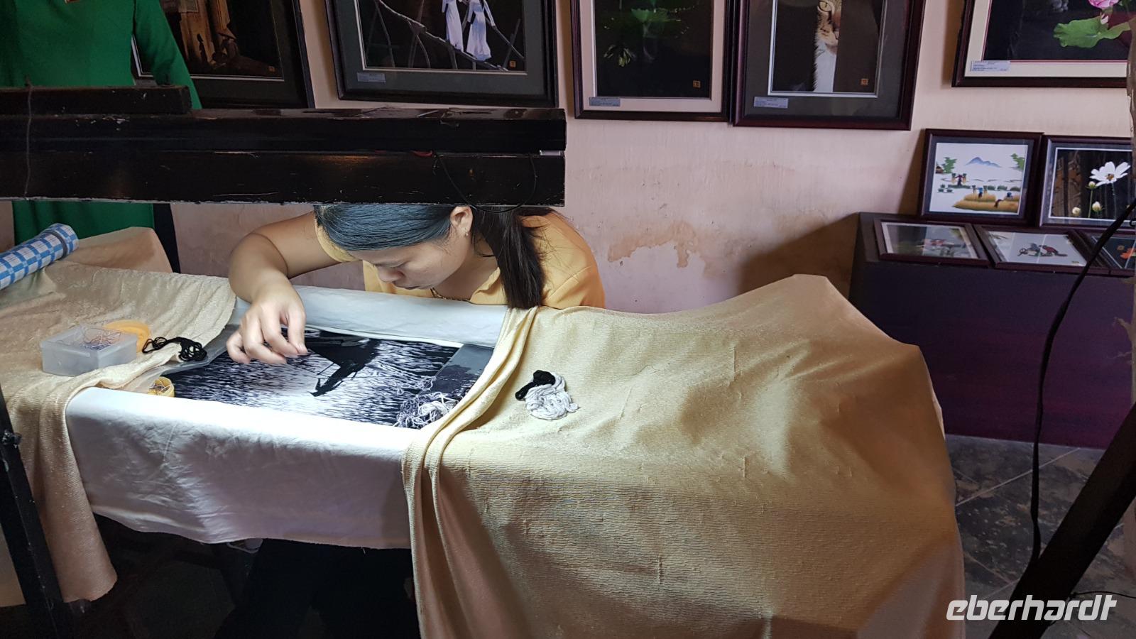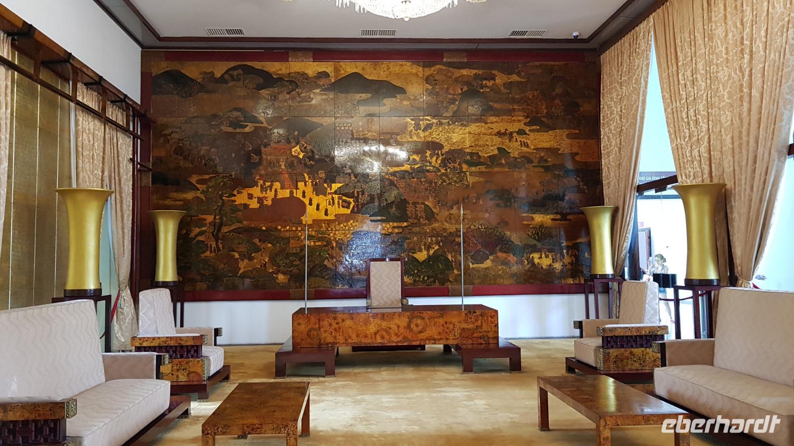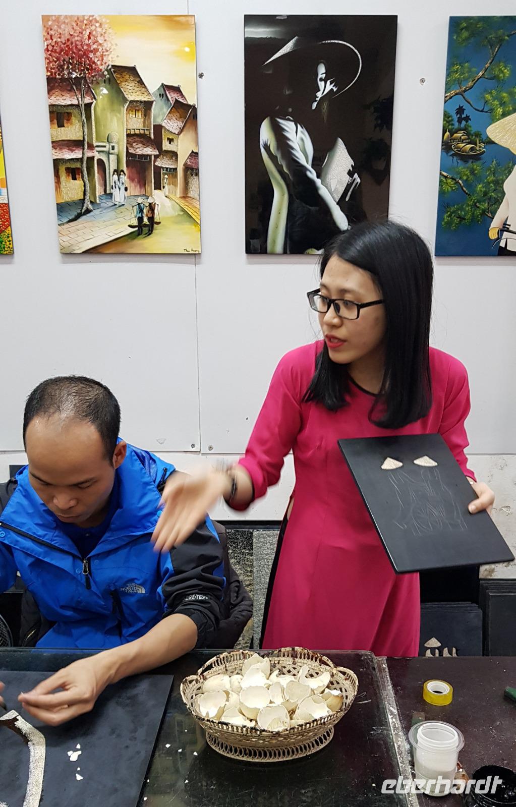 Unser Programm war für diesen Tag zu Ende, aber unser Guide hatte noch etwas vor. Also, sind wir nach der Vorstellung zu der Lackierfabrik gefahren. Es wurde auf Deutsch alles erklärt, wie die berühmten Lackbilder gemacht werden. Das ist sehr viel Arbeit, die Herstellung von einem Bild kann bis zu 2 Monate dauern. Es werden verschiedene Materialien benutzt, Eierschalen, Perlmutt, Lack. Wussten sie schon, dass Lack ein Harz von den Bäumen ist? Er ist transparent und erst nach dem Kochen wird er schwarz.