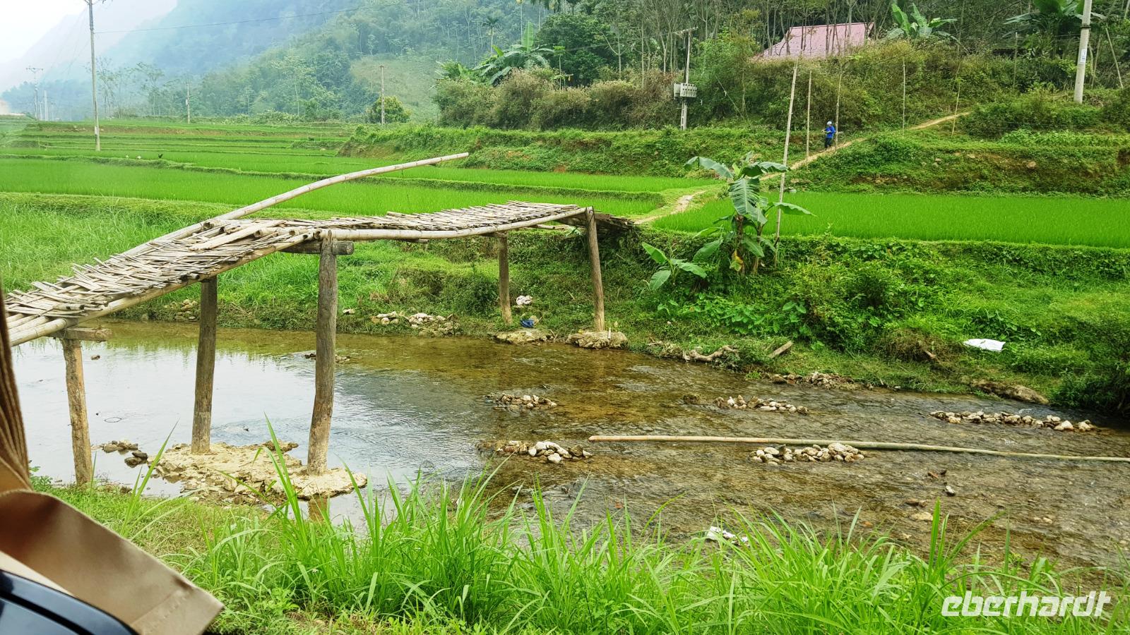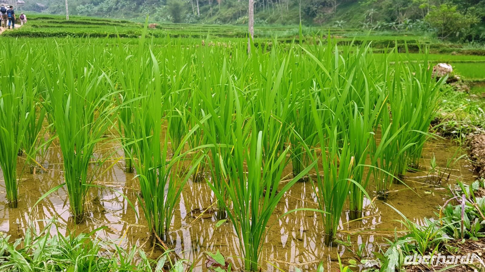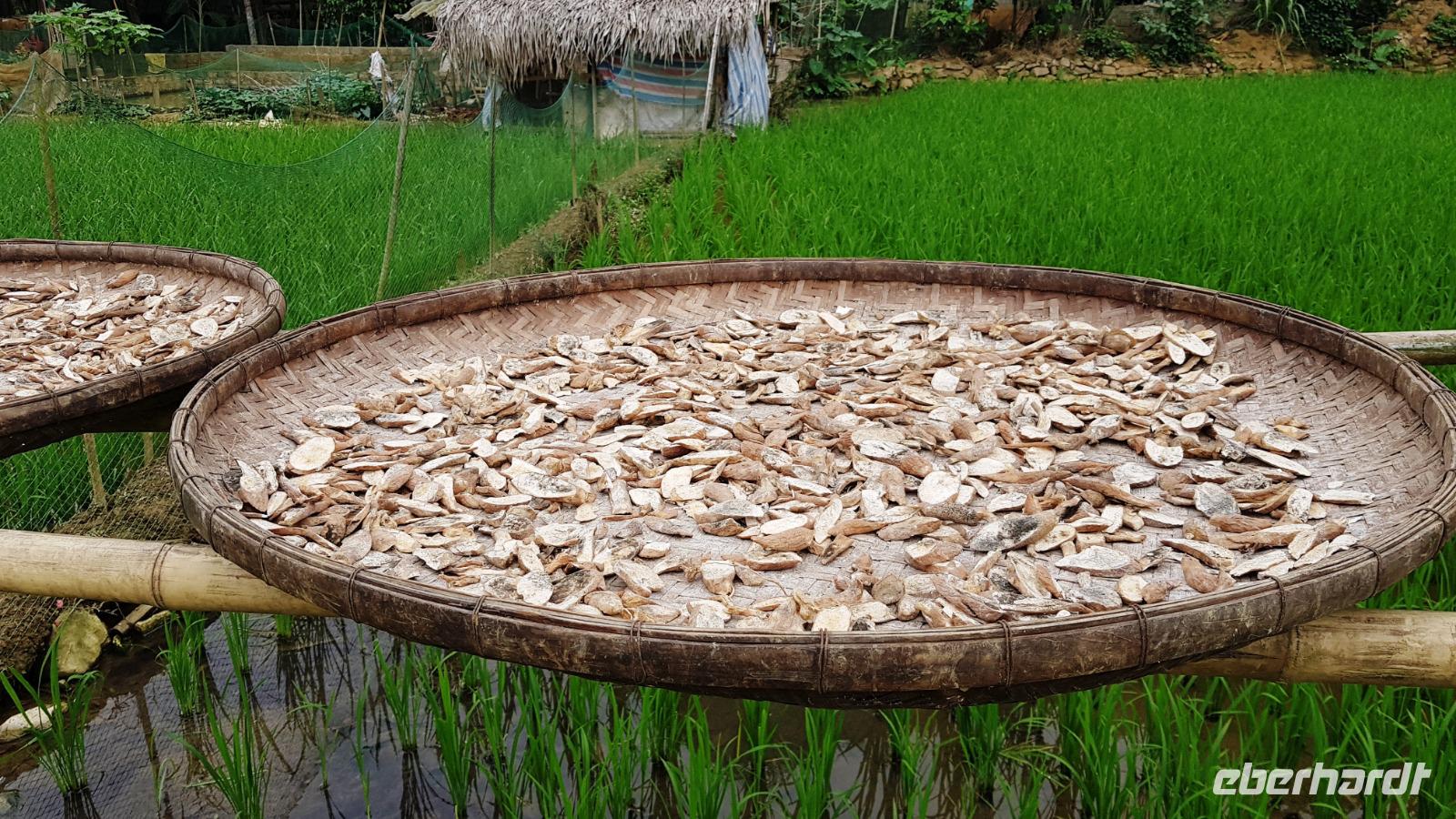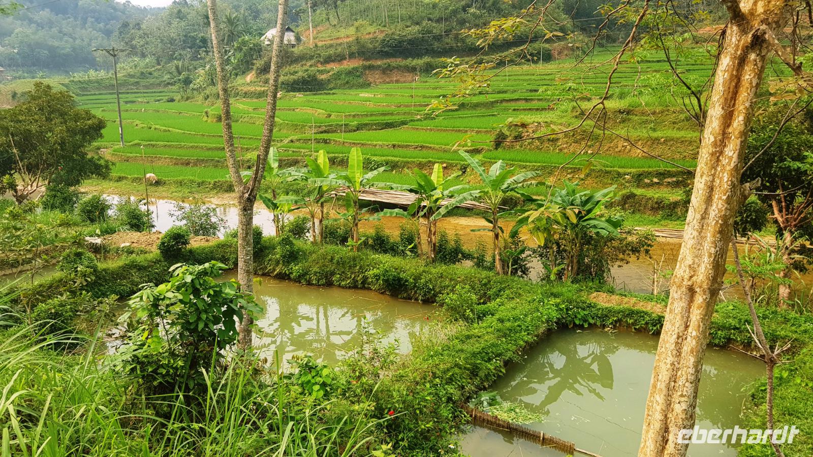 Nach dem Mittagessen hat unsere Wanderung angefangen. Die Temperatur war herrlich, es gab keine einzige Mücke. Wir sind lange durch die Reisfelder gegangen. Hier und da haben wir kleine Pausen gemacht, mit den Einheimischen gesprochen. Wir konnten sogar in eins von den Häusern hereinkommen. Die Familien, die in dieser Gegend von Vietnam wohnen haben ihr Wohnzimmer und Schlafzimmer im 1. Stock. Das Erdgeschoss ist offen, normalerweise für Tiere oder Sachen reserviert. Es gibt sehr wenig Möbel. Der gleiche Raum gilt als Esszimmer, Wohnzimmer und Schlafzimmer. Es gibt keine Fenster. Das heisst, es gibt schon Fenster, aber es gibt kein Fensterglas. Die Leute die da wohnen arbeiten normalerweise in den Feldern. 1-2 Mal pro Woche fahren sie in das nähe liegende Dorf mit ihren Mopeds.
