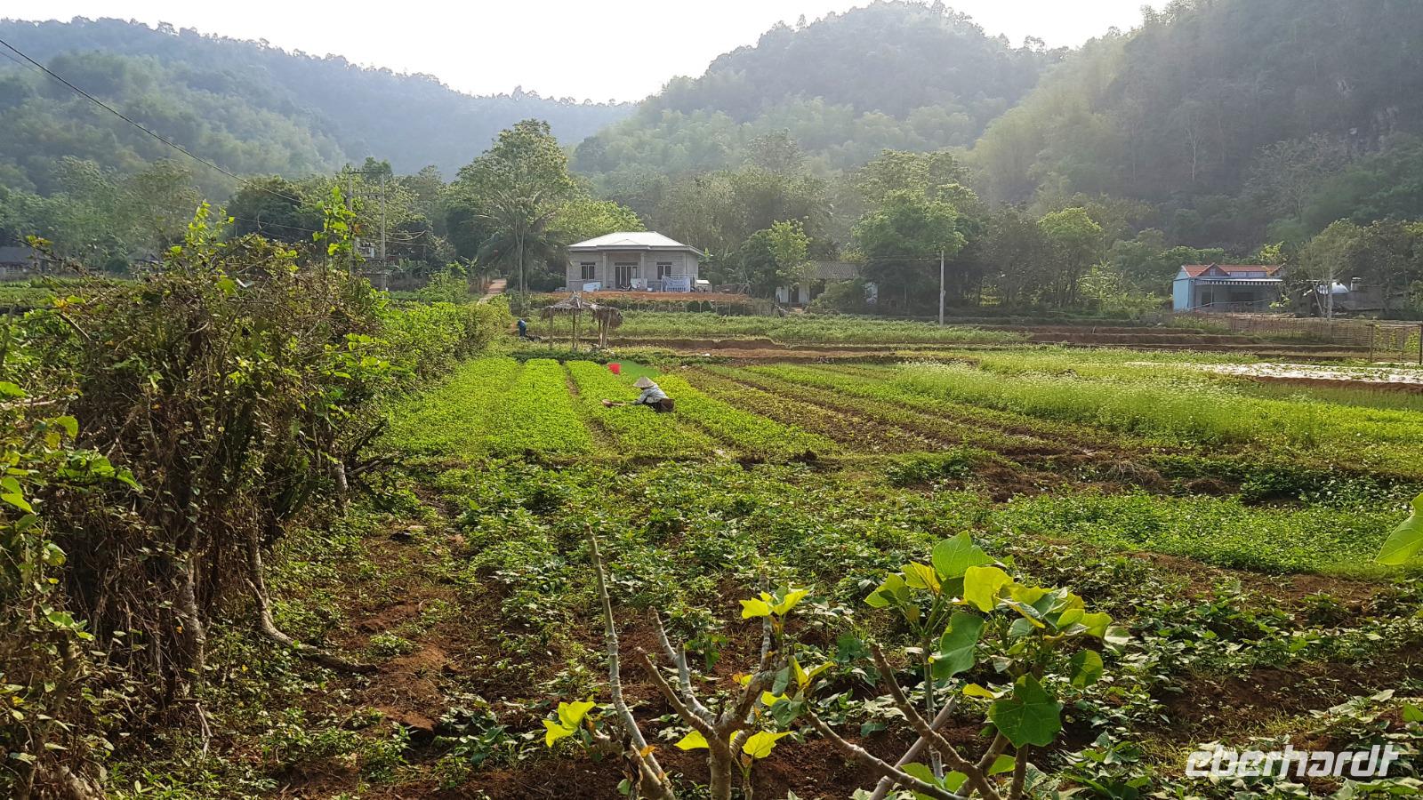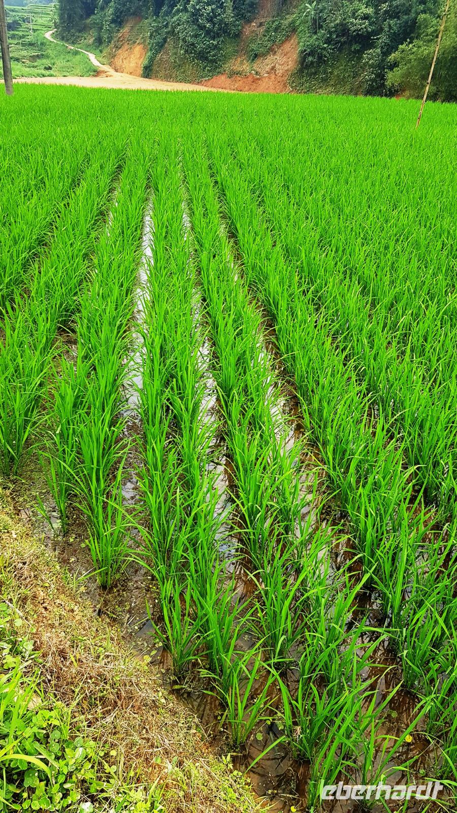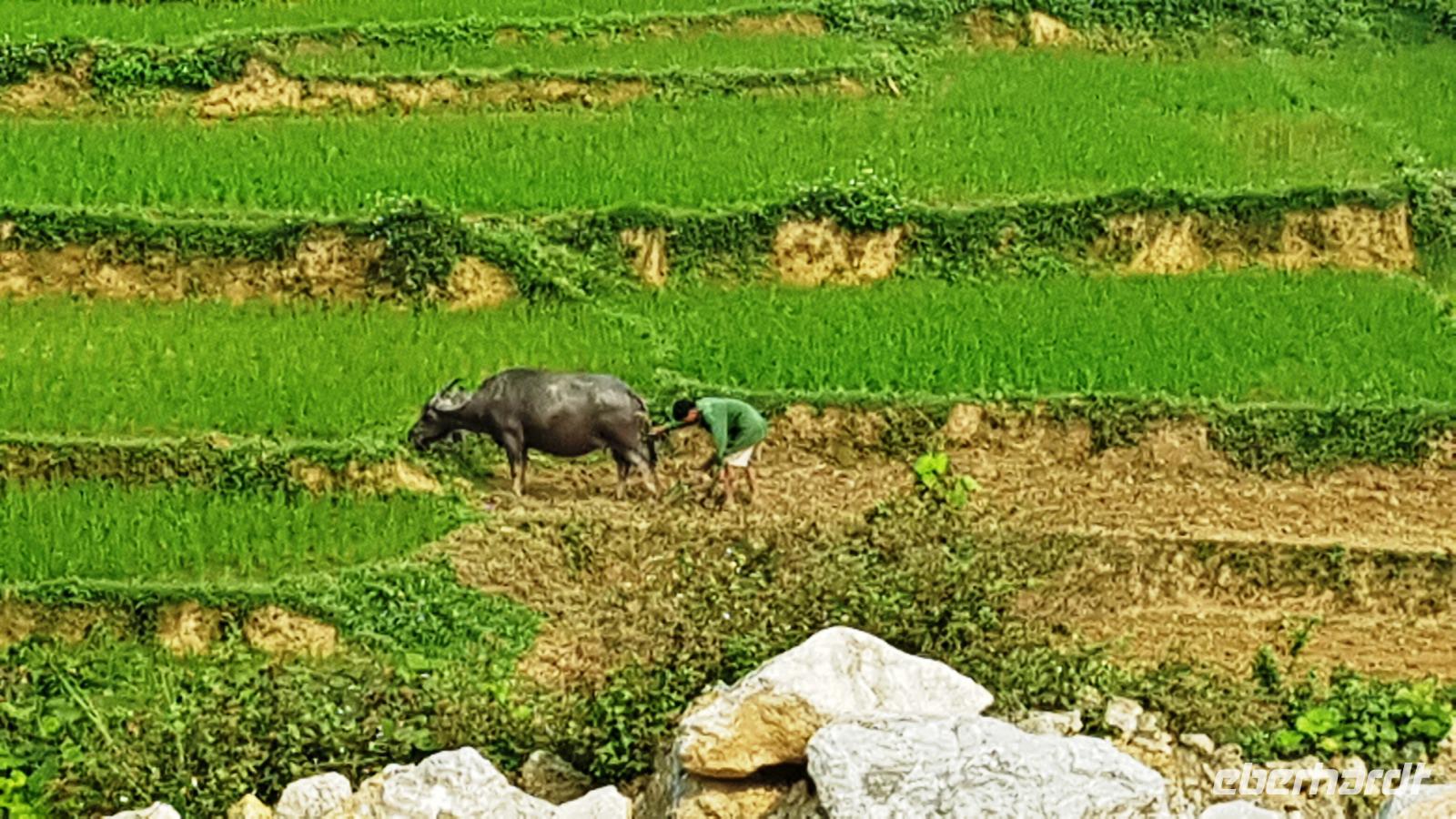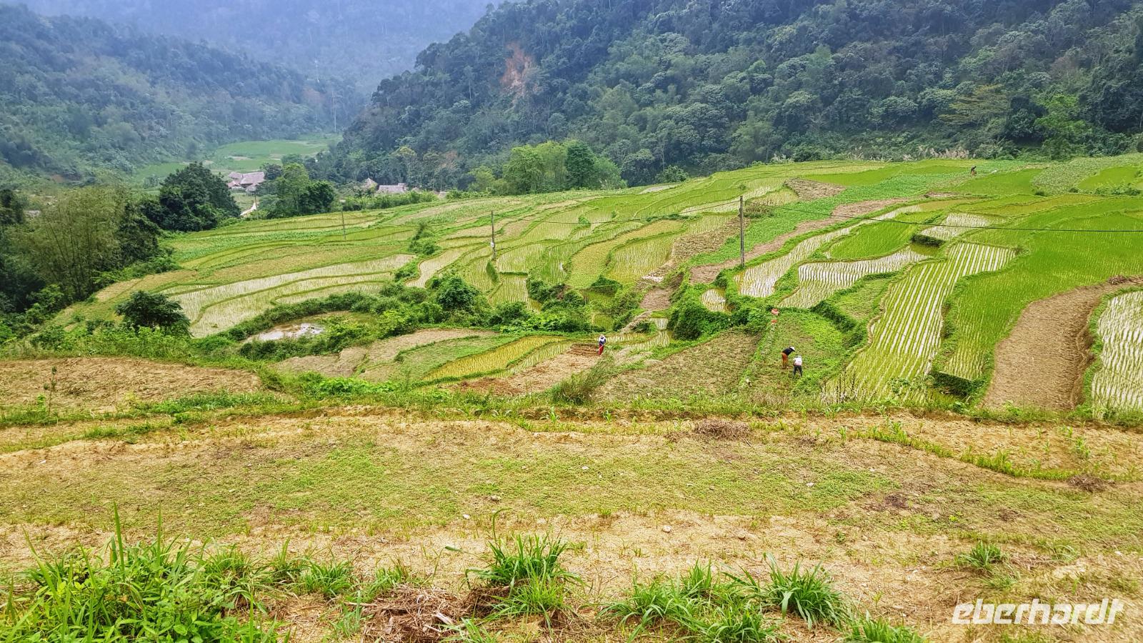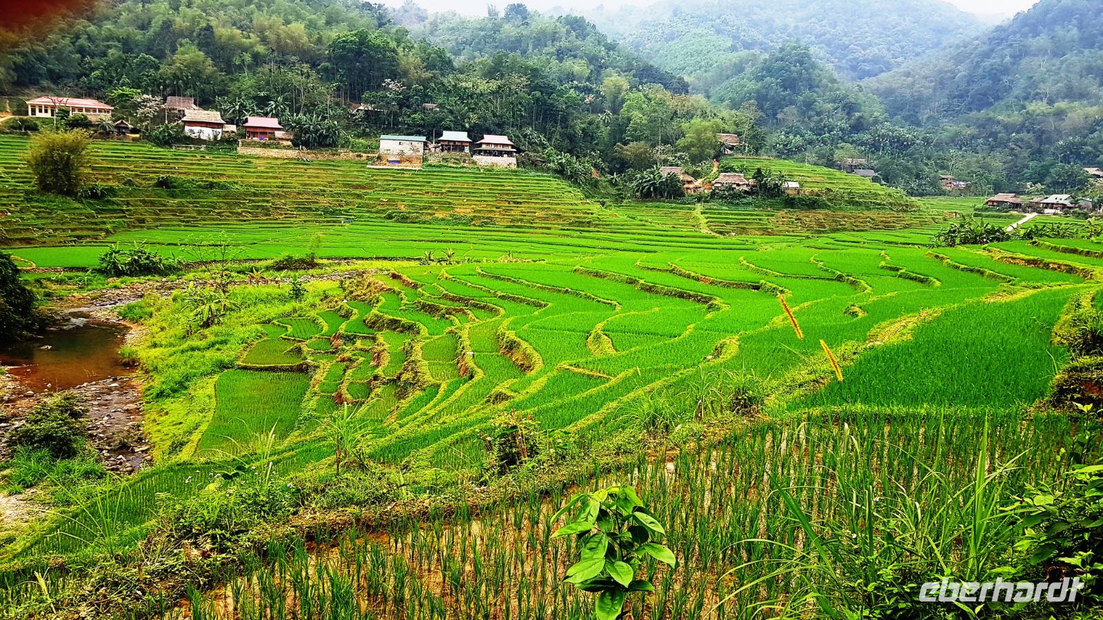 Nach dem Mittagessen hat unsere Wanderung angefangen. Die Temperatur war herrlich, es gab keine einzige Mücke. Wir sind lange durch die Reisfelder gegangen. Hier und da haben wir kleine Pausen gemacht, mit den Einheimischen gesprochen. Wir konnten sogar in eins von den Häusern hereinkommen. Die Familien, die in dieser Gegend von Vietnam wohnen haben ihr Wohnzimmer und Schlafzimmer im 1. Stock. Das Erdgeschoss ist offen, normalerweise für Tiere oder Sachen reserviert. Es gibt sehr wenig Möbel. Der gleiche Raum gilt als Esszimmer, Wohnzimmer und Schlafzimmer. Es gibt keine Fenster. Das heisst, es gibt schon Fenster, aber es gibt kein Fensterglas. Die Leute die da wohnen arbeiten normalerweise in den Feldern. 1-2 Mal pro Woche fahren sie in das nähe liegende Dorf mit ihren Mopeds.