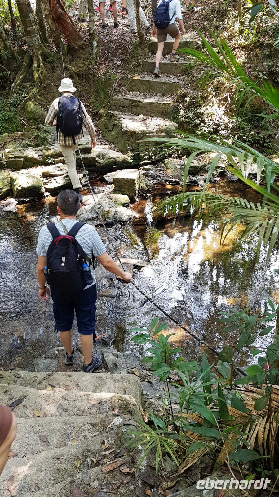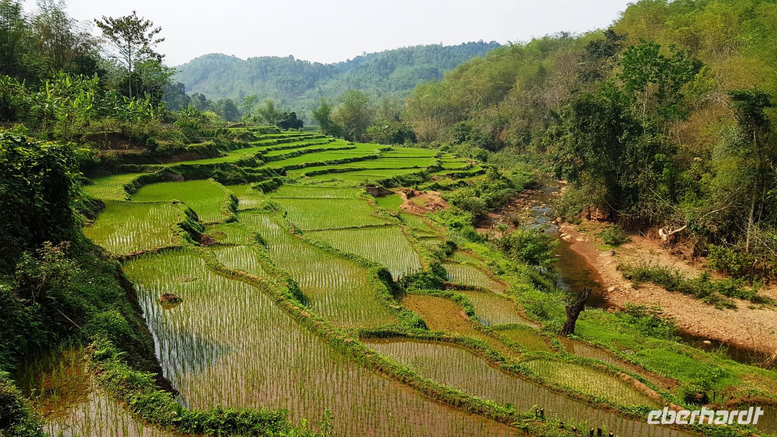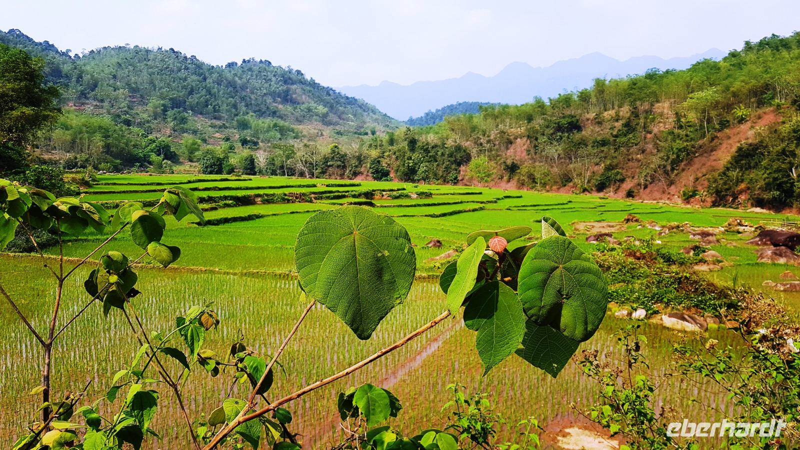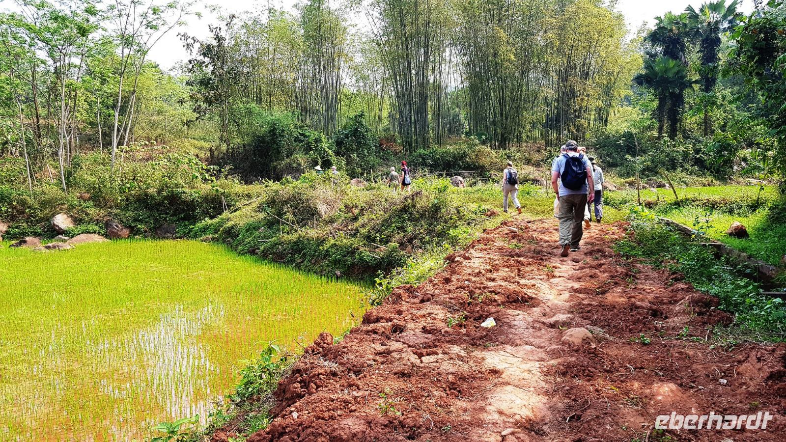 Noch nach ein paar Kilometer war unsere Wanderung zu Ende. Wir haben unseren Bus erreicht und sind weiter Richtung Wasserfall gefahren. Es war warm, wir waren durchgeschwitzt und müde. Am Wasserfall konnten wir uns erholen und sogar baden. Er war nicht gross, das Wasser war sauber und angenehm. Es wurde beschlossen, die Wanderung noch ein Stück fortzusetzen. Es war anstrengend, aber sehr schön. Wir sind den Panoramaweg mit dem Blick auf die Terrassenreisfelder gegangen. Im Herbst, wenn alle Felder unterschiedlich gelb sind, muss er noch schöner sein.