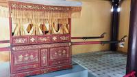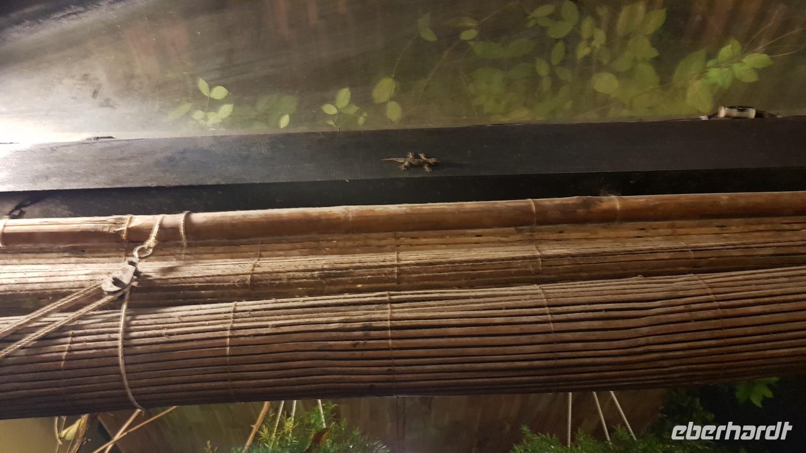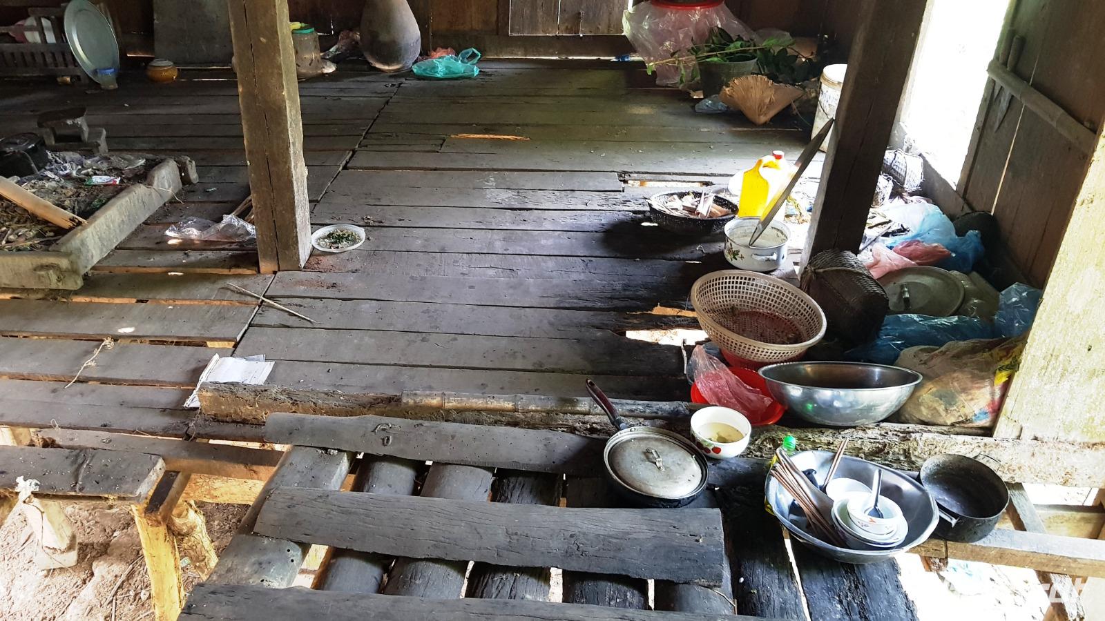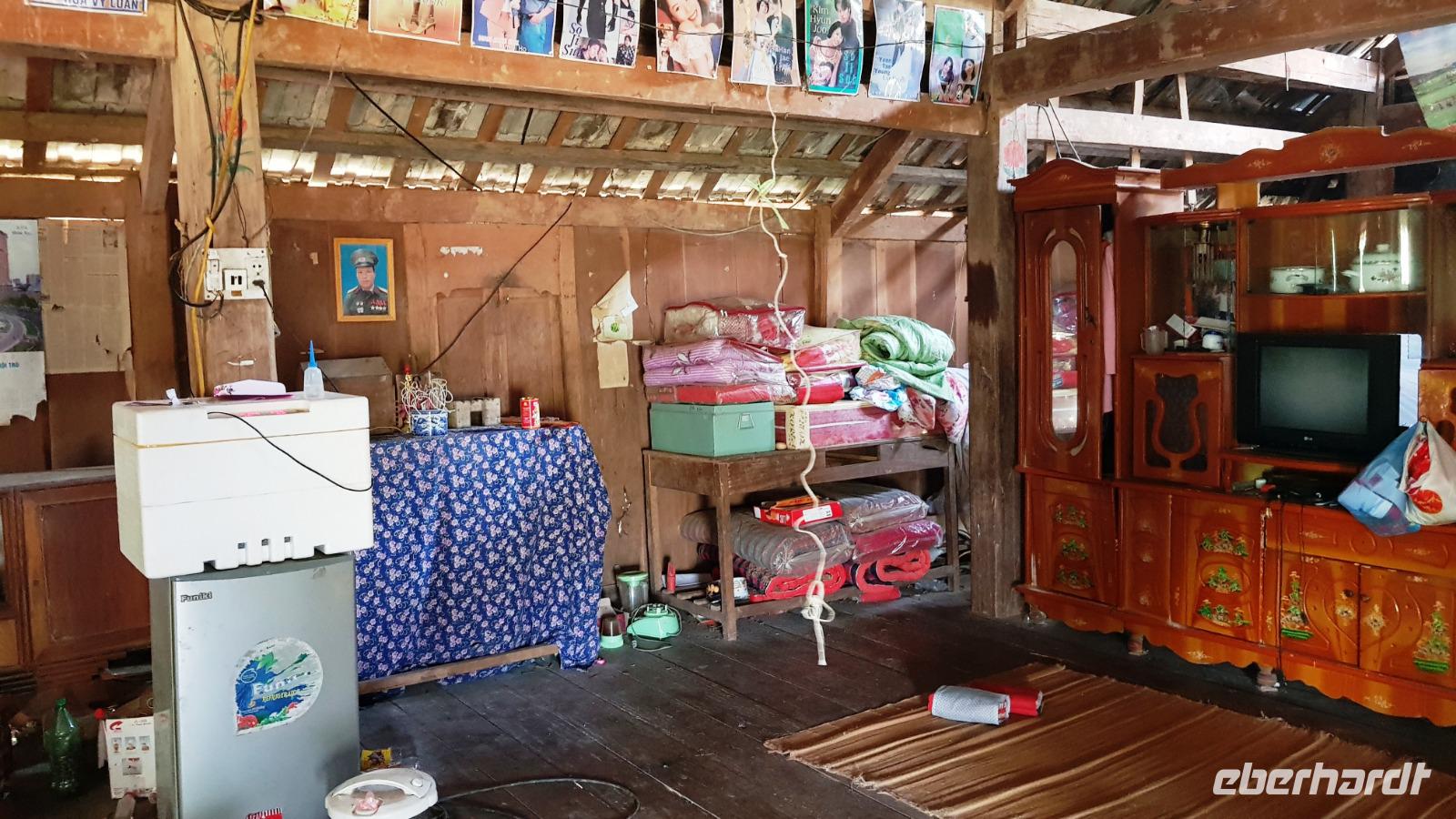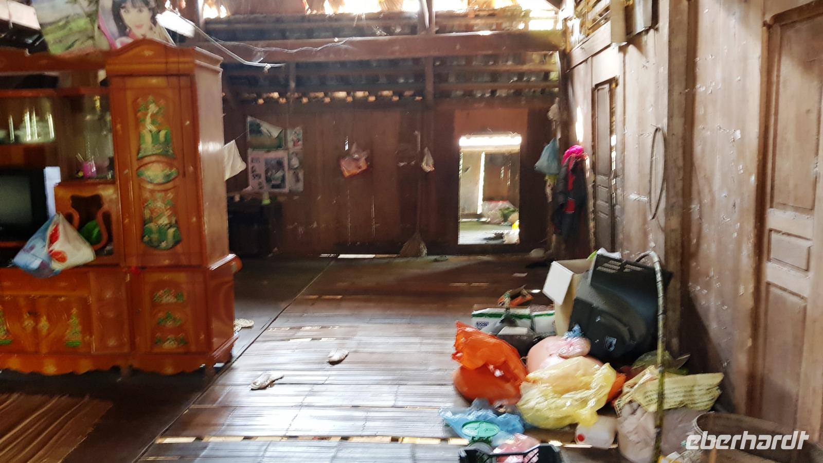 Das Essen war sehr lecker. Alles war in ein Bananenblatt sauber gepackt. Der Raum, wo wir gegessen haben, diente in der Nacht als Schlafzimmer und abends als Wohnzimmer. Das war auch im 1. Stock. Bevor man nach oben geht, musste man die Schuhe ausziehen. Besonders lecker war eine Frikadelle mit Zitronengras in der Mitte. Im Anschluss haben wir alle frischen grünen Tee bekommen.