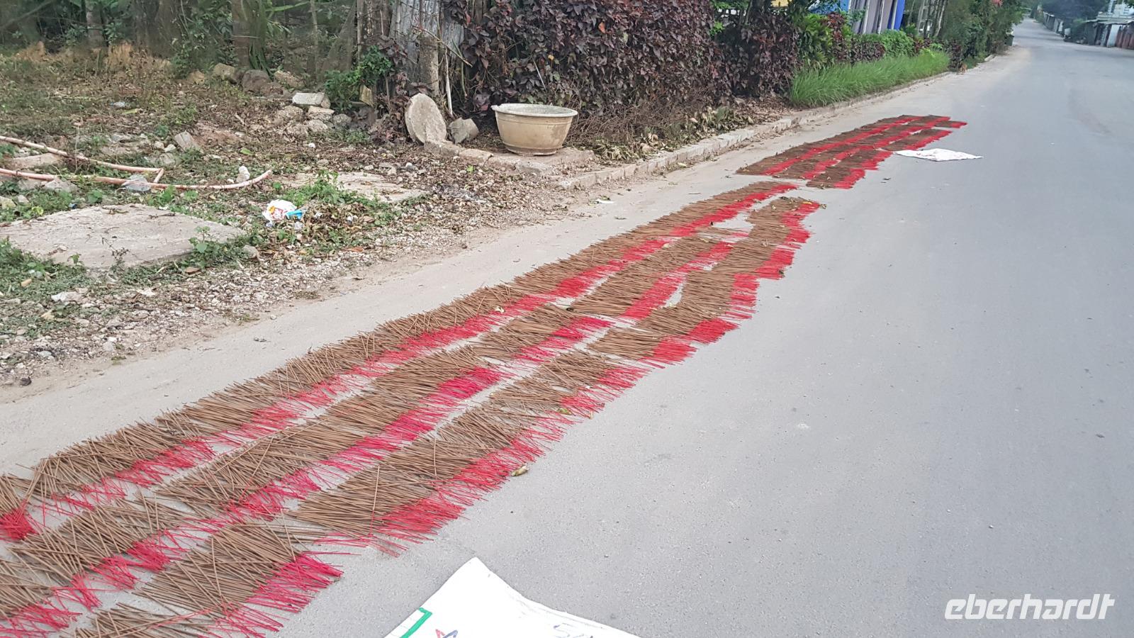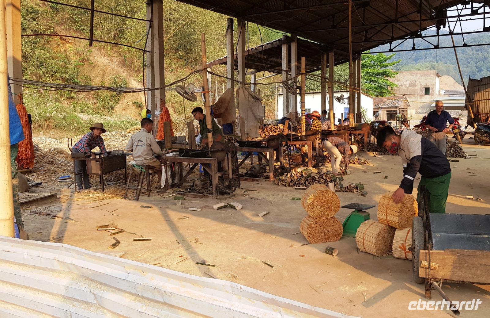 Als wir schon wieder bei dem Bus waren, haben wir einen kleinen Stopp bei einer Stäbchenfabrik gemacht. Sie befand sich am Flussufer. Es war erstaunlich zu sehen, wie schnell ein paar Stäbchen gemacht werden kann.