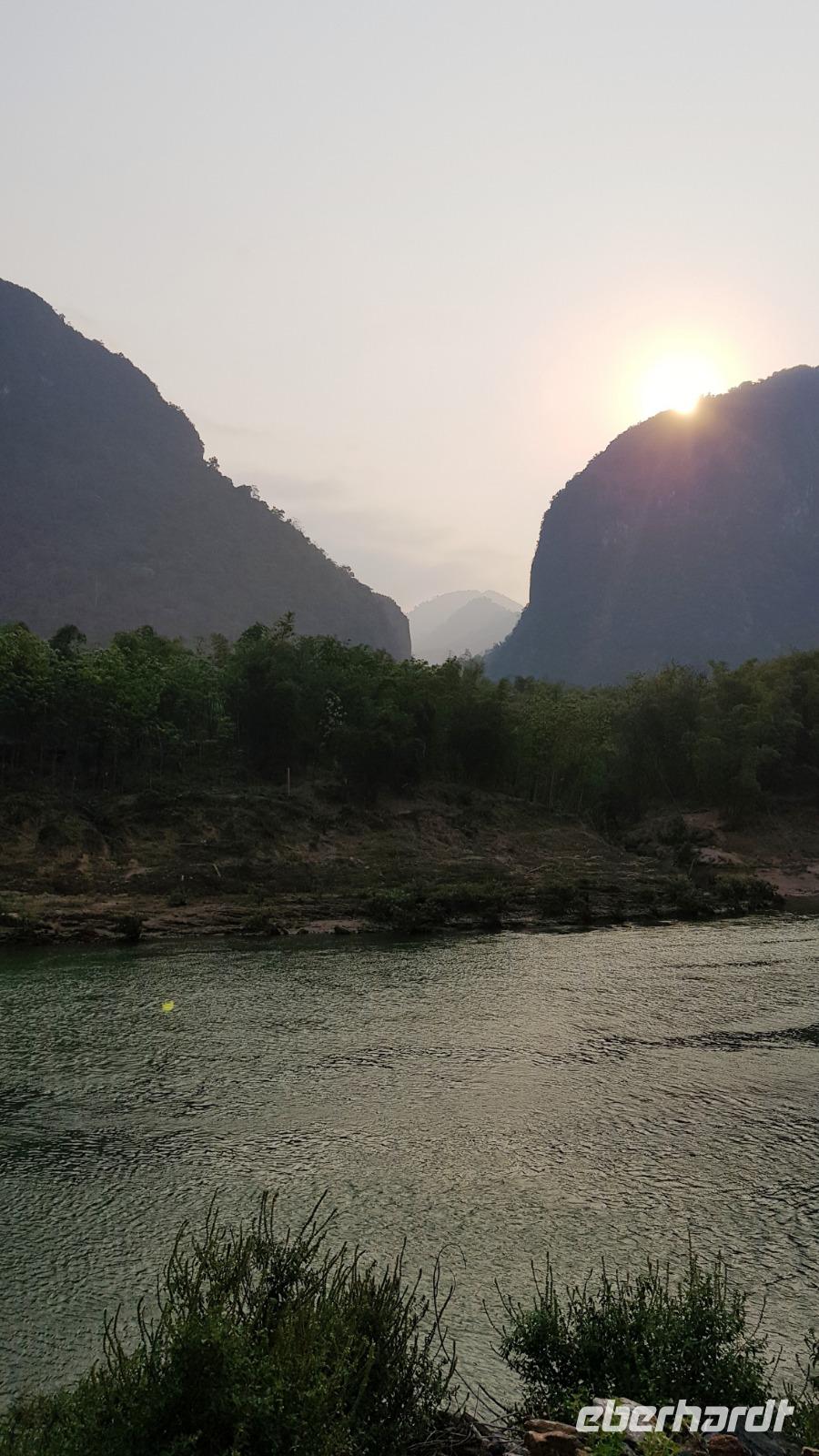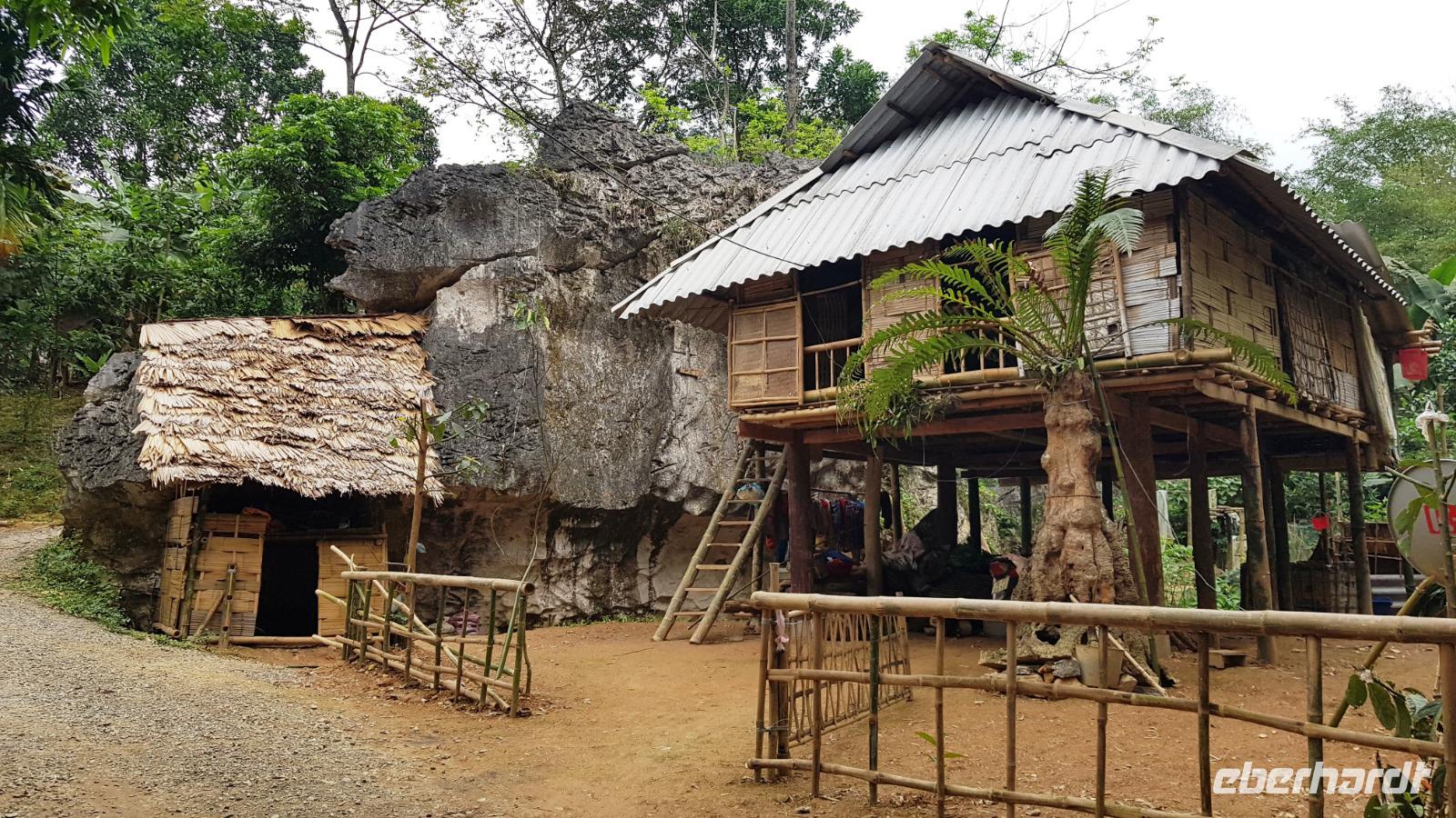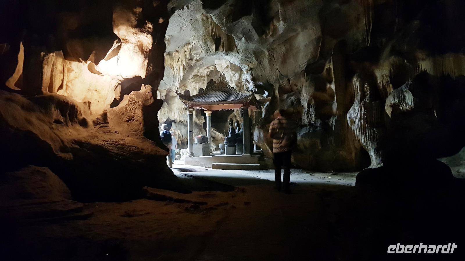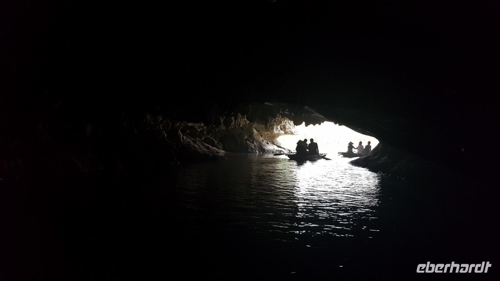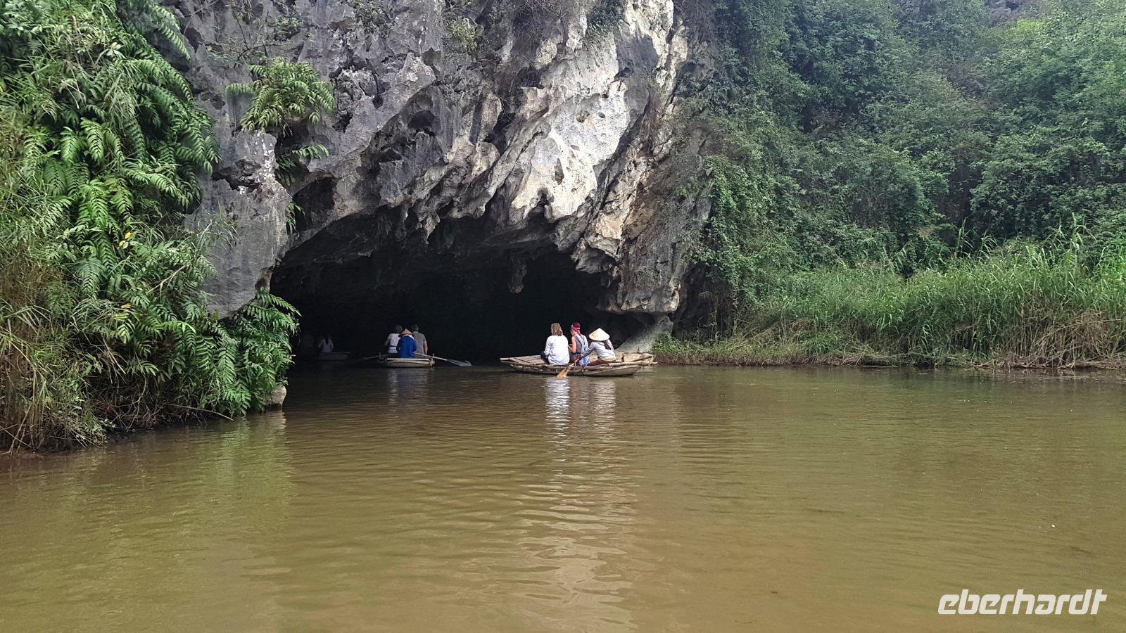 In dieser Gegend gibt es viele Kalksteinhöllen. Um eine davon zu sehen, sind wir mit den kleinen Booten gefahren. Auf einem Boot passen 2 Menschen. Wenn man Glück hat, kann man auf den Felsen die Gibbons sehen, eine Affenart von Südostasien.