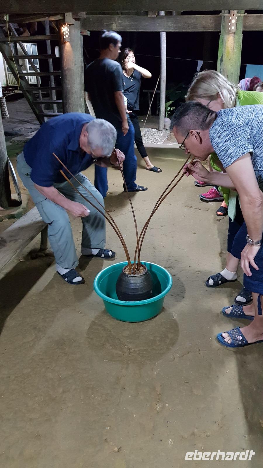 Nach dem Abendbrot hat uns die Familie mit dem Reiswein überrascht. Er wurde in einem grossen Topf gebracht. Jeder sollte aus einem Bambusrohr trinken. Dann wurde wieder Wasser in den Topf eingegossen.