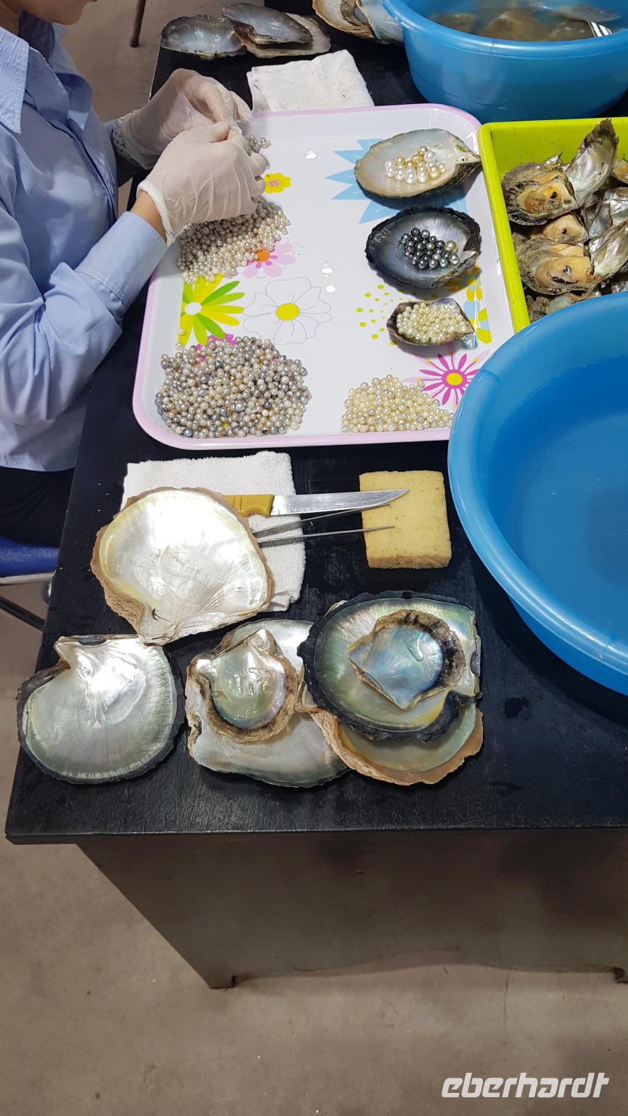 Dieser Tag hat mit dem Besuch der Perlenfabrik angefangen. Wir wussten wenig über Perlen und es war interessant, diese zu sehen und zu erfahren, wie sie gemacht werden. Es gibt weisse, gelbe und schwarze Perlen, je nachdem, in welcher Muschel sie wachsen.