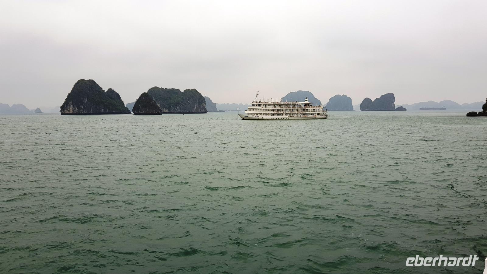 Der Tag war wieder bewölkt. Es hat uns aber nicht gestört, Tai-Chi Klasse am Sonnendeck zu geniessen. Nach dem kleinen Frühstück fast alle haben sich fertig gemacht, um mit dem kleinen Boot zu der Karsthöhle zu fahren. Das war eine der trockenen Höhlen, sie liegt über dem Meeresspiegel. Die Höhle ist ziemlich gross, die Touristen von mehreren Dschunken konnten gleichzeitig hereinkommen. Es gab viele Stalaktite und Stalagmite von verschiedenen Formen. In der Region von Ha Long Bucht gibt es viele von solchen Höhlen. Es gibt auch die, wo man nur mit dem Kajak ankommen kann.