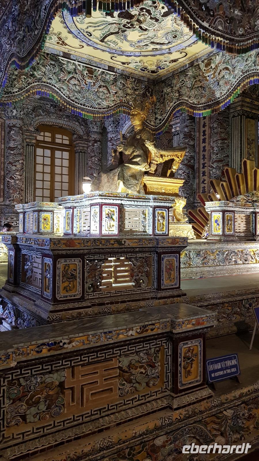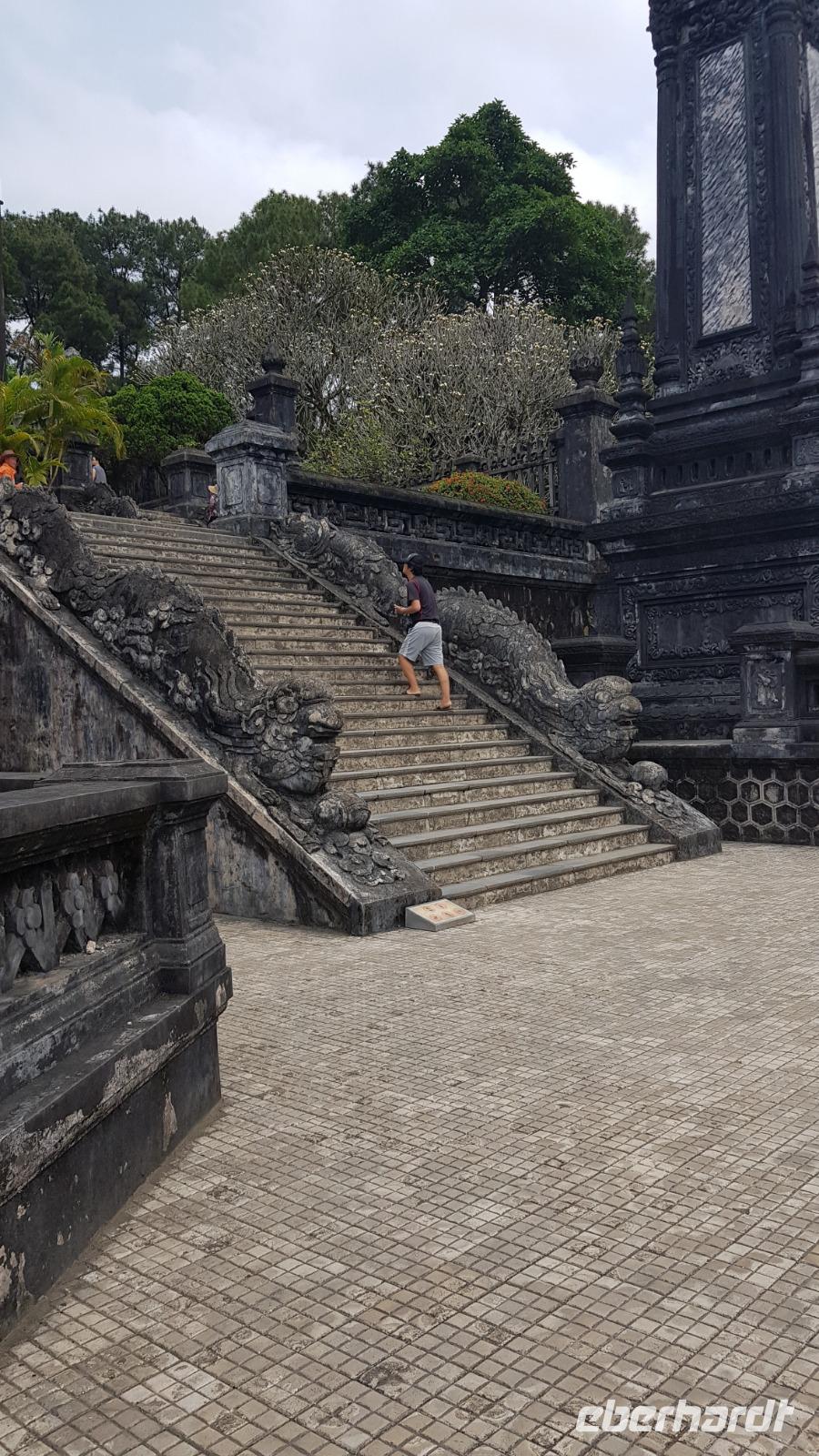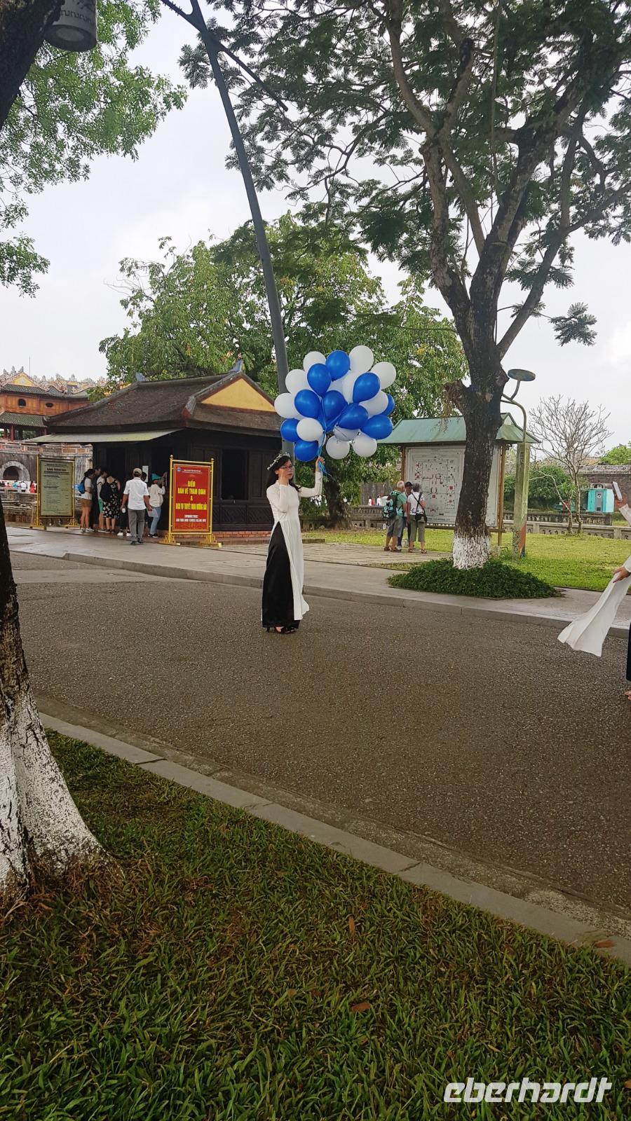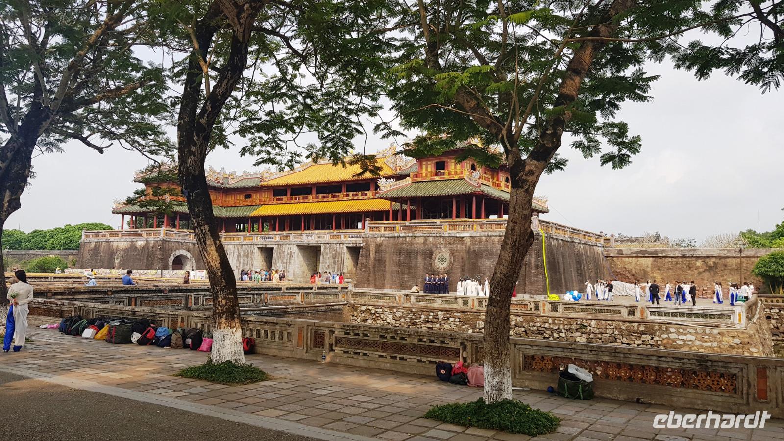 An diesem Tag früh sind wir mit unserem Guide zu der Kaiserstadt und Zitadelle von Hue gefahren. Sie befinden sich am anderen Ufer des Parfümflusses. Hier war die Residenz der Kaiser von Vietnam. Früher hiess diese Gegend eine verbotene Stadt, weil das Betreten für Nichtmitglieder der kaiserlichen Familie verboten war. Jetzt darf jeder Tourist dorthin, das ist ein grosses Museum.