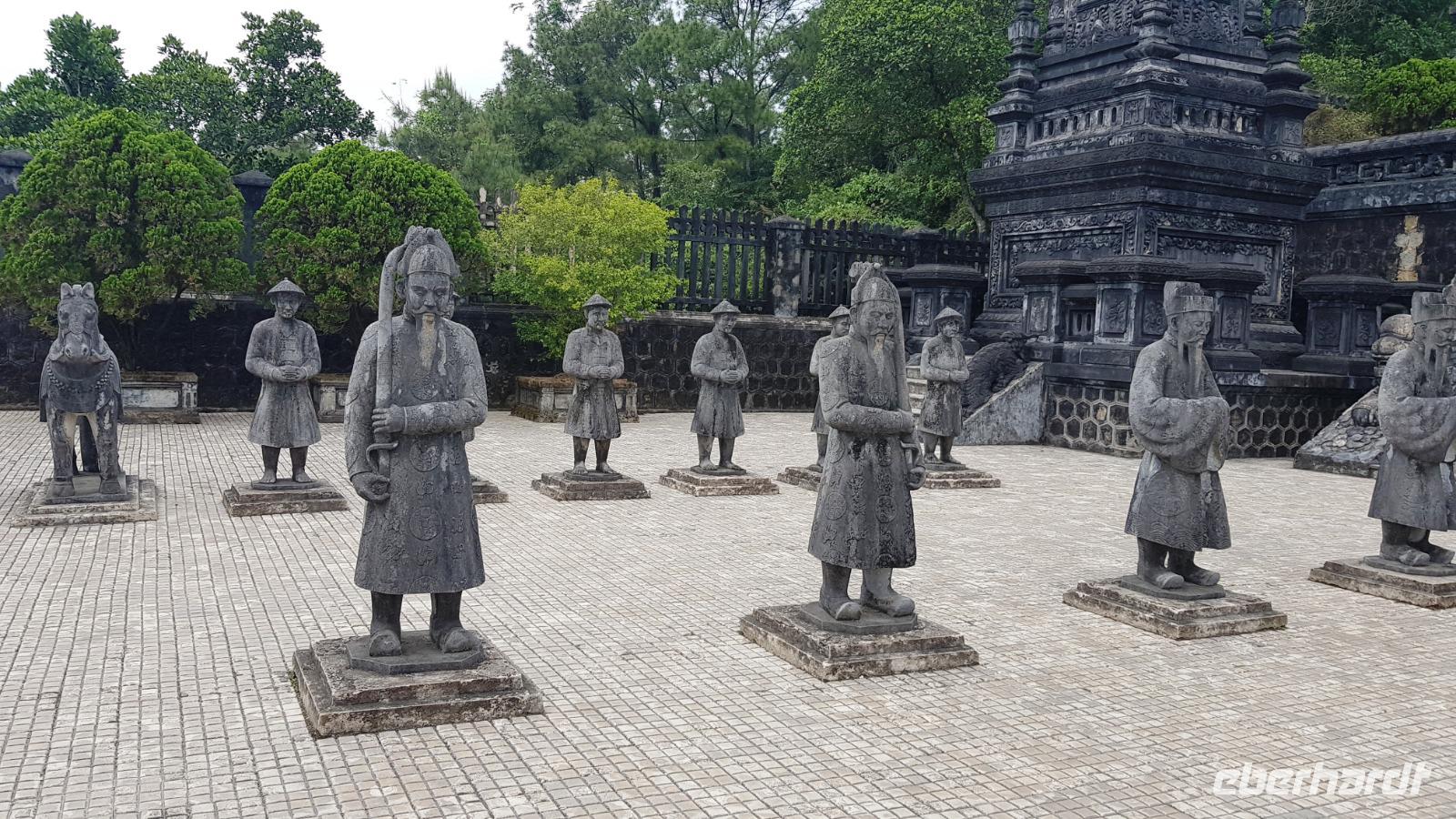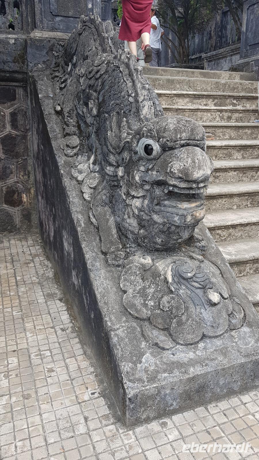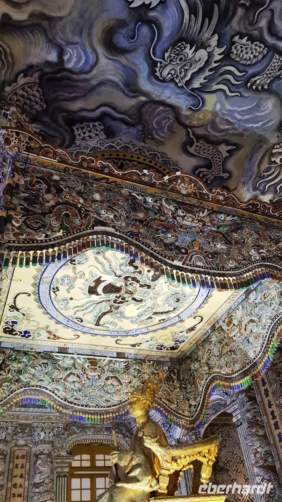 An diesem Tag früh sind wir mit unserem Guide zu der Kaiserstadt und Zitadelle von Hue gefahren. Sie befinden sich am anderen Ufer des Parfümflusses. Hier war die Residenz der Kaiser von Vietnam. Früher hiess diese Gegend eine verbotene Stadt, weil das Betreten für Nichtmitglieder der kaiserlichen Familie verboten war. Jetzt darf jeder Tourist dorthin, das ist ein grosses Museum.