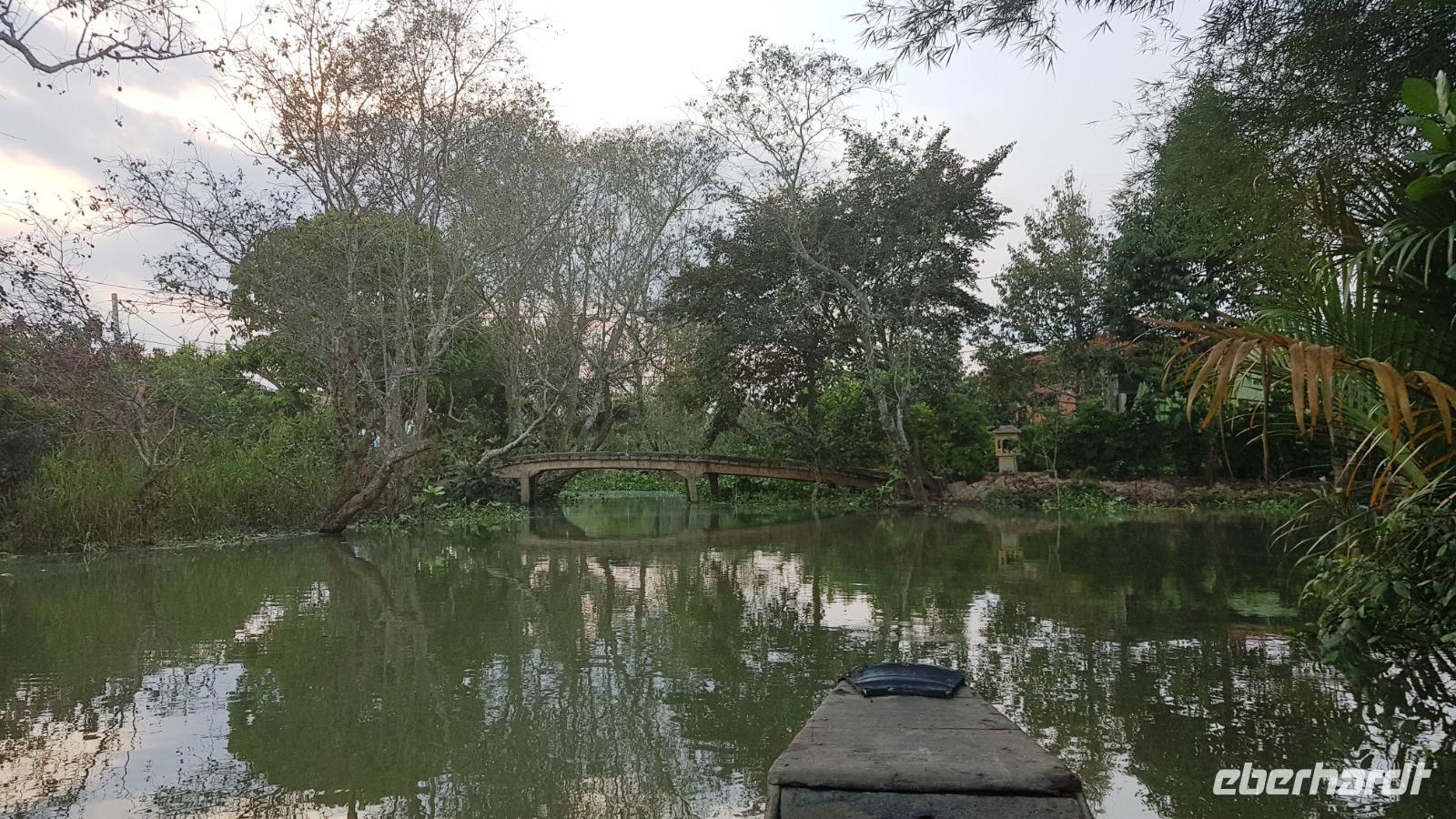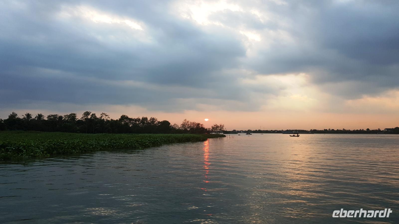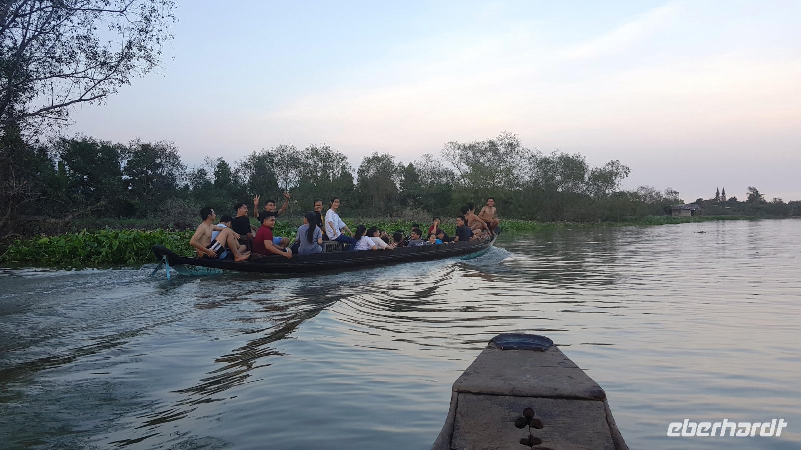 Zuerst waren wir mit dem grossen Boot unterwegs, wo uns das Mittagessen serviert wurde. Es gab viele neue Früchte die wir früher nicht gekostet haben. Nach dem Mittagessen haben wir das Boot verlassen und haben eine kleine Fahrradtour gemacht. Die Strasse war sehr eng, es waren auch einige Mopeds unterwegs. Es war ganz anders als in Europa. Wir haben viele Einheimische gesehen. In einem Haus wurde uns traditionelles Reisbrot und süsser Kuchen angeboten. Alles war sehr lecker. Nachmittags waren wir mit kleinen Booten in einem von den engen Kanälen unterwegs. Jedes Haus hat ein Boot, viele Leute wohnen sehr nah am Wasser. Als wir wieder zu dem Hauptfluss angekommen sind, konnten wir den Sonnenuntergang geniessen.