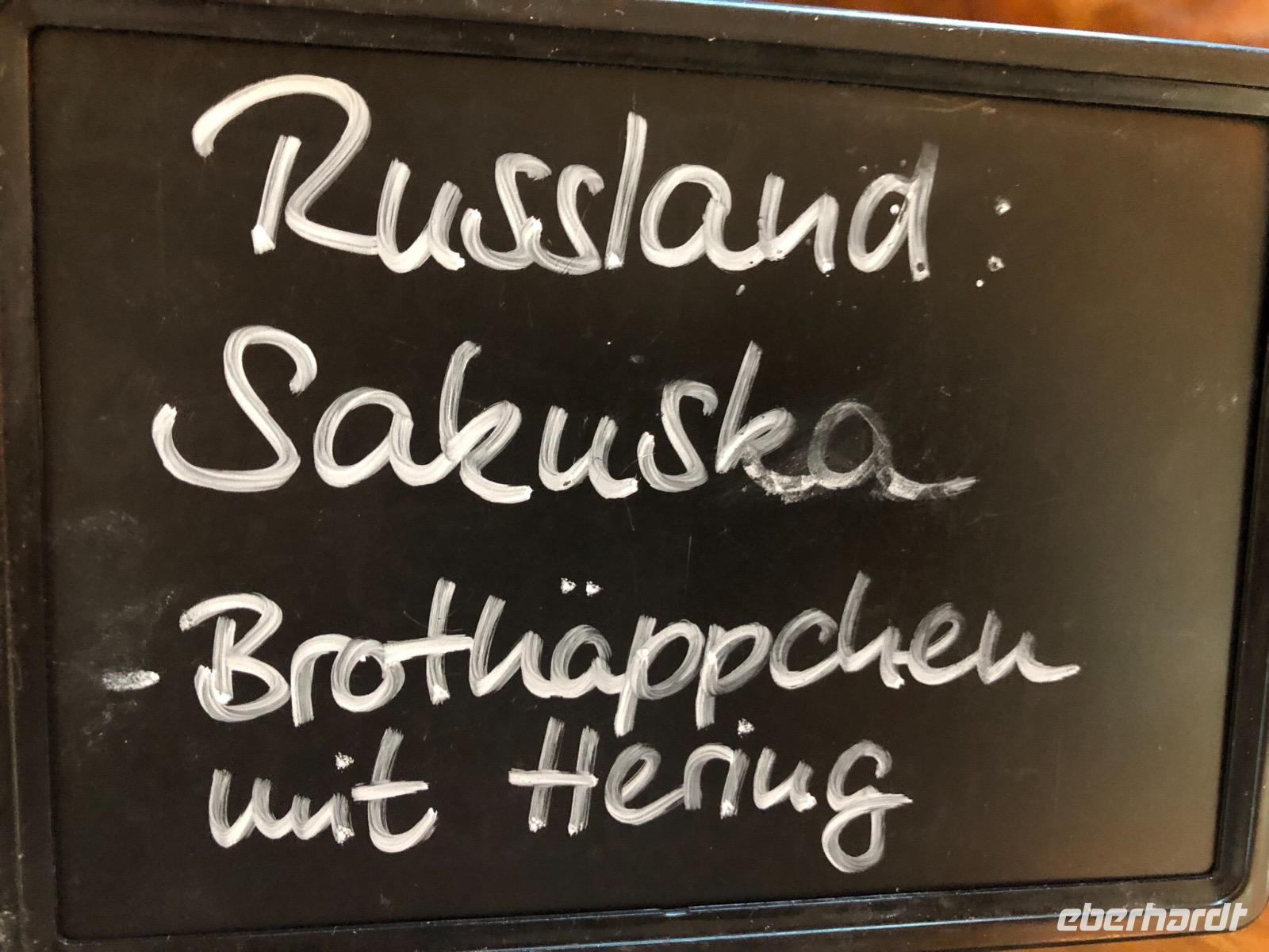 Anekdote: nachdem wir die russischen Namen der Getränke vergesssen haben, beschließen wir einen Kapuska zu bestellen, in der Annahme, es wäre das was wir suchen. Vorher fragen wir noch, ob Kapuska warm oder kalt ist. Natürlich kalt, sagt die verwunderte Verkäuferin und bringt uns zwei Krautsalat. Auf unsere verdutzten Gesichter hin, nimmt sie diese glücklicherweise zurück und zählt uns in atemberaubender Geschwindigkeit ihr Getränkeangebot auf, in dem wir dann auch das entdecken, was wir wollen: Kwas.