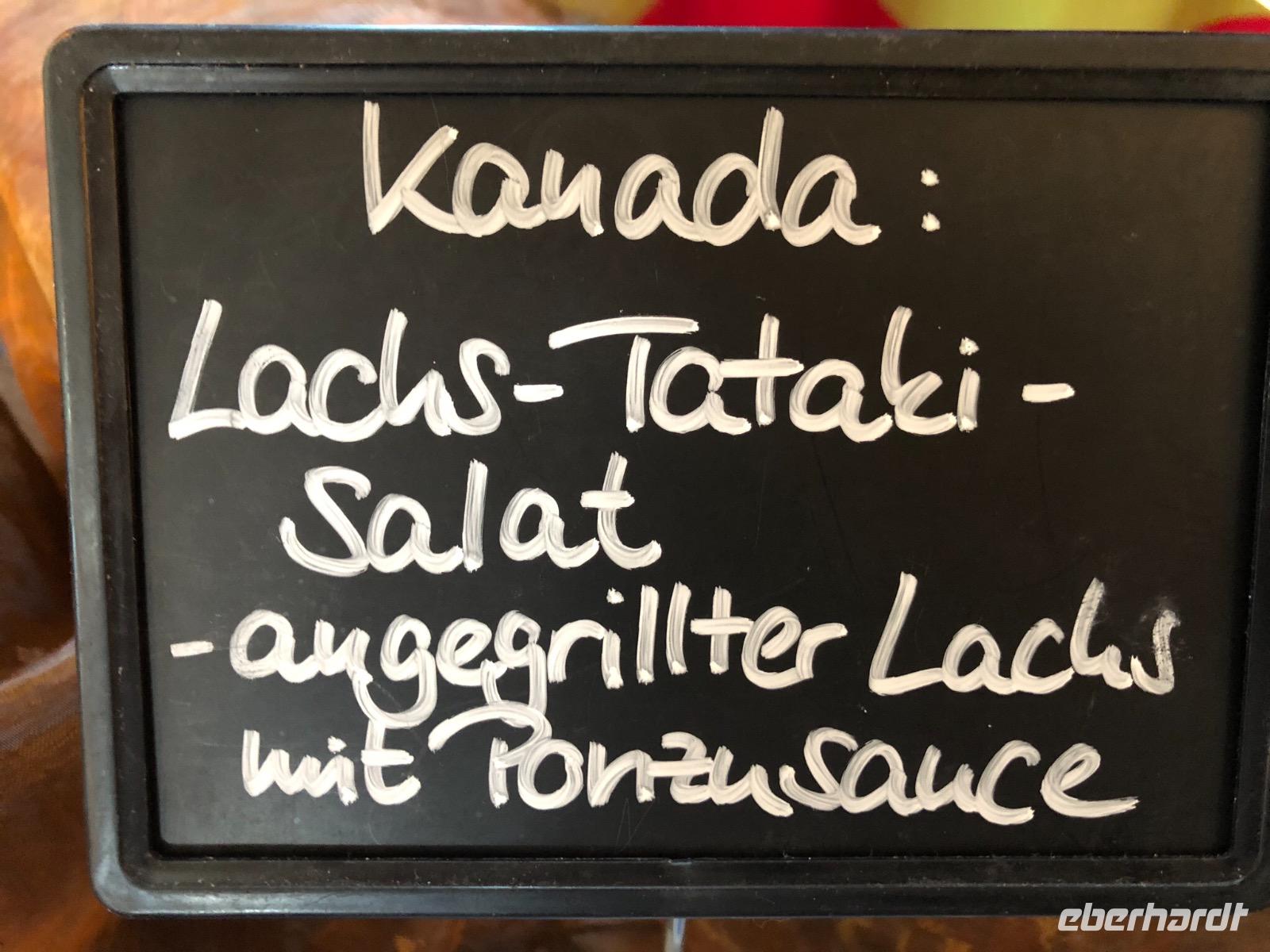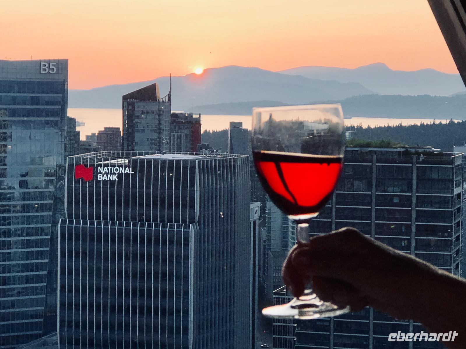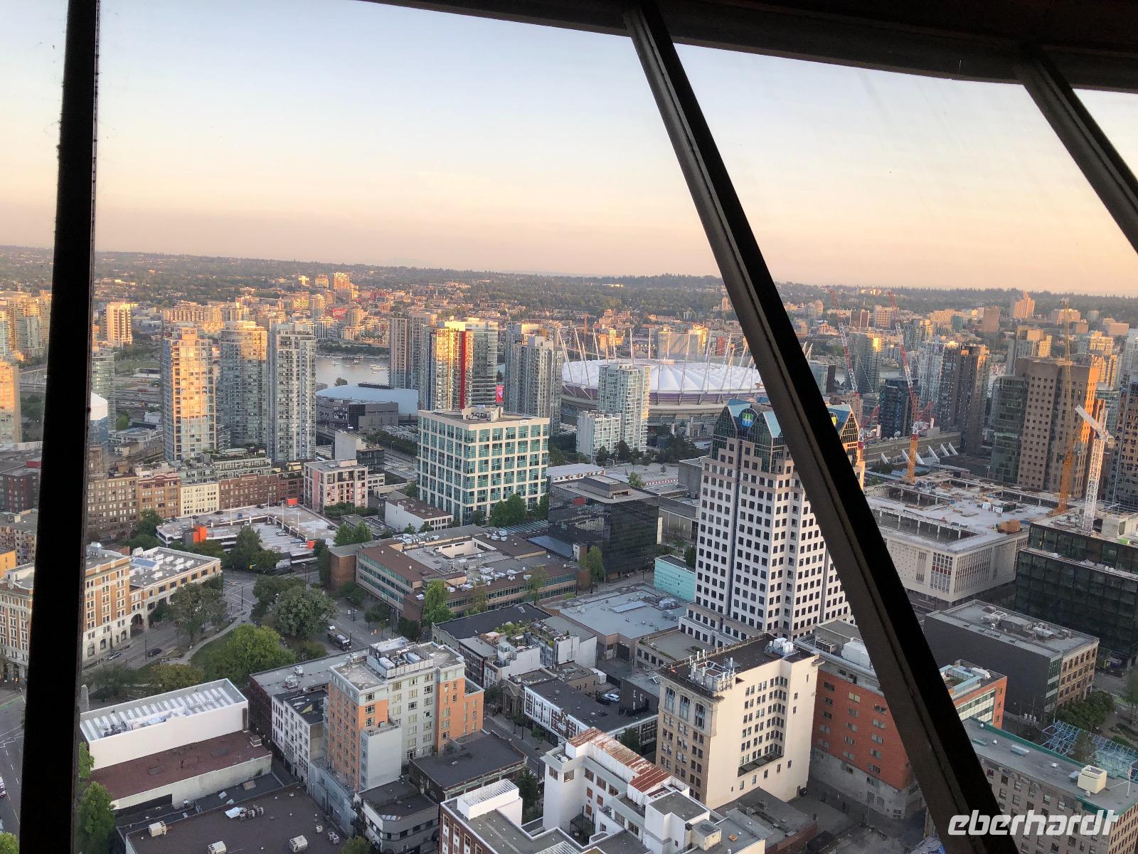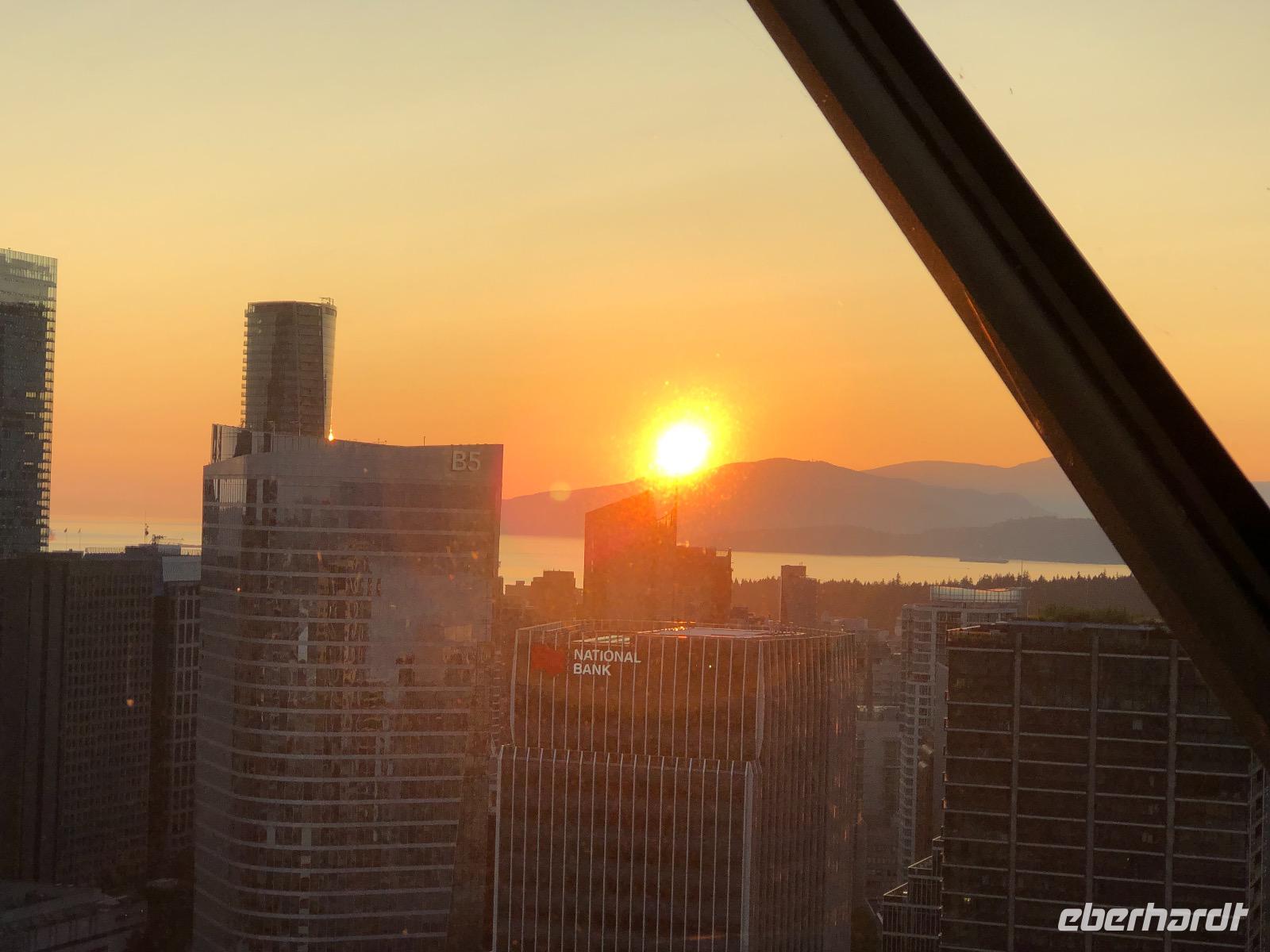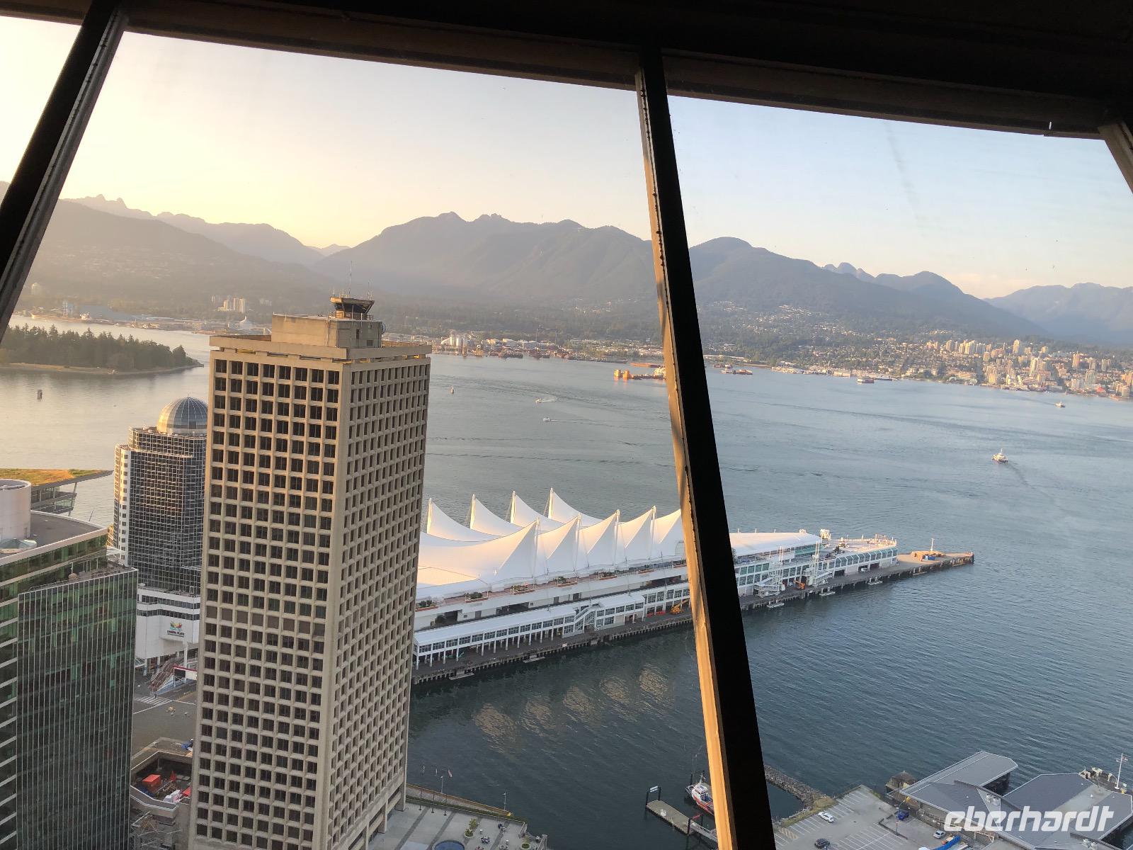 Gegen zwölf Uhr kommen wir planmäßig in Vancouver an. Der Flug mit Japan Airlines war recht angenehm. Die Sitzanstände komfortabel, im Video Filme in deutscher Sprache. So sind neun Stunden Flug zwar lang, aber mit ein bisschen Schlaf erträglich. Außer uns kommen noch viele weitere Fluggäste in Vancouver an. Die Einreiseprozedur nimmt fast zwei Stunden in Anspruch, die meiste Zeit geht fürs Schlange stehen drauf. In selbsterklärenden Computern müssen wir unsere Daten zur Zollerklärung eingeben, dann Passkontrolle und nochmal Zoll, außerdem die Anzeige eines beschädigten Koffers und es ist geschafft. Anja erwartet uns am Ausgang und wir fahren nach Granville Island ins Doc Side Restaurant. Hier gibt es ein Begrüßungsmittagessen, Lachs mit grünen Bohnen. Anschließend unternehmen wir einen Spaziergang am Ufer des False Creek entlang. Hier gibt es schwimmende Häuser und eine belebte Markthalle zu besichtigen. Wir fahren zurück aufs Festland, durch die Altstadt von Vancouver, entlang von Gastown und der berühmten Dampfuhr. Abschließend geht es in den Stanleypark, zu den berühmten Totempfählen und der Lionsbrücke. Nun ist es Zeit, im Hotel einzuchecken und obwohl uns immer wieder die Augen zufallen wollen, raffen wir uns auf und fahren noch (mit von Eberhardttravel spendierten Taxis) zum Aussichtsturm. Nach einer abenteuerlichen Fahrt mit dem Fahrstuhl Keller - Erdgeschoss - Keller - Erdgeschoss, schaffen wir es irgendwann tatsächlich bis zum Restaurant. Sogleich bekommen wir unsere reservierten Tische und haben eine phantastische Aussicht auf die Stadt. Das Restaurant dreht sich und in einer Stunde sind wir einmal rundum gefahren. Genau zu dieser Zeit geht die Sonne unter und taucht die Stadt in ein goldenes Licht. So können wir zusätzlich einen Blick auf das nächtliche Vancouver werfen.