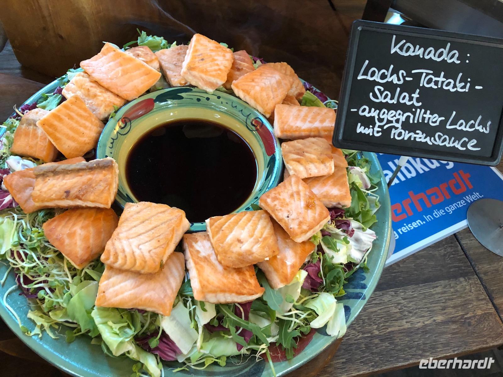Zum Abendessen gibt es heute gebratenen Lachs aus der lappländischen Küche, vorher Gemüsesuppe und gemischten grünen Salat und als Nachspeise köstlichen Beerenkuchen.