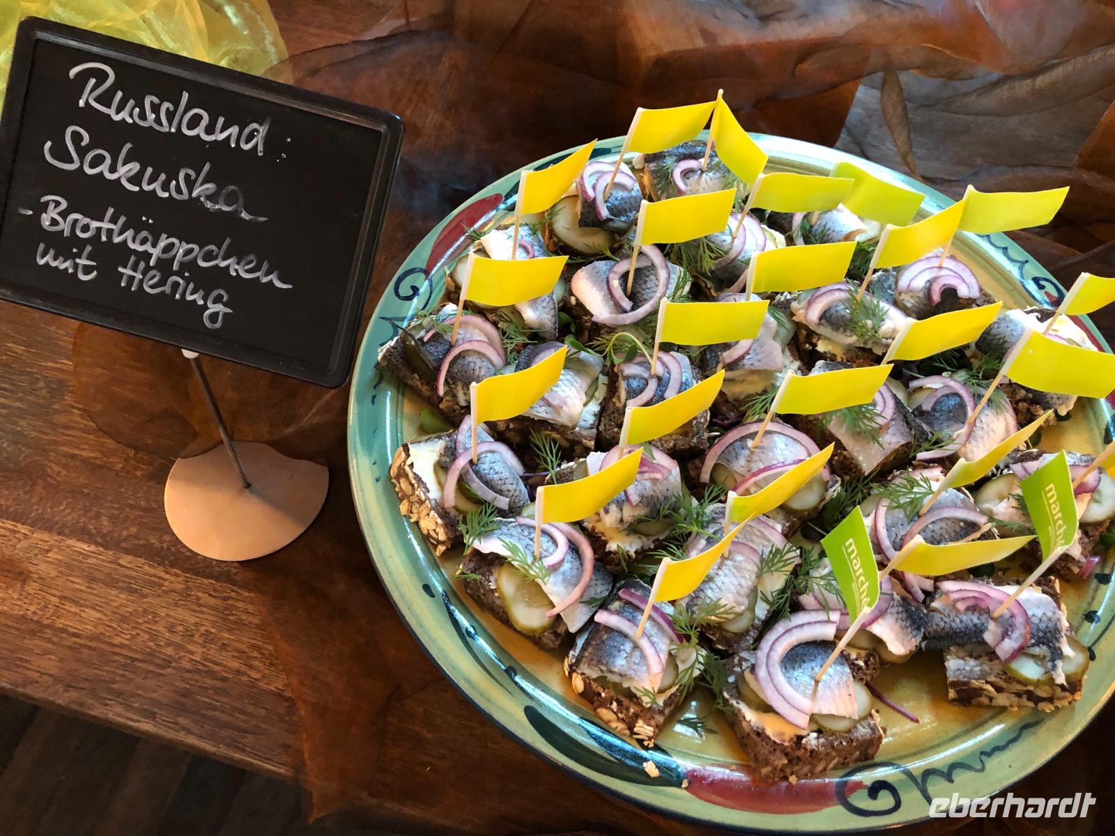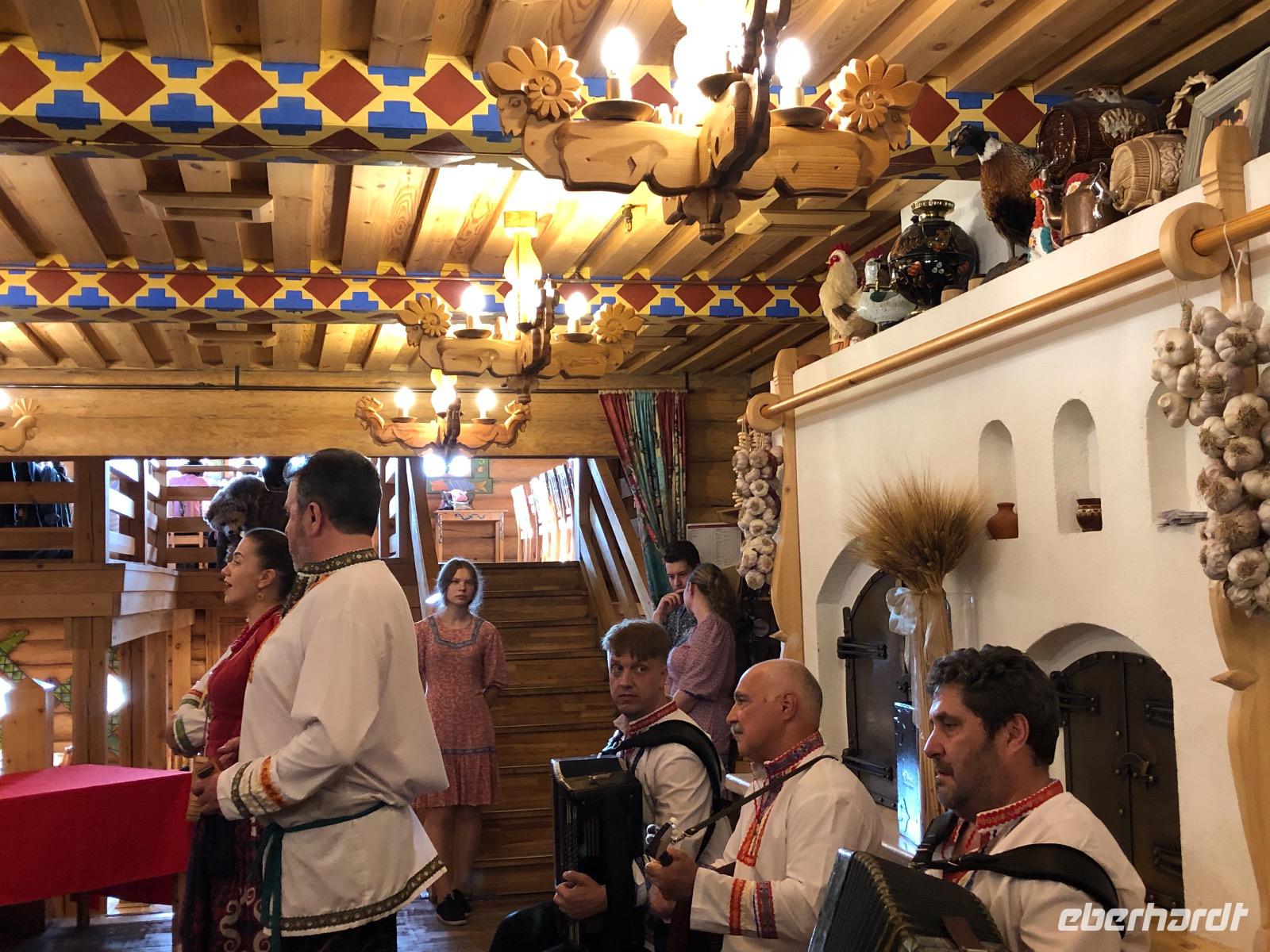 Im Restaurant Podvorie lassen wir den Tag ausklingen. Die Tische biegen sich unter köstlichen russischen Spezialitäten, Wodka und Wein wird nachgeschenkt. Mit volkstümlicher Musik und Gesang wird das ganze Mahl begleitet. Zur Vorspeise gibt es halbierte Tomaten mit Käsesalat, sauer eingelegtes Gemüse und Filetspitzen in Sahnesoße. Anschließend wird ein Pilzgericht serviert und es gibt Bortscht, die typisch russische Krautsuppe. Außerdem gefüllte Kohlrouladen und zum Nachtisch Eis. Die Folkloregruppe bindet uns in ihr Programm mit ein. Wir bekommen kleine Holzinstrumente, mit denen man viel Krach machen und die man später auch käuflich erwerben kann. Ein erlebnisreicher Tag geht zu Ende. Im Bus singen wir gemeinsam mit Irina das Lied IMMER LEBE DIE SONNE, dessen Text ein Teil unserer Gruppe auf Russisch gelernt hat und Irina wiederum in Deutsch, das verbindet.