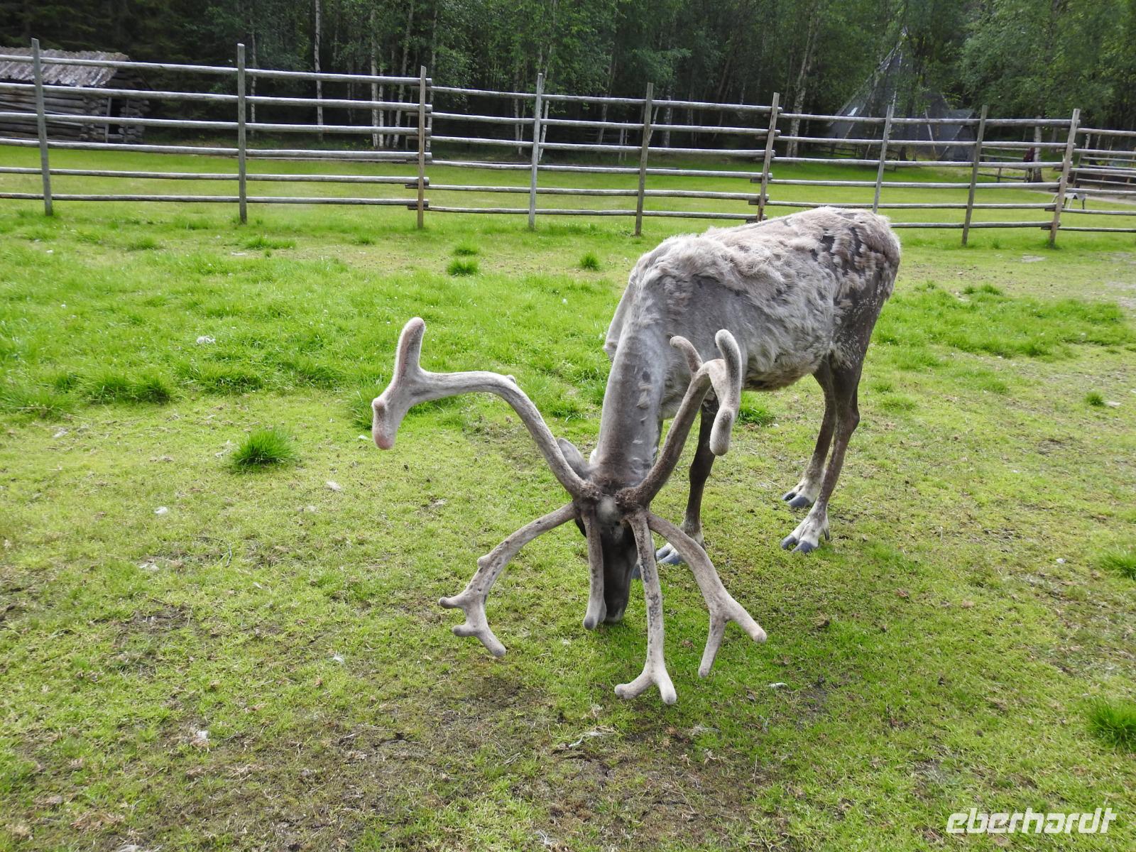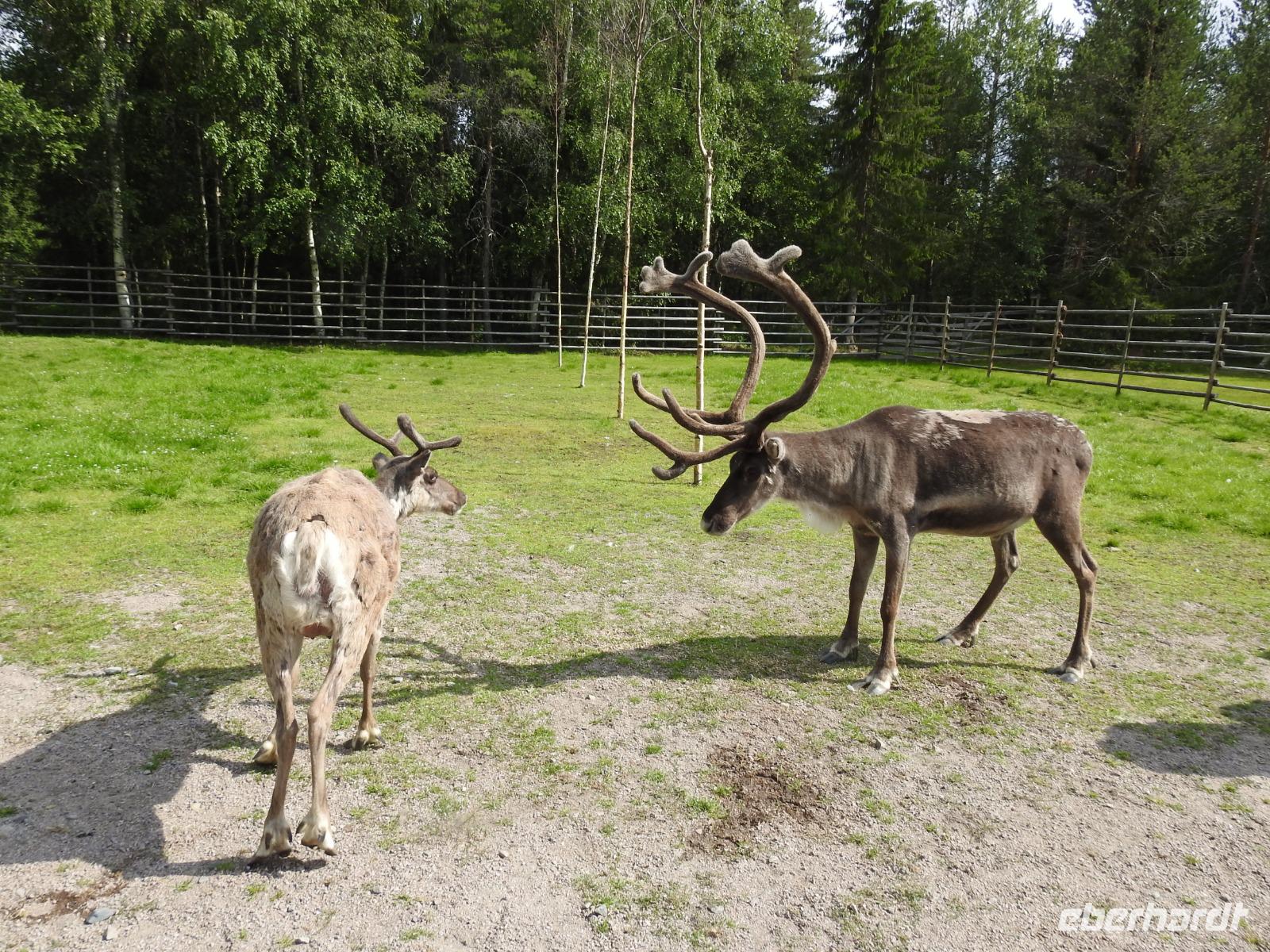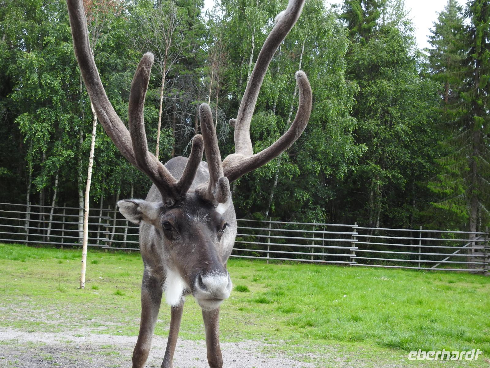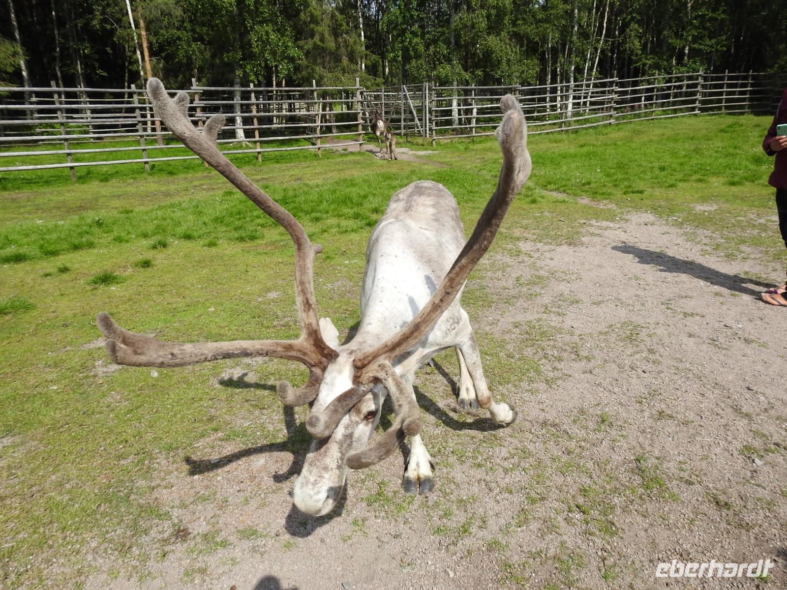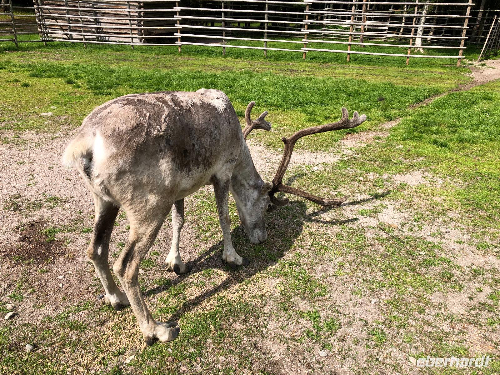 Nach einem ausgiebigen Frühstück fahren wir zum Büro von Lappland Safaris. Hier werden wir mit Schwimmwesten ausgestattet, denn wir haben eine Bootsfahrt auf dem Keminjoki und dem Ounasjoki vor uns. Der Keminjoki ist 550 Kilometer lang und der längste Fluss in Finnland. Unser Boot ist aus Holz und wir sitzen in Zweierreihen hintereinander. Annina, unsere örtliche Reiseleiterin ist auch unsere Bootsführerin. Still und sanft gleitet unser Boot über das Wasser. An den Ufern sind ausgedehnte Waldgebiete zu sehen, ab und zu tut sich eine Lichtung auf und wir sehen ein paar Häuser. Es gibt keinen Gegenverkehr, wir treffen auf keine weiteren Boote. Nach ca. 45 Minuten legen wir unseren ersten Stopp bei einer lappländischen Familie ein. Irene, so heißt die Hausherrin, ihr Mann und ihre Tochter heißen uns herzlich Willkommen. In ihrer Werkstatt macht uns Irene humorvoll mit dem Leben in Lappland vertraut. Sie zeigt uns Rentiergeweihe in verschiedenen Stadien, mit und ohne Fell, von kastrierten und nicht kastrierten Tieren. Sie erklärt uns, wie Rentierleder gewonnen wird und auch, wie aus Lachshaut Leder gemacht werden kann. Anschließend lädt sie uns in ihr Wohnhaus ein und auch dort lernen wir noch einiges über das harte Leben in Lappland. Wir verabschieden uns von dieser gastfreundlichen Familie und setzen unseren Weg mit dem Boot fort. An unserem nächsten Stopp müssen wir einen Weg aus Planken überqueren, bevor wir zur Rentierfarm kommen. Wir werden bereits von einem Schamanen erwartet. In einer traditionellen Hütte werden wir begrüßt und er erzählt uns die Geschichte der vier Winde, die für das Aussehen der traditionellen Kopfbedeckung gesorgt hat. Anschließend werden wir in einem Ritual gezeichnet und gereinigt. Wir haben dabei großen Spaß. In einem weitläufigen Gatter treffen wir anschließend auf Rentiere, die wir auch füttern dürfen.