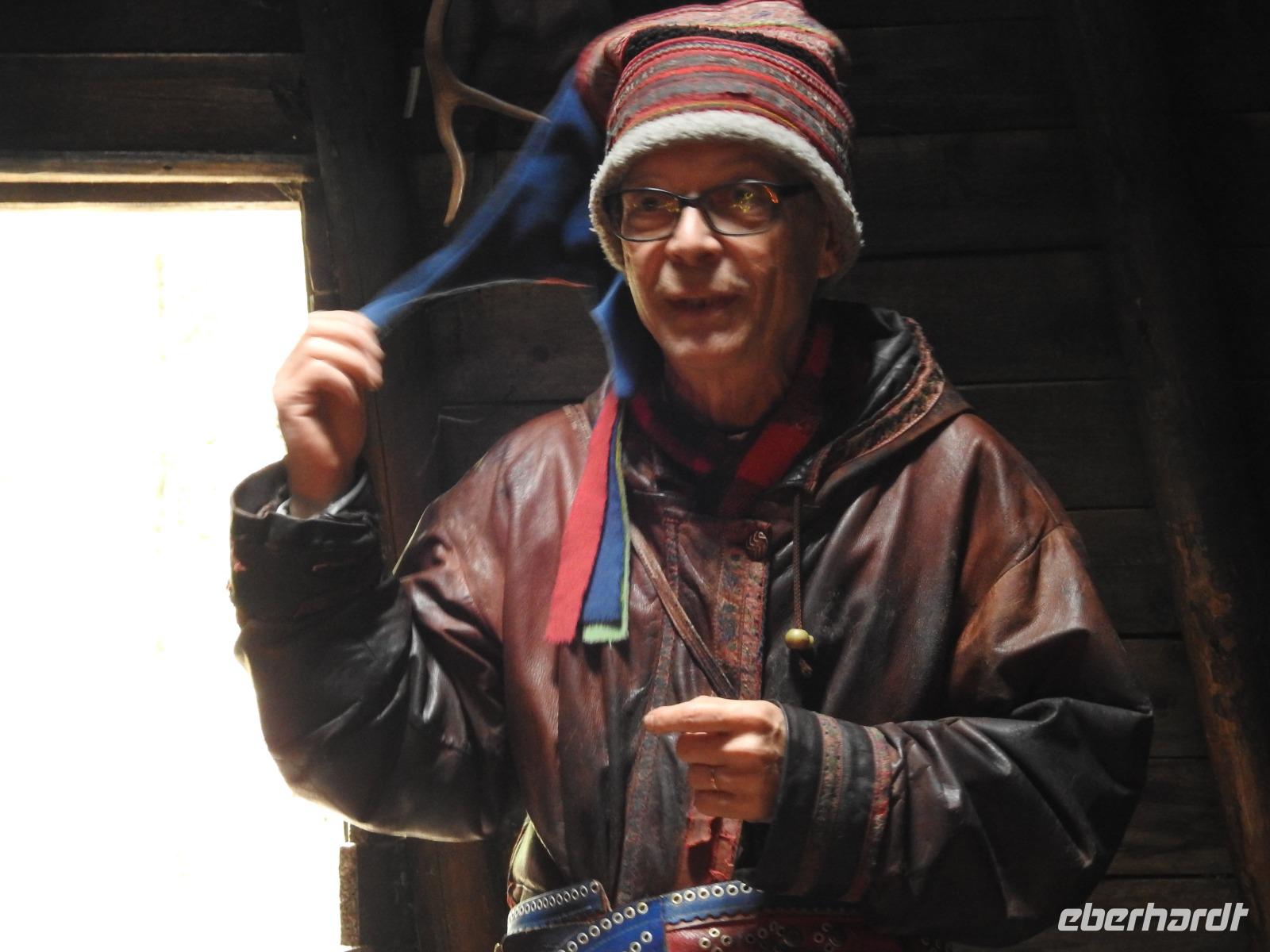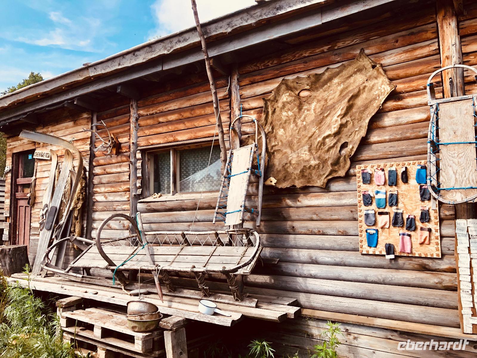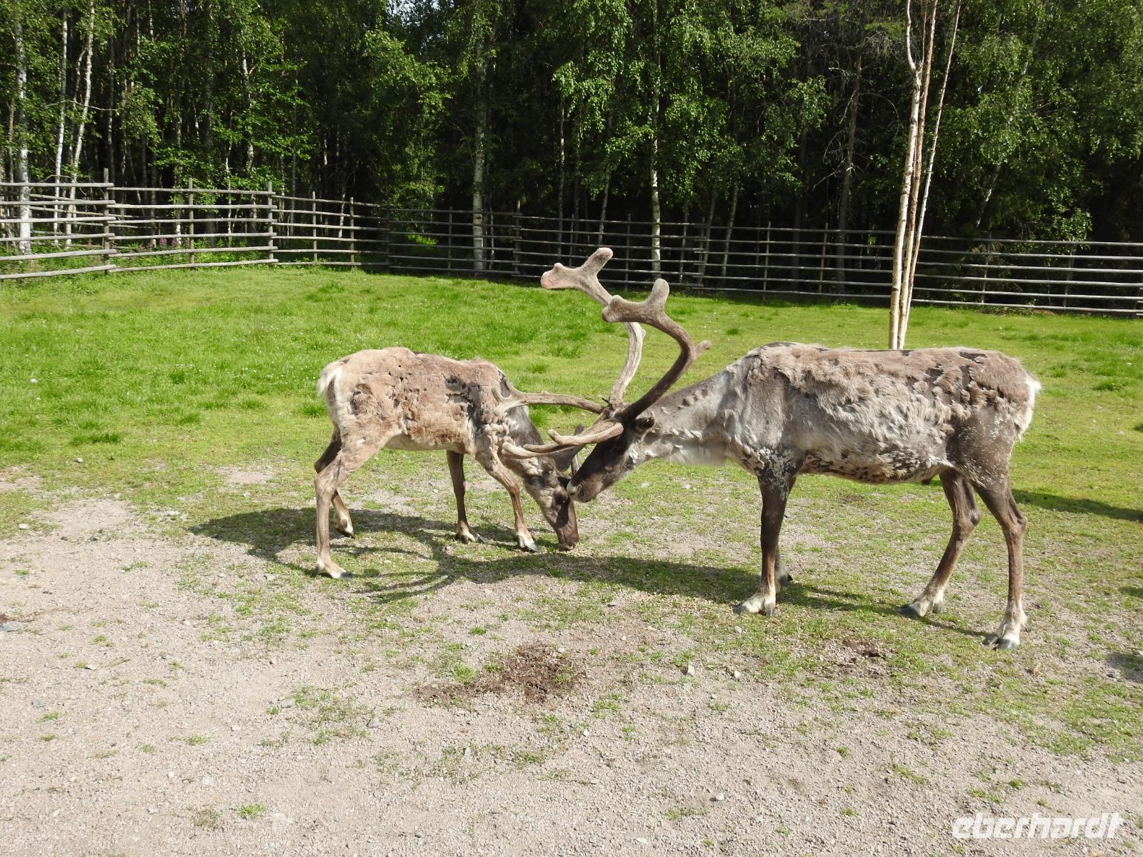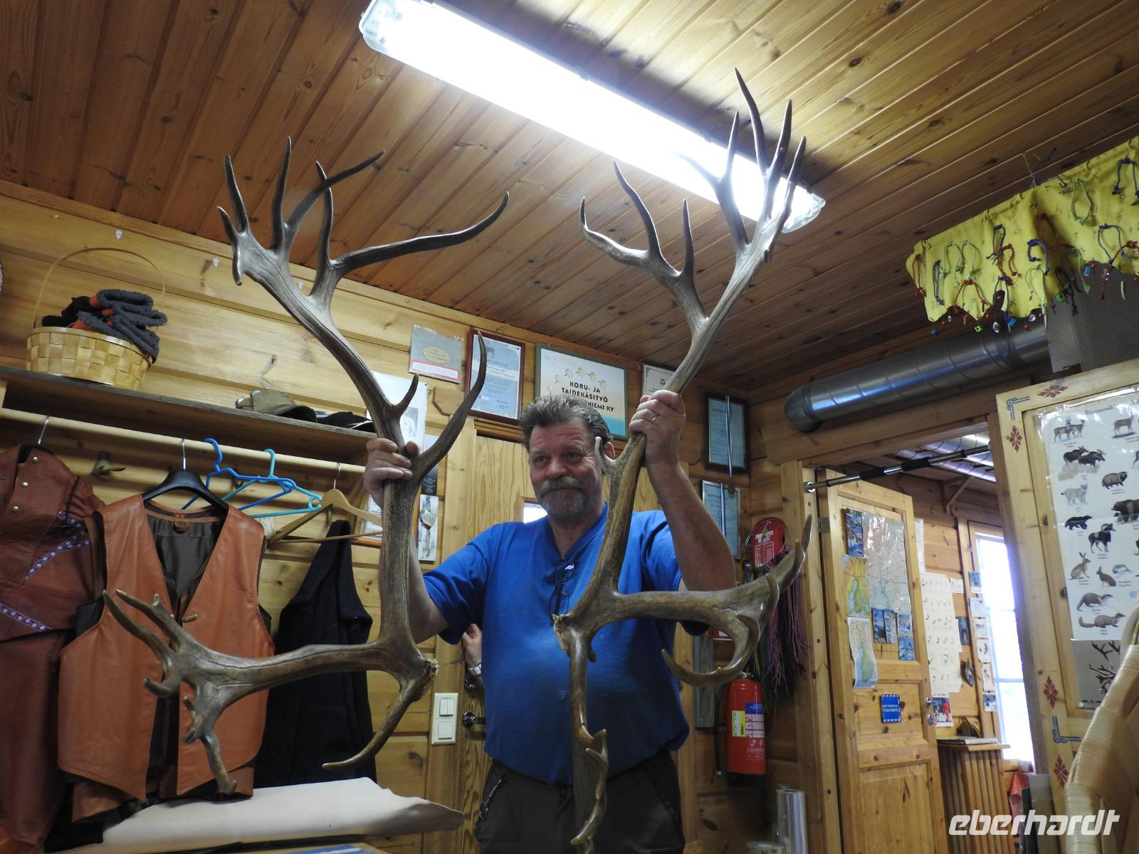 Nach einem ausgiebigen Frühstück fahren wir zum Büro von Lappland Safaris. Hier werden wir mit Schwimmwesten ausgestattet, denn wir haben eine Bootsfahrt auf dem Keminjoki und dem Ounasjoki vor uns. Der Keminjoki ist 550 Kilometer lang und der längste Fluss in Finnland. Unser Boot ist aus Holz und wir sitzen in Zweierreihen hintereinander. Annina, unsere örtliche Reiseleiterin ist auch unsere Bootsführerin. Still und sanft gleitet unser Boot über das Wasser. An den Ufern sind ausgedehnte Waldgebiete zu sehen, ab und zu tut sich eine Lichtung auf und wir sehen ein paar Häuser. Es gibt keinen Gegenverkehr, wir treffen auf keine weiteren Boote. Nach ca. 45 Minuten legen wir unseren ersten Stopp bei einer lappländischen Familie ein. Irene, so heißt die Hausherrin, ihr Mann und ihre Tochter heißen uns herzlich Willkommen. In ihrer Werkstatt macht uns Irene humorvoll mit dem Leben in Lappland vertraut. Sie zeigt uns Rentiergeweihe in verschiedenen Stadien, mit und ohne Fell, von kastrierten und nicht kastrierten Tieren. Sie erklärt uns, wie Rentierleder gewonnen wird und auch, wie aus Lachshaut Leder gemacht werden kann. Anschließend lädt sie uns in ihr Wohnhaus ein und auch dort lernen wir noch einiges über das harte Leben in Lappland. Wir verabschieden uns von dieser gastfreundlichen Familie und setzen unseren Weg mit dem Boot fort. An unserem nächsten Stopp müssen wir einen Weg aus Planken überqueren, bevor wir zur Rentierfarm kommen. Wir werden bereits von einem Schamanen erwartet. In einer traditionellen Hütte werden wir begrüßt und er erzählt uns die Geschichte der vier Winde, die für das Aussehen der traditionellen Kopfbedeckung gesorgt hat. Anschließend werden wir in einem Ritual gezeichnet und gereinigt. Wir haben dabei großen Spaß. In einem weitläufigen Gatter treffen wir anschließend auf Rentiere, die wir auch füttern dürfen.
