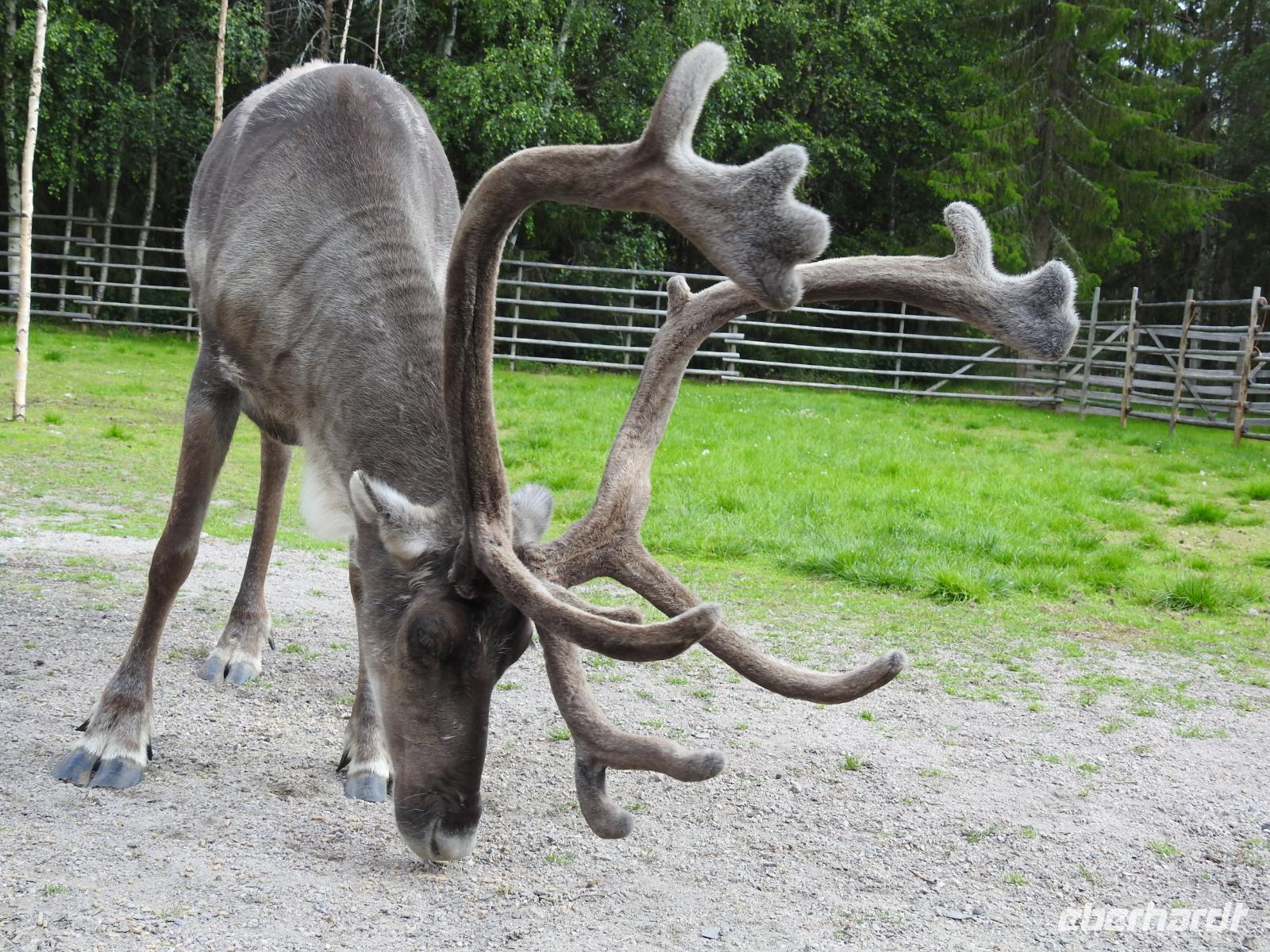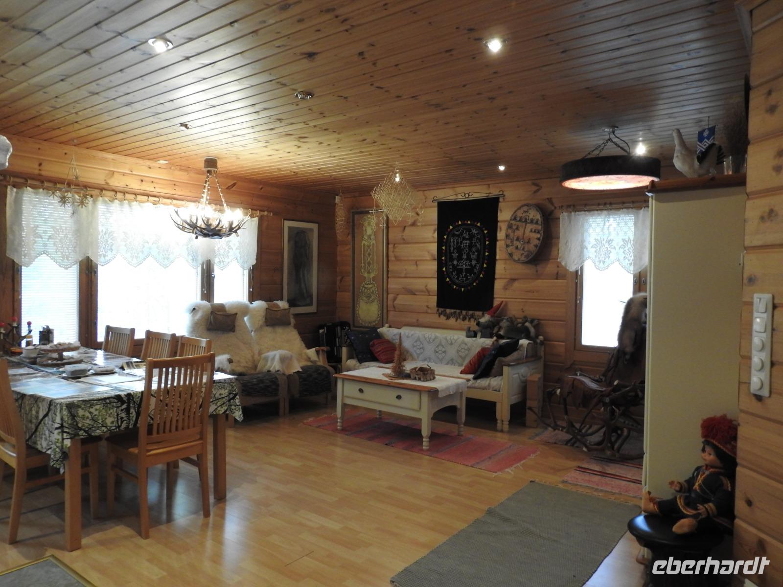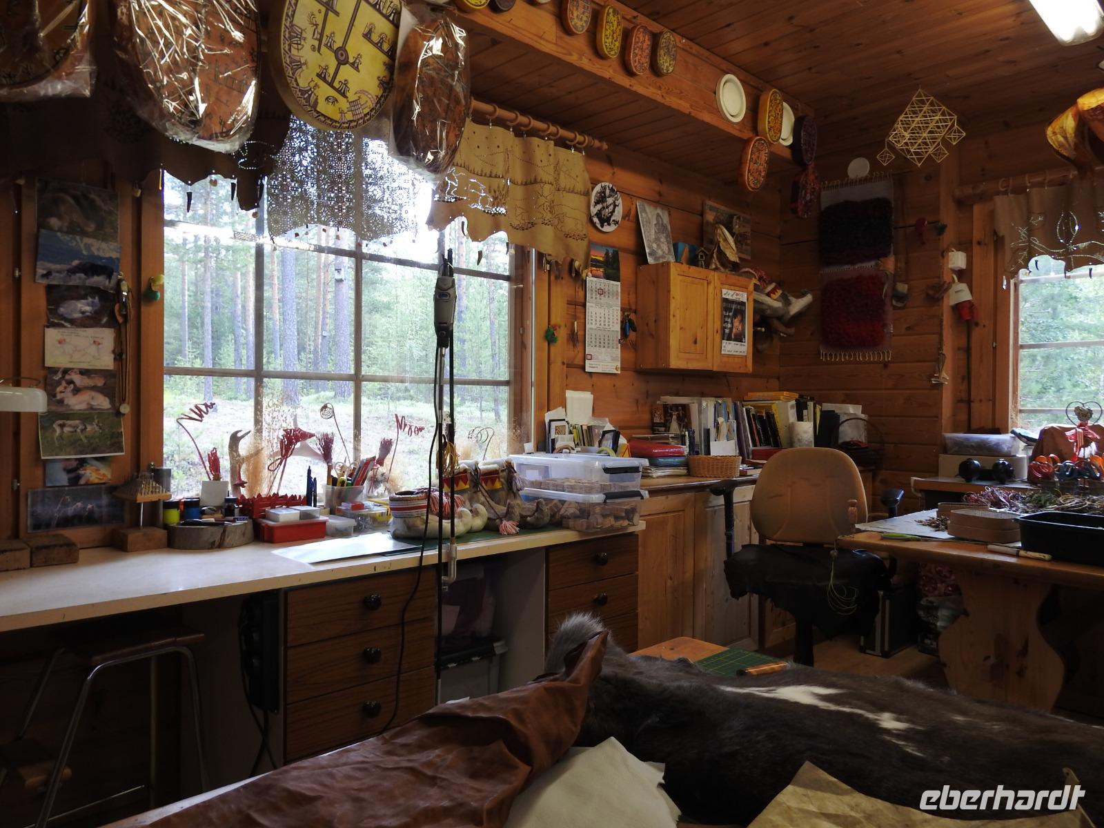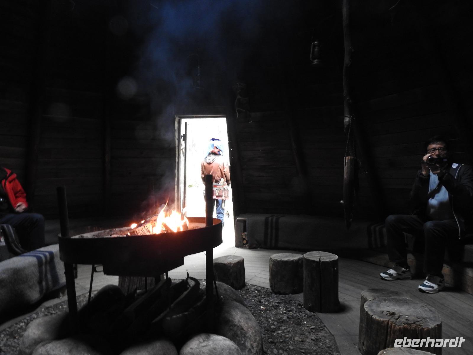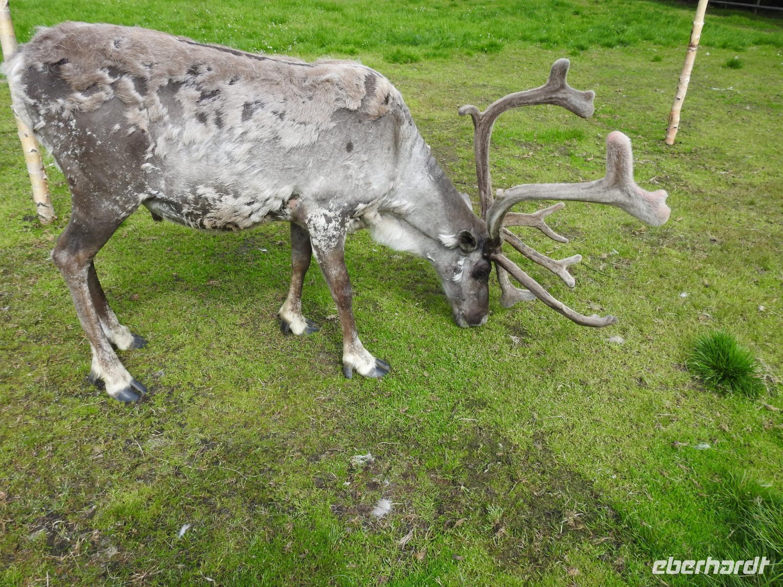 Nach einem ausgiebigen Frühstück fahren wir zum Büro von Lappland Safaris. Hier werden wir mit Schwimmwesten ausgestattet, denn wir haben eine Bootsfahrt auf dem Keminjoki und dem Ounasjoki vor uns. Der Keminjoki ist 550 Kilometer lang und der längste Fluss in Finnland. Unser Boot ist aus Holz und wir sitzen in Zweierreihen hintereinander. Annina, unsere örtliche Reiseleiterin ist auch unsere Bootsführerin. Still und sanft gleitet unser Boot über das Wasser. An den Ufern sind ausgedehnte Waldgebiete zu sehen, ab und zu tut sich eine Lichtung auf und wir sehen ein paar Häuser. Es gibt keinen Gegenverkehr, wir treffen auf keine weiteren Boote. Nach ca. 45 Minuten legen wir unseren ersten Stopp bei einer lappländischen Familie ein. Irene, so heißt die Hausherrin, ihr Mann und ihre Tochter heißen uns herzlich Willkommen. In ihrer Werkstatt macht uns Irene humorvoll mit dem Leben in Lappland vertraut. Sie zeigt uns Rentiergeweihe in verschiedenen Stadien, mit und ohne Fell, von kastrierten und nicht kastrierten Tieren. Sie erklärt uns, wie Rentierleder gewonnen wird und auch, wie aus Lachshaut Leder gemacht werden kann. Anschließend lädt sie uns in ihr Wohnhaus ein und auch dort lernen wir noch einiges über das harte Leben in Lappland. Wir verabschieden uns von dieser gastfreundlichen Familie und setzen unseren Weg mit dem Boot fort. An unserem nächsten Stopp müssen wir einen Weg aus Planken überqueren, bevor wir zur Rentierfarm kommen. Wir werden bereits von einem Schamanen erwartet. In einer traditionellen Hütte werden wir begrüßt und er erzählt uns die Geschichte der vier Winde, die für das Aussehen der traditionellen Kopfbedeckung gesorgt hat. Anschließend werden wir in einem Ritual gezeichnet und gereinigt. Wir haben dabei großen Spaß. In einem weitläufigen Gatter treffen wir anschließend auf Rentiere, die wir auch füttern dürfen.