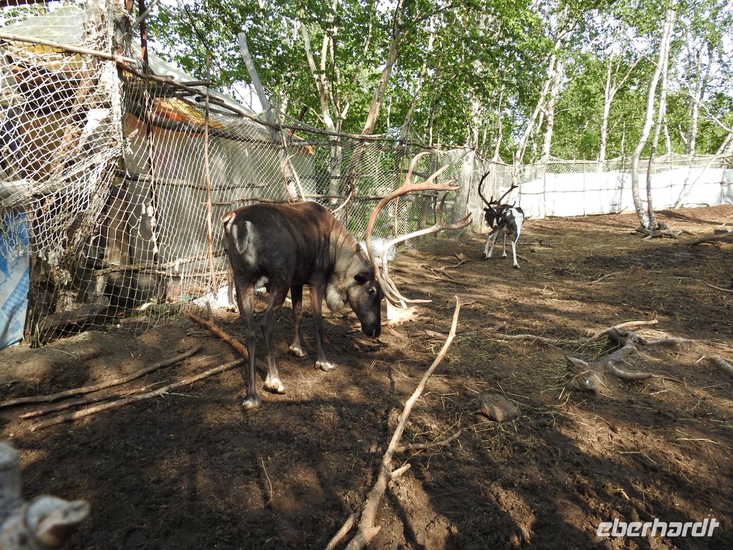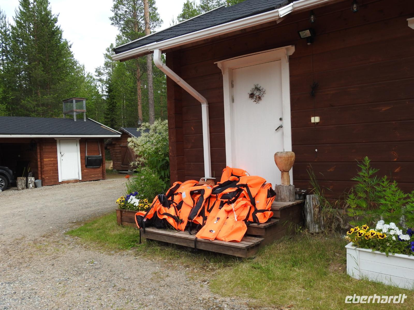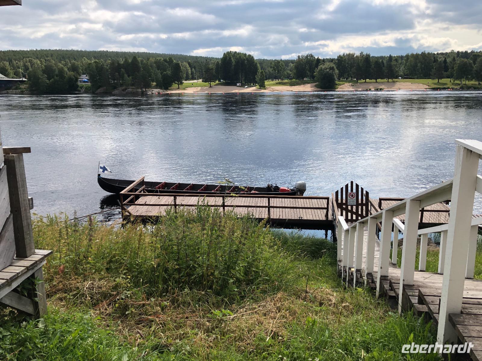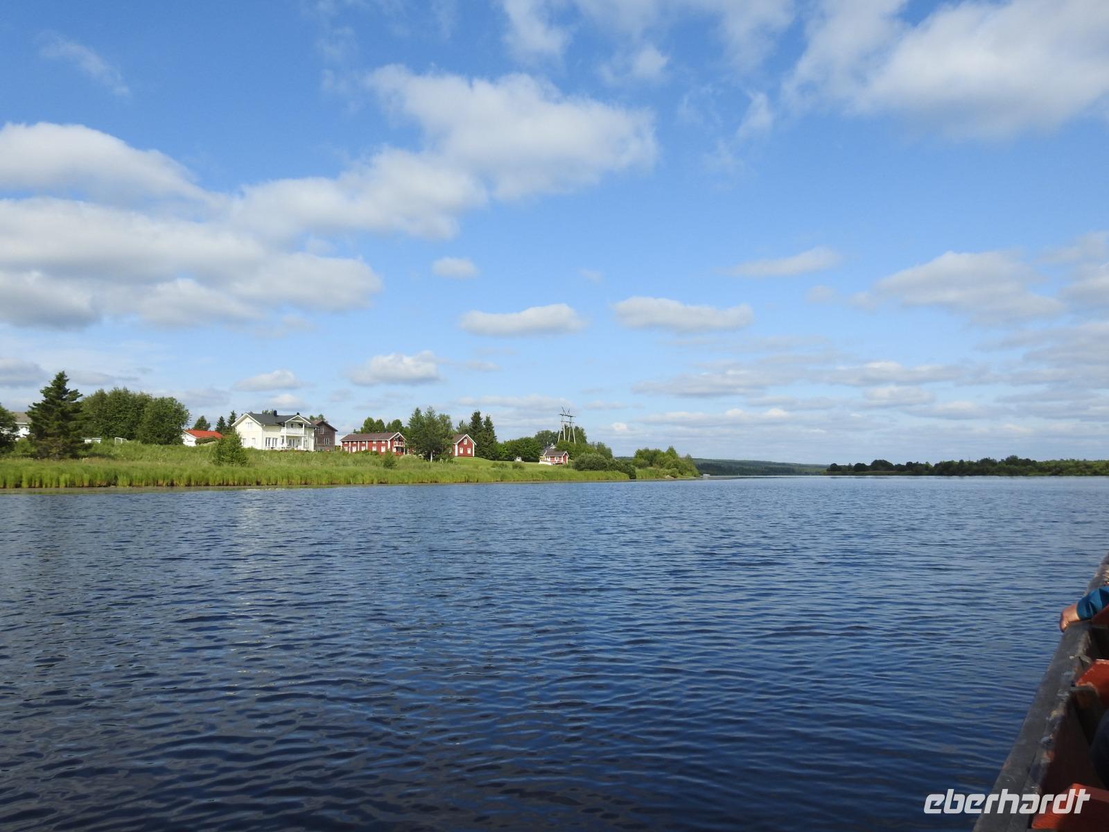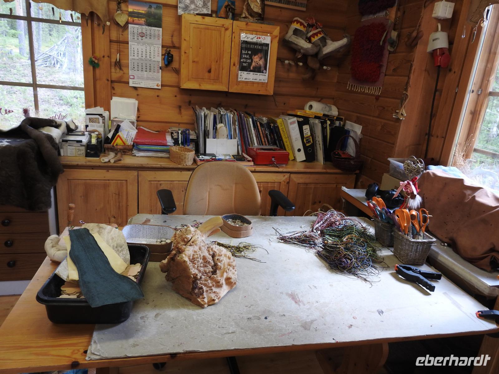 Nach einem ausgiebigen Frühstück fahren wir zum Büro von Lappland Safaris. Hier werden wir mit Schwimmwesten ausgestattet, denn wir haben eine Bootsfahrt auf dem Keminjoki und dem Ounasjoki vor uns. Der Keminjoki ist 550 Kilometer lang und der längste Fluss in Finnland. Unser Boot ist aus Holz und wir sitzen in Zweierreihen hintereinander. Annina, unsere örtliche Reiseleiterin ist auch unsere Bootsführerin. Still und sanft gleitet unser Boot über das Wasser. An den Ufern sind ausgedehnte Waldgebiete zu sehen, ab und zu tut sich eine Lichtung auf und wir sehen ein paar Häuser. Es gibt keinen Gegenverkehr, wir treffen auf keine weiteren Boote. Nach ca. 45 Minuten legen wir unseren ersten Stopp bei einer lappländischen Familie ein. Irene, so heißt die Hausherrin, ihr Mann und ihre Tochter heißen uns herzlich Willkommen. In ihrer Werkstatt macht uns Irene humorvoll mit dem Leben in Lappland vertraut. Sie zeigt uns Rentiergeweihe in verschiedenen Stadien, mit und ohne Fell, von kastrierten und nicht kastrierten Tieren. Sie erklärt uns, wie Rentierleder gewonnen wird und auch, wie aus Lachshaut Leder gemacht werden kann. Anschließend lädt sie uns in ihr Wohnhaus ein und auch dort lernen wir noch einiges über das harte Leben in Lappland. Wir verabschieden uns von dieser gastfreundlichen Familie und setzen unseren Weg mit dem Boot fort. An unserem nächsten Stopp müssen wir einen Weg aus Planken überqueren, bevor wir zur Rentierfarm kommen. Wir werden bereits von einem Schamanen erwartet. In einer traditionellen Hütte werden wir begrüßt und er erzählt uns die Geschichte der vier Winde, die für das Aussehen der traditionellen Kopfbedeckung gesorgt hat. Anschließend werden wir in einem Ritual gezeichnet und gereinigt. Wir haben dabei großen Spaß. In einem weitläufigen Gatter treffen wir anschließend auf Rentiere, die wir auch füttern dürfen.