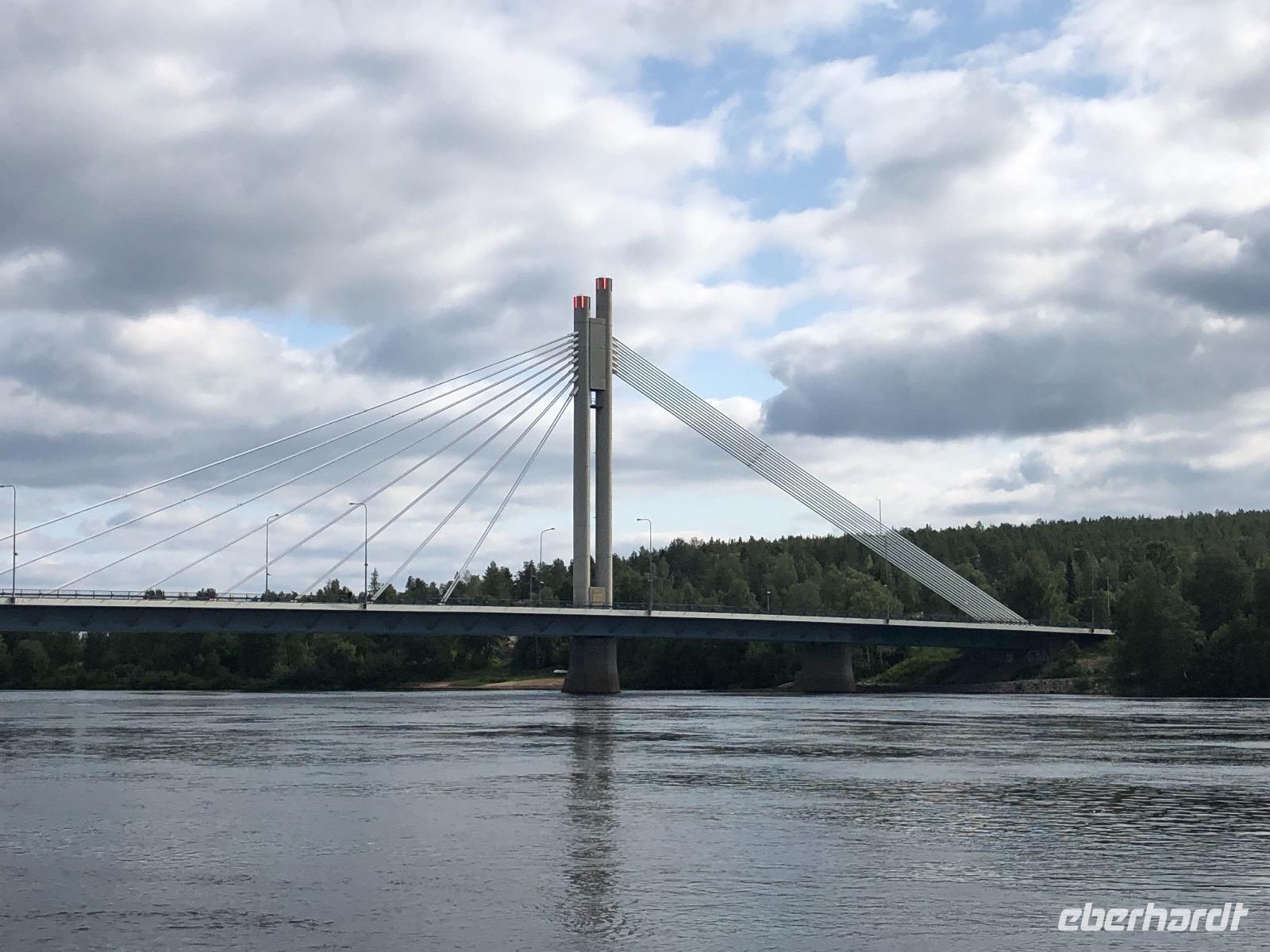 Heute fliegen wir mit Finnair (AY) von Berlin Tegel, Frankfurt und Wien über Helsinki in die nördlichste Region Finnlands, nach Lappland. Abfertigung, Sicherheitskontrollen sind leicht zu bewältigen. Der Sitzkomfort bei Finnair ist ok, man hat genügend Beinfreiheit. Obwohl auf angekündigt ist, dass es Speisen und Getränke nur gegen Bezahlung gibt, wird uns auf beiden Flügen ein Getränk (kostenlos) serviert. Mit einer halben Stunde Verspätung (kaum der Rede wert) erreichen wir Rovaniemi. Ein Koffer hat es nicht geschafft. Unsere örtliche Reiseleiterin Anina heißt uns herzlich Willkommen. Nachdem das Protokoll zu dem verlorenen Koffer angefertigt wurde, fahren wir zu unserer Unterkunft, den Ounasvaara Chalets. Hier beziehen wir die gemütlichen Holzhütten, die eine dörfliche Gemeinschaft bilden. Um unser Hotel zu erreichen, müssen wir sowohl den Fluss Ounasjoki und dann den Keminjoki überqueren. Über den Keminjoki führt eine dreihundertzwanzig Meter lange Brücke namens Jätkänkynttilä. Diese hat einen markanten mittleren Pfeiler, an dem Zugseile befestigt sind. Auf der Spitze befindet sich das Symbol einer ewigen Flamme. Die Brücke gilt als Wahrzeichen der Stadt und wird nachts beleuchtet.