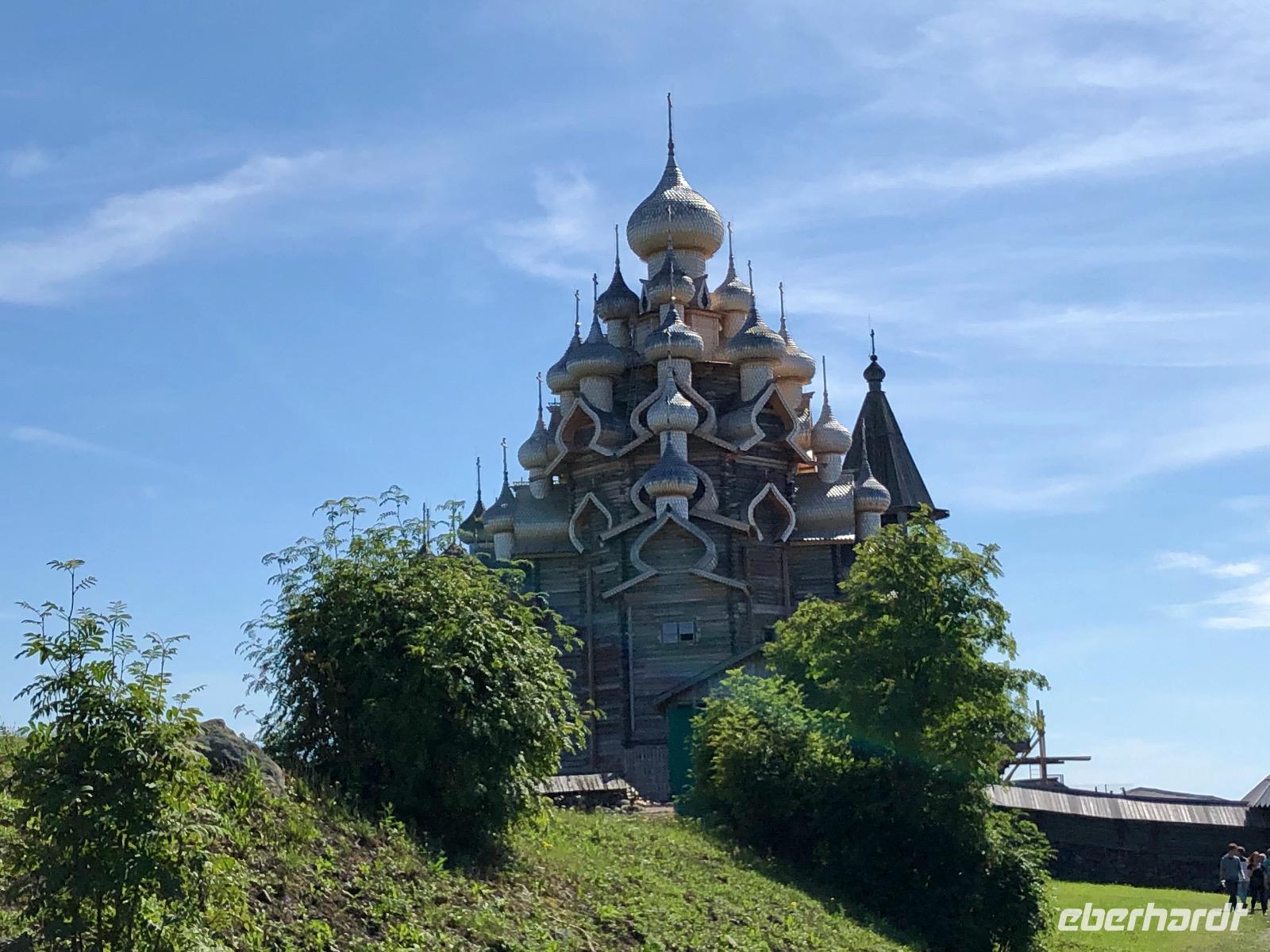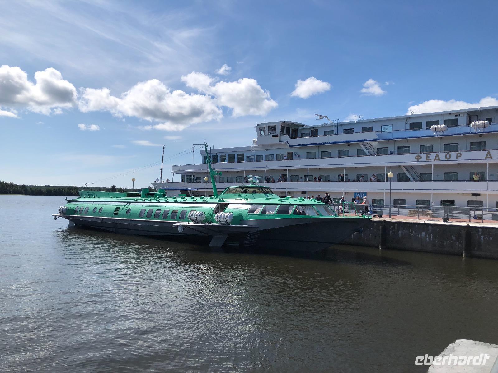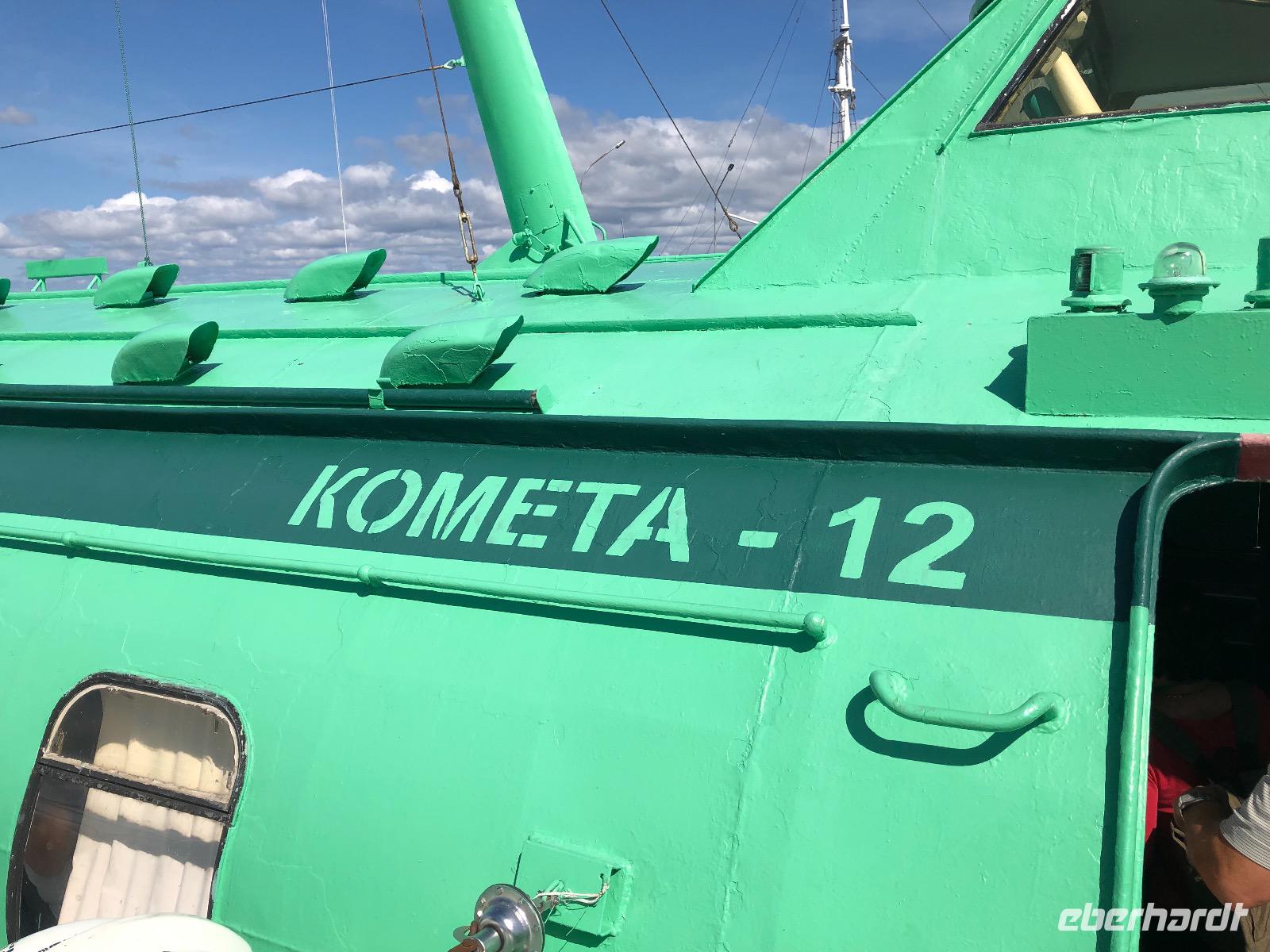 Wir fahren zum Onegasee, vorbei an unserem Hotel SERVERNAJA und einem Einkaufszentrum. Mit dem Tragflügelboot setzen wir zur Insel Kishi über. Die Fahrt dauert eine Stunde und fünfzehn Minuten. Auf Kishi werden wir von Jegor begrüsst, ein dreiundzwanzig jähriger junger Mann, der uns durch das Museumsdorf führen wird.