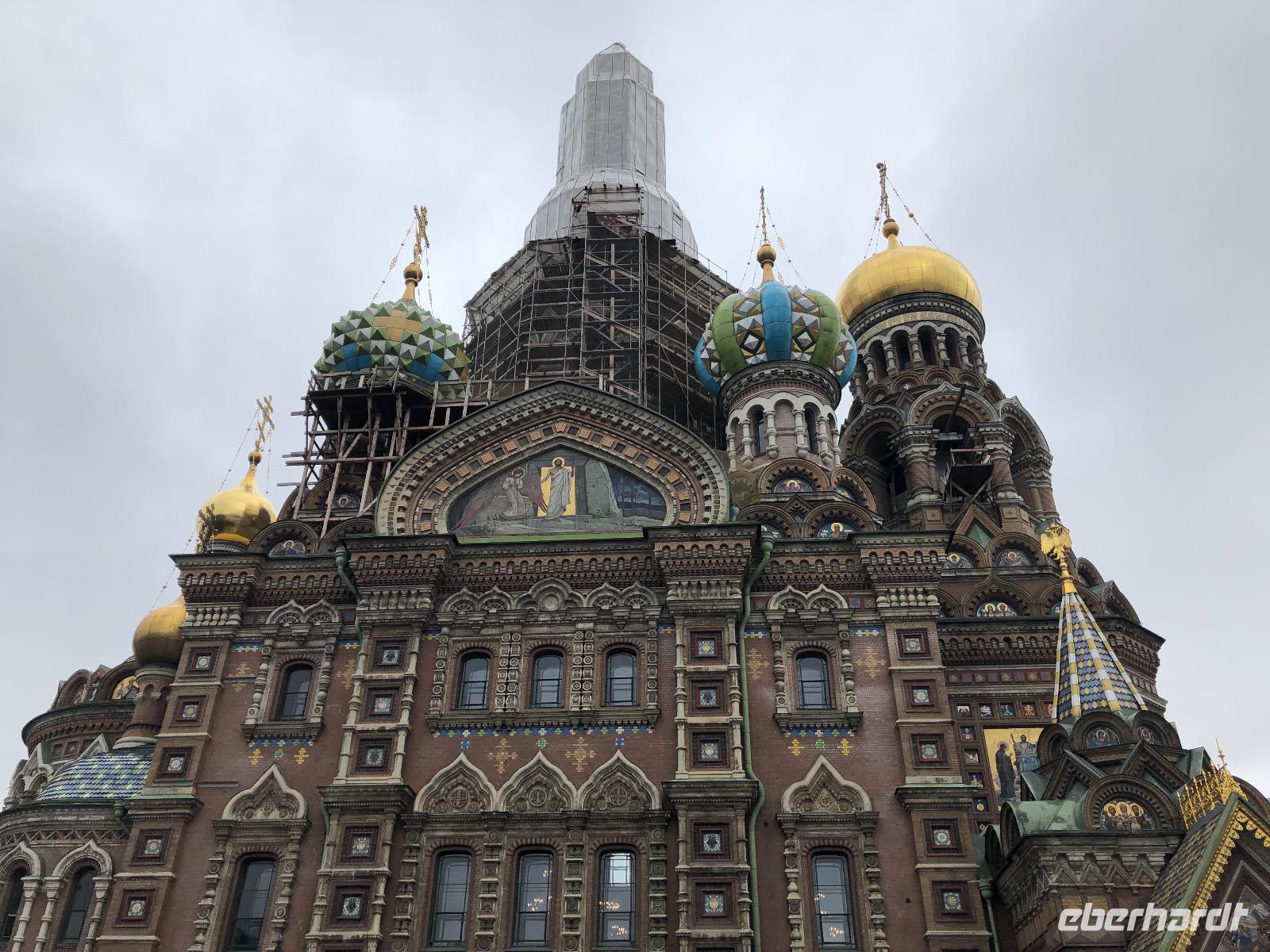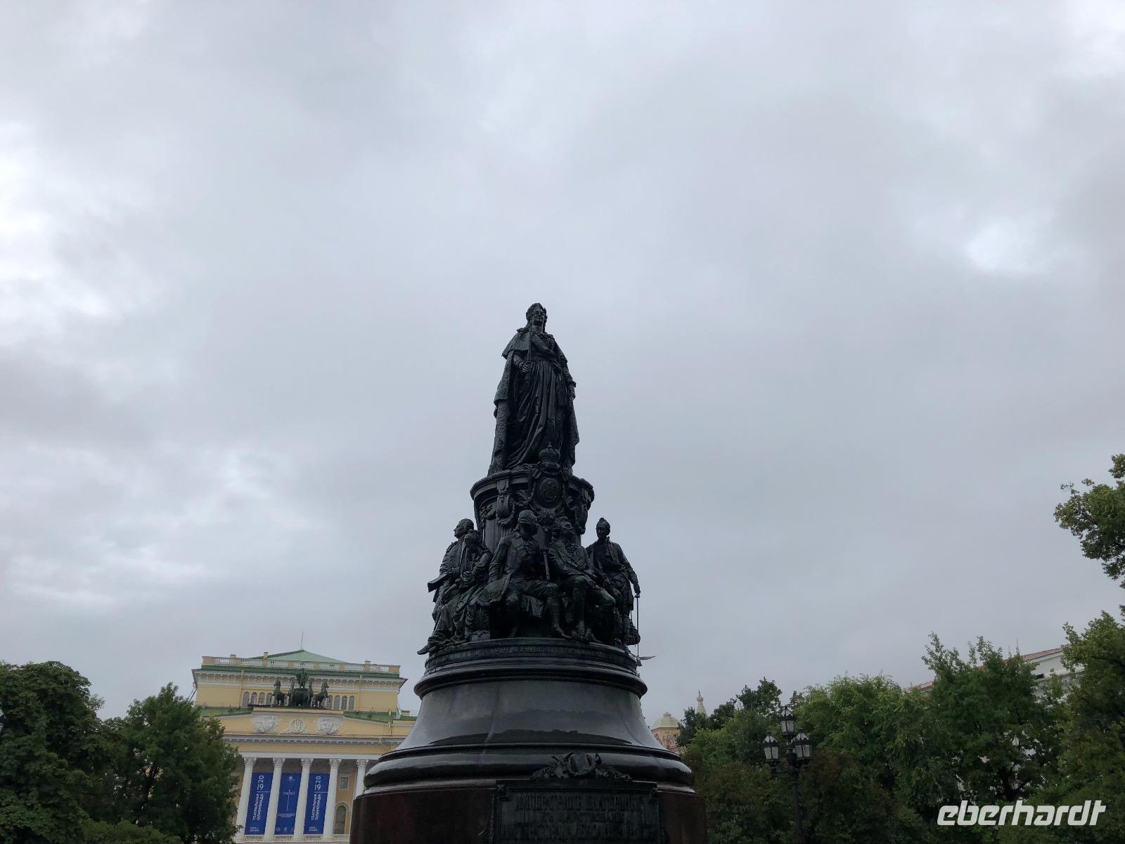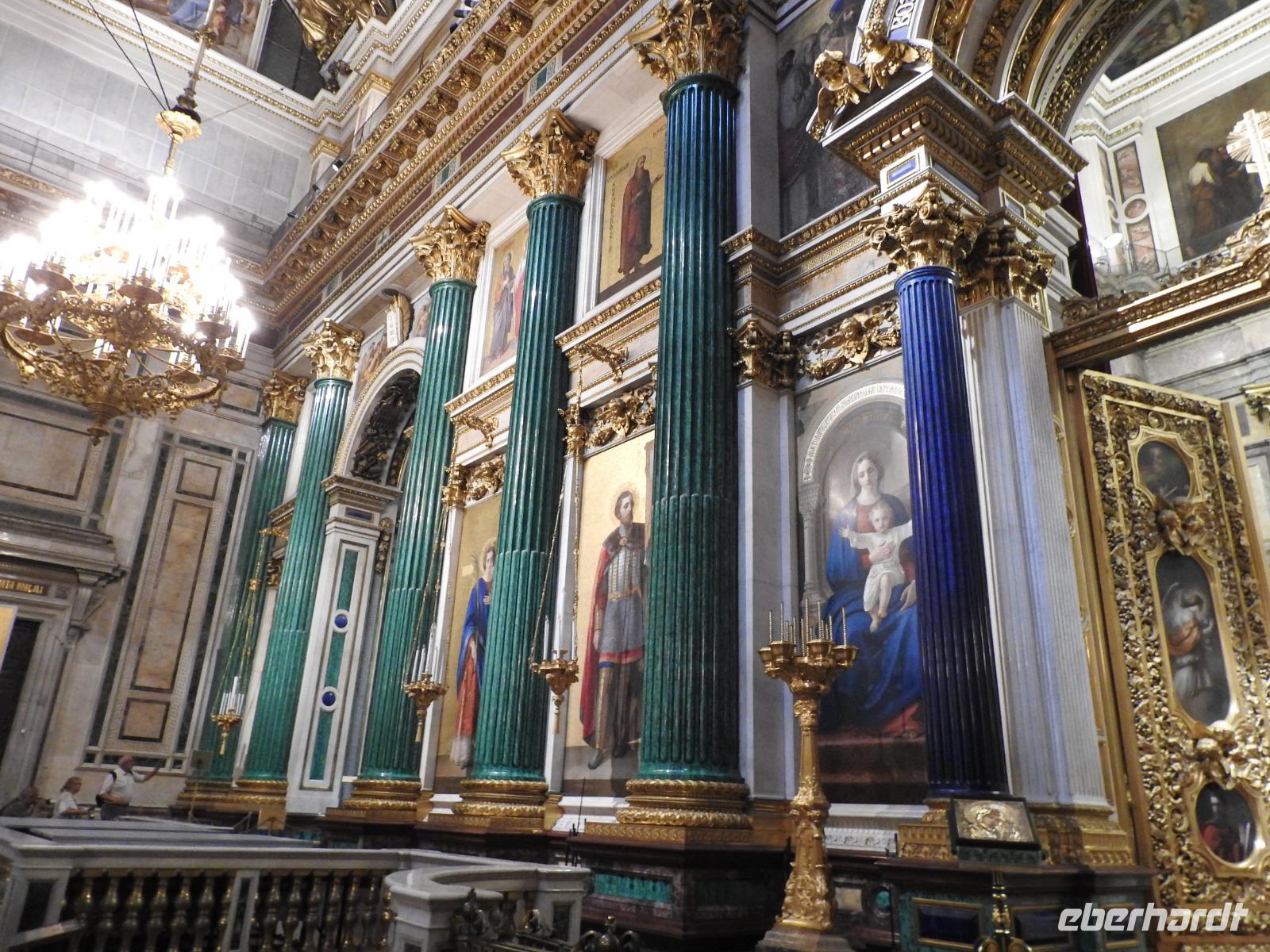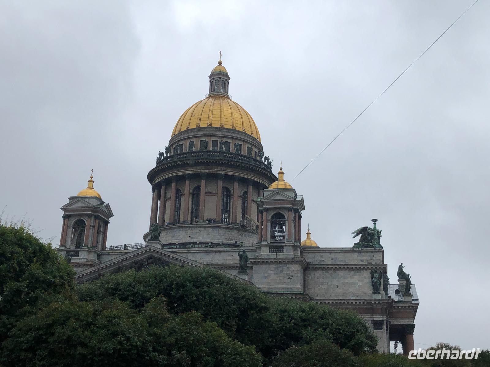Nach einem kräftigen Frühstück begeben wir uns zur Stadtbesichtigung St. Petersburg. Unser Ziel ist der Newski Prospekt. Auffallend sind die hier verkehrenden O-Busse. Über den Fontanka Kanal führt die Brücke der Tierbändiger. Das Haus der Kreativität der Jugend war früher ein Privathaus, dessen Besitzer es damals beim Pokerspiel verlor. Am Denkmal von Katharina der Großen legen wir einen Fotostopp ein. Wir fahren durch die perfekteste Straße der Welt, die 220 Meter lang, 22 Meter breit und 22 Meter hoch ist. Am Ende des Newski Prospekts erreichen wir die Isaak Kathedrale. Die goldene Kuppel leuchtet heute nicht in der Sonne, ist aber trotzdem unübersehbar. Die Isaak Kathedrale gehört zu den größten der Welt, der erste Entwurf stammt aus dem Jahre 1818 und von dem damals noch unbekannten Architekten Auguste de Montferrand. Um das große Gewicht des Gebäudes tragen zu können, wurden tausende Baumstämme in den Sumpf getrieben, der damals die Basis der Stadt bildete. 1858 wurde die Kathedrale eingeweiht und sie überstand als staatliches Museum auch die kommunistischen Zeiten. Irina führt uns durch die Kathedrale und beantwortet alle Fragen. Wir bewundern die großen Mosaik-Bilder und die große Ikonostase. Anschließend gönnt uns Irina die Zeit, die Kolonnade zu erklimmen (mehr als 220 Stufen) und die Aussicht auf St. Petersburg zu genießen. Schade, dass es regnet.