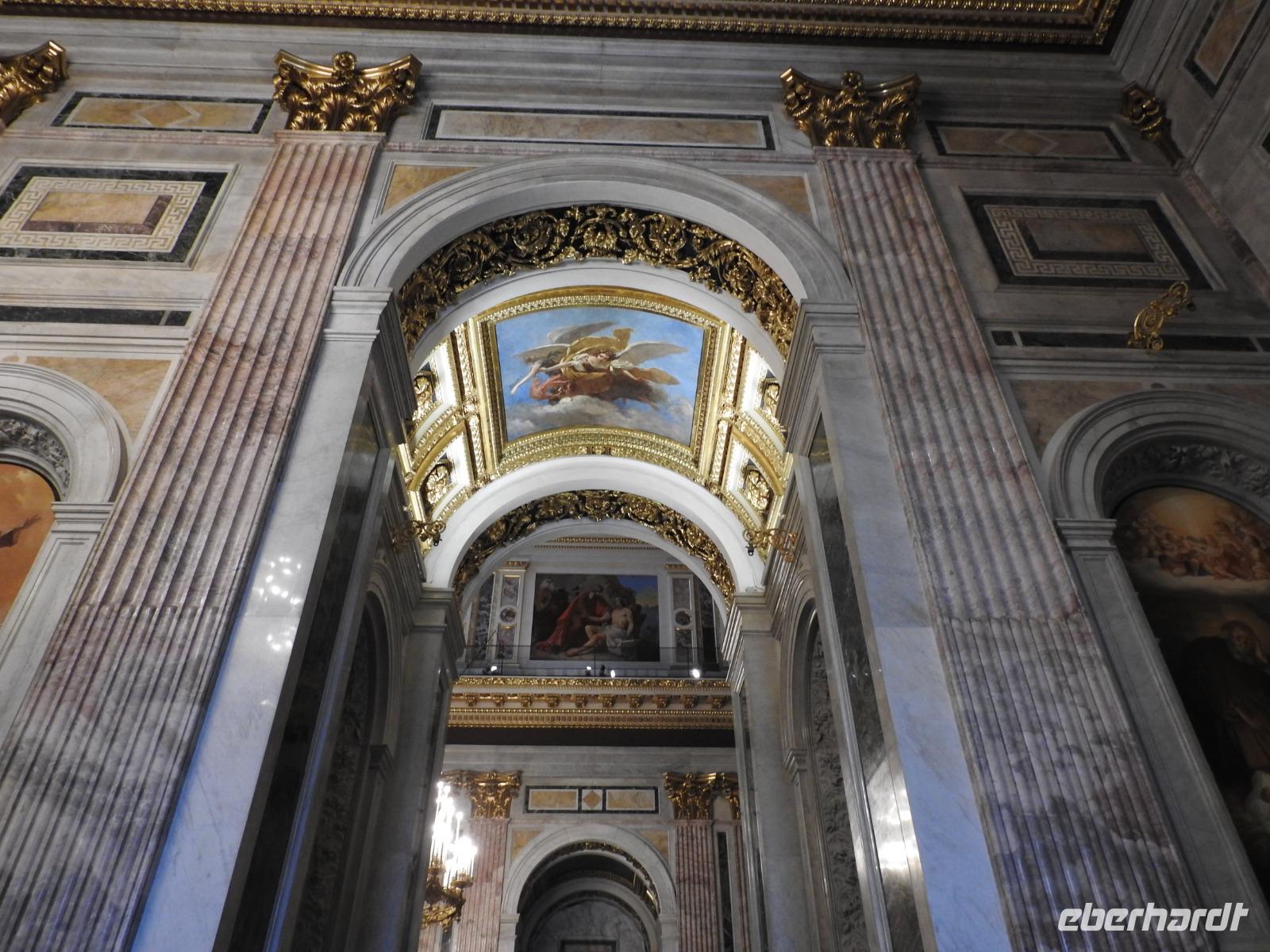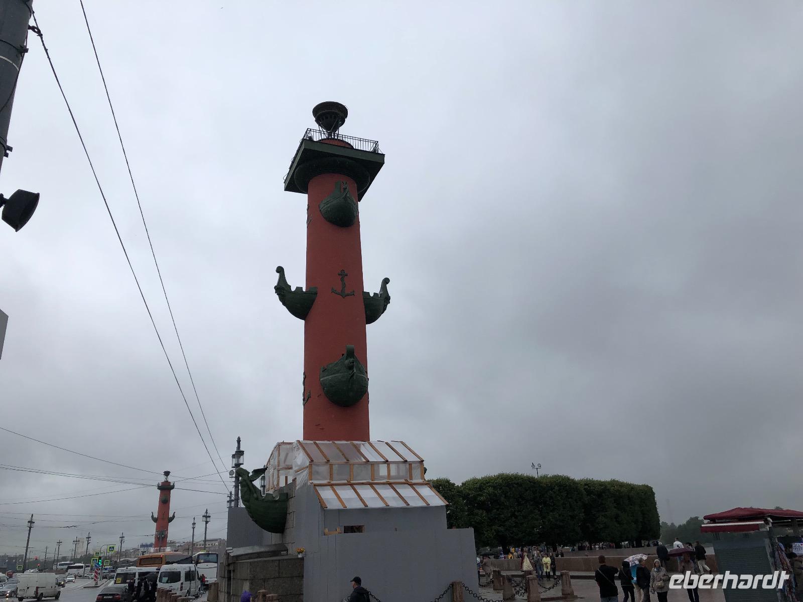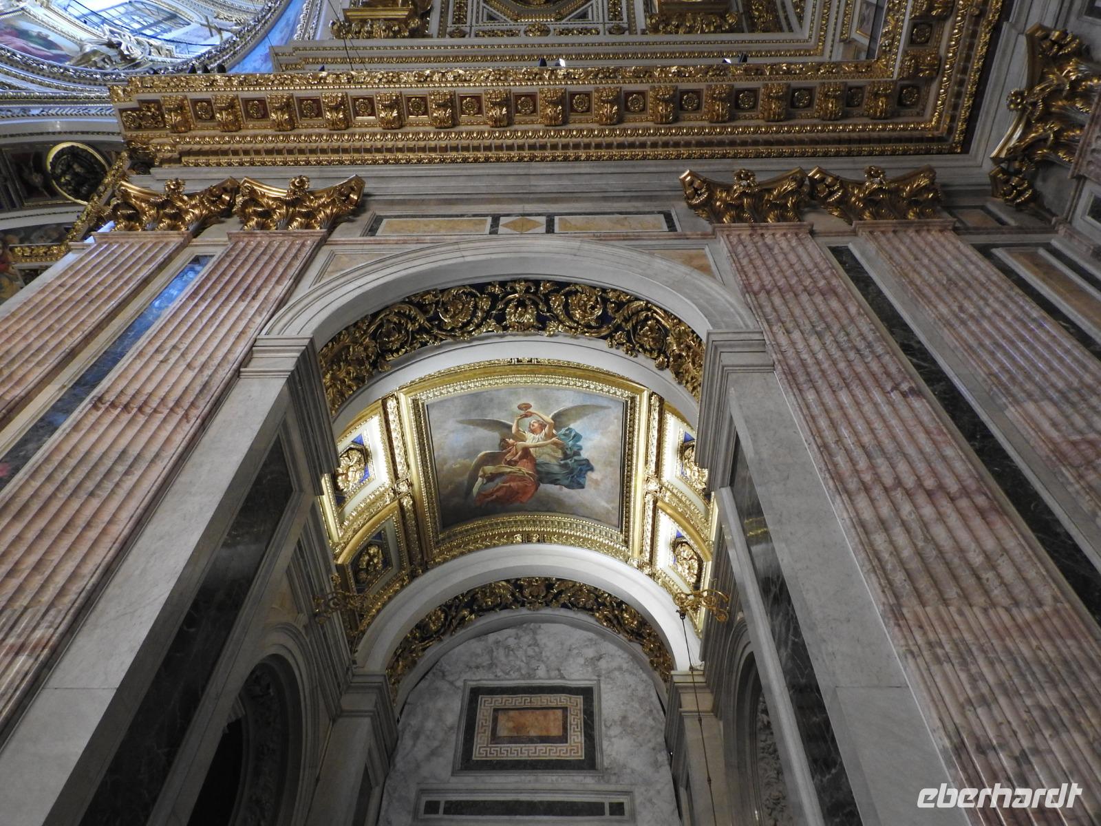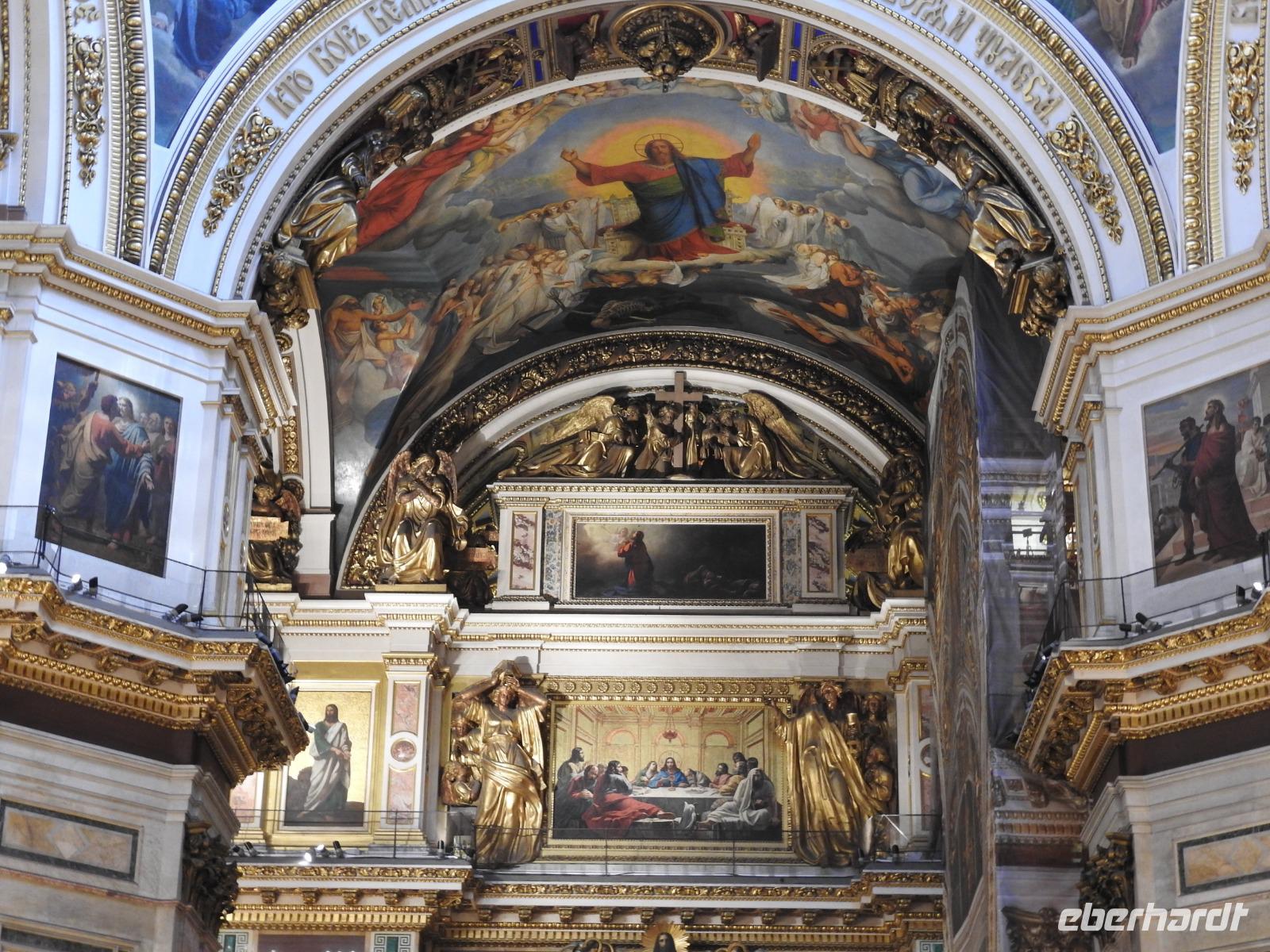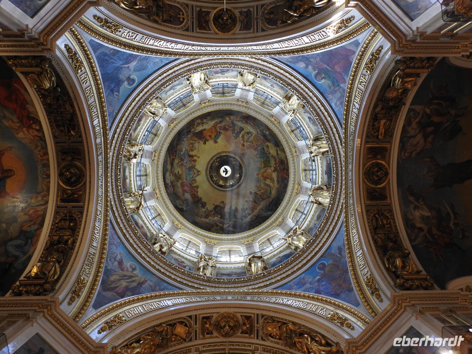 Nach einem kräftigen Frühstück begeben wir uns zur Stadtbesichtigung St. Petersburg. Unser Ziel ist der Newski Prospekt. Auffallend sind die hier verkehrenden O-Busse. Über den Fontanka Kanal führt die Brücke der Tierbändiger. Das Haus der Kreativität der Jugend war früher ein Privathaus, dessen Besitzer es damals beim Pokerspiel verlor. Am Denkmal von Katharina der Großen legen wir einen Fotostopp ein. Wir fahren durch die perfekteste Straße der Welt, die 220 Meter lang, 22 Meter breit und 22 Meter hoch ist. Am Ende des Newski Prospekts erreichen wir die Isaak Kathedrale. Die goldene Kuppel leuchtet heute nicht in der Sonne, ist aber trotzdem unübersehbar. Die Isaak Kathedrale gehört zu den größten der Welt, der erste Entwurf stammt aus dem Jahre 1818 und von dem damals noch unbekannten Architekten Auguste de Montferrand. Um das große Gewicht des Gebäudes tragen zu können, wurden tausende Baumstämme in den Sumpf getrieben, der damals die Basis der Stadt bildete. 1858 wurde die Kathedrale eingeweiht und sie überstand als staatliches Museum auch die kommunistischen Zeiten. Irina führt uns durch die Kathedrale und beantwortet alle Fragen. Wir bewundern die großen Mosaik-Bilder und die große Ikonostase. Anschließend gönnt uns Irina die Zeit, die Kolonnade zu erklimmen (mehr als 220 Stufen) und die Aussicht auf St. Petersburg zu genießen. Schade, dass es regnet.