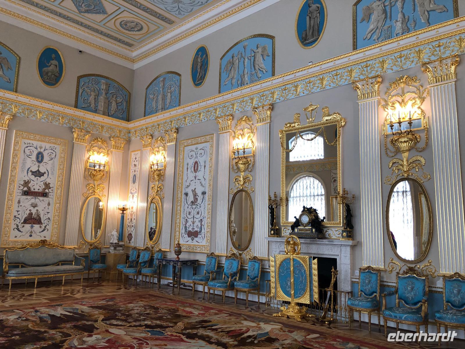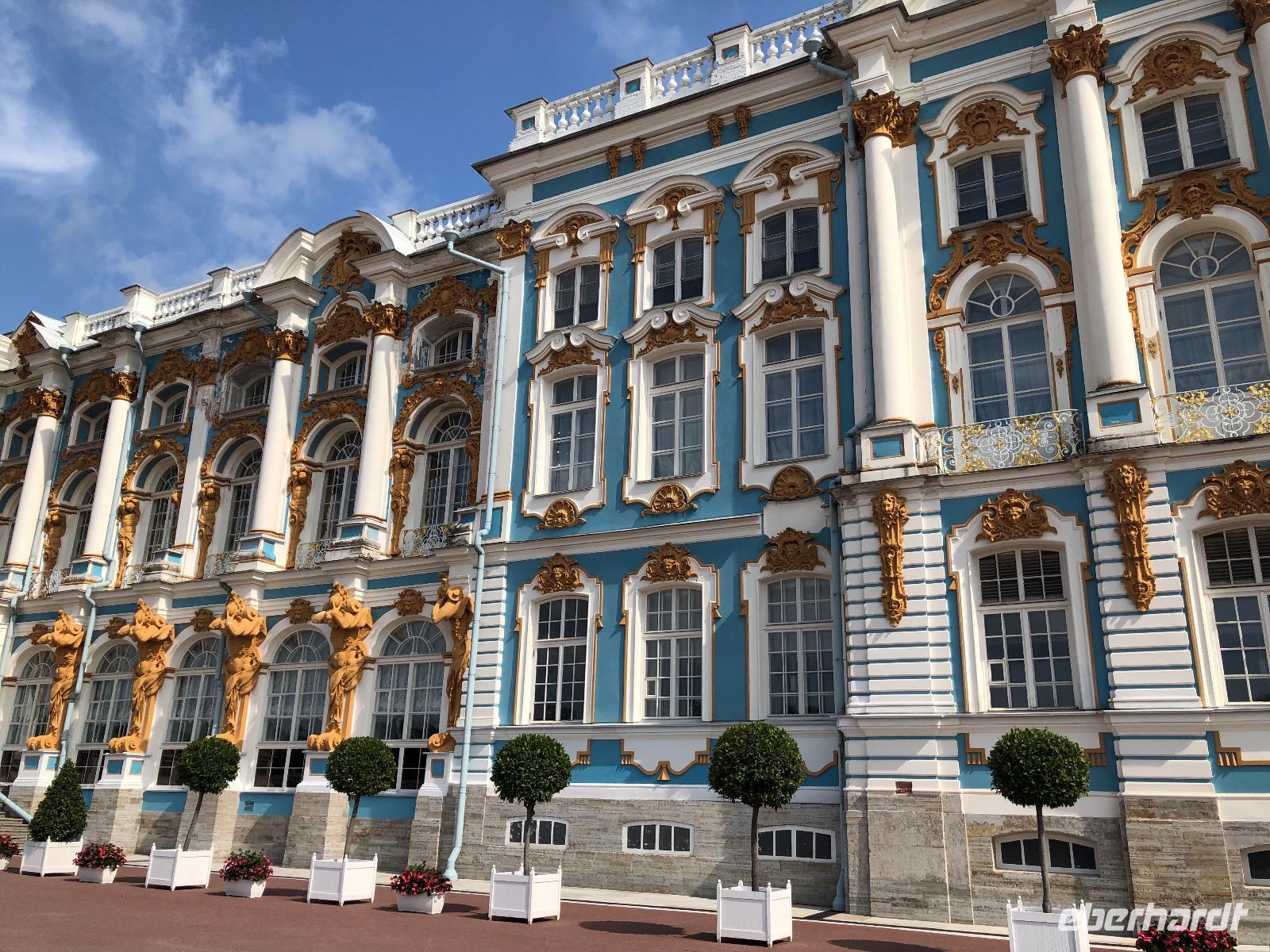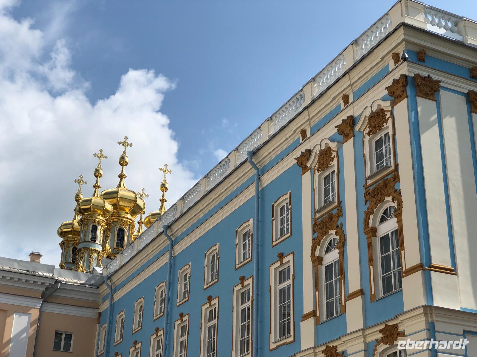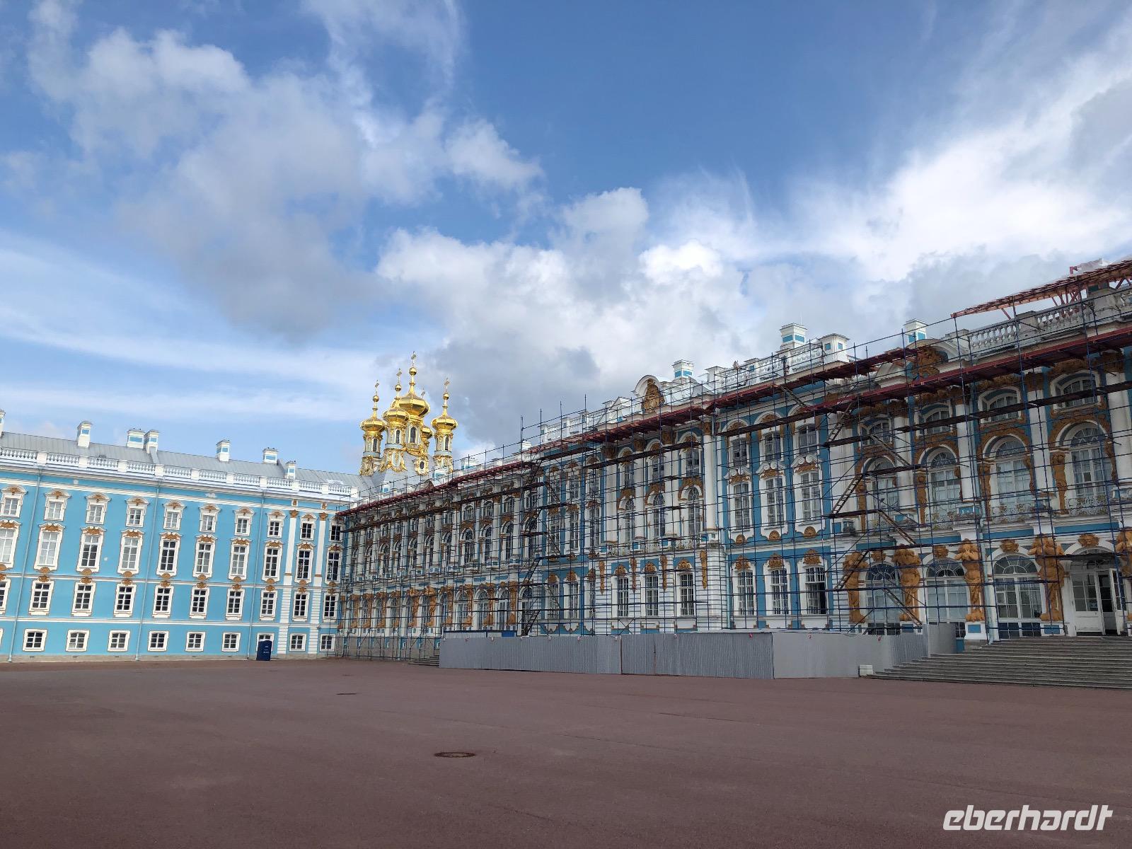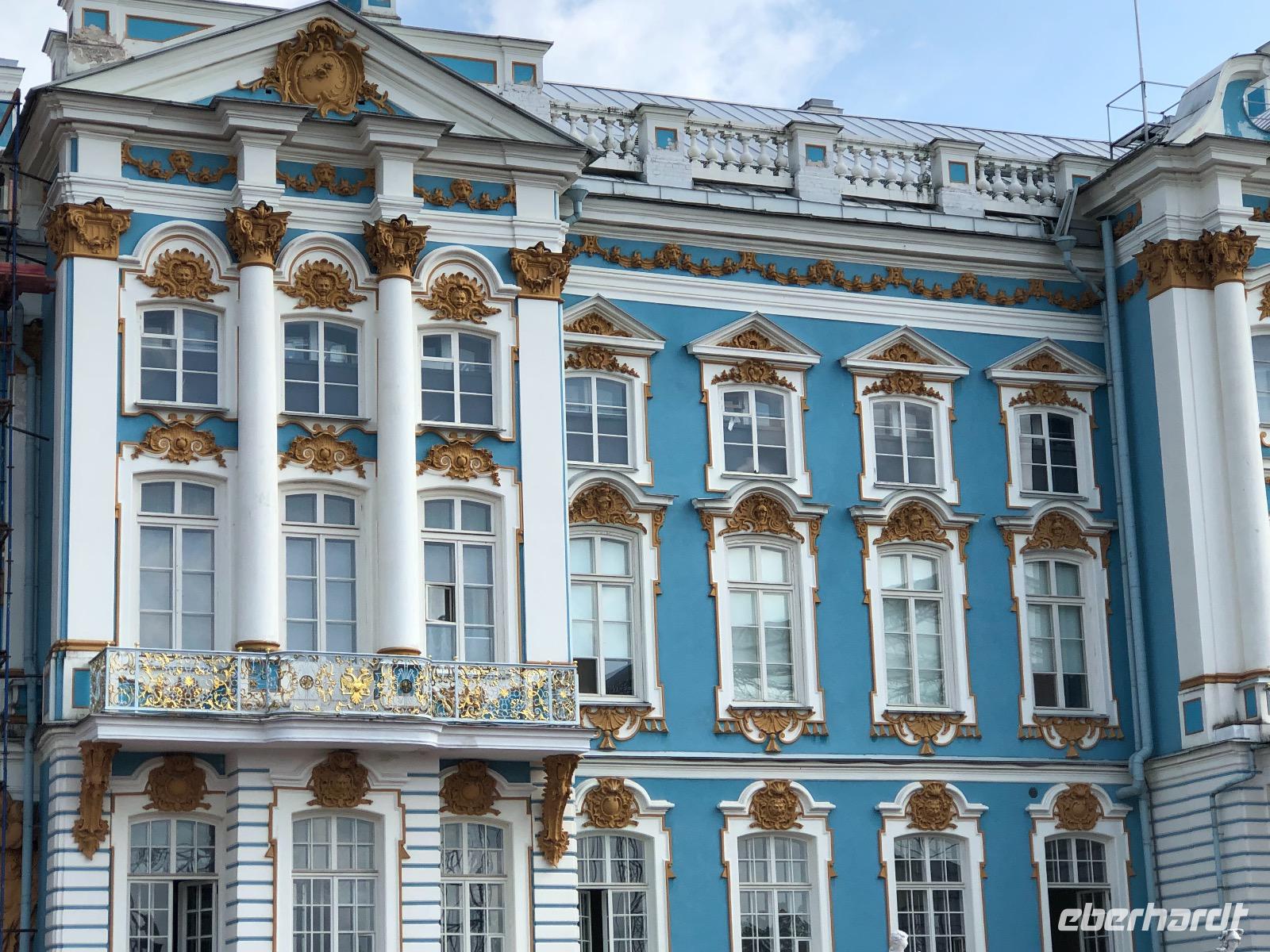 Am Nachmittag erwartet uns ein weiterer Palast. Wir fahren nach Zarskoje Selo. Wieder benötigen wir ca. eine Stunde. Die barocke Fassade des Katharinenpalastes leuchtet in hellem Blau. Sie ist dreihundert Meter lang und mit Säulen, Pfeilern und Skulpturen sowie kostbaren Fensterrahmen geschmückt. Allerdings ist ein großer Teil der Fassade eingerüstet. Nachdem wir durch einen Nebeneingang den Palast betreten haben, durchschreiten wir den großen Saal mit seinen Spiegeln, goldenen Schnitzereien und den großen Deckengemälden. In einem Speisesaal ist die Tafel mit kostbarem Geschirr gedeckt. Es gibt einen blauen Salon, einen grünen, ein Zimmer mit chinesischen Lackmöbeln und viele Räume mit unterschiedlicher Funktion und Ausstattung. Höhepunkt der Besichtigung ist natürlich das Bernsteinzimmer, in dem alles, aber auch alles aus Bernstein errichtet wurde. Was wir heute sehen, ist ein Nachbau, das Original ging in den Wirren des Zweiten Weltkrieges verloren.