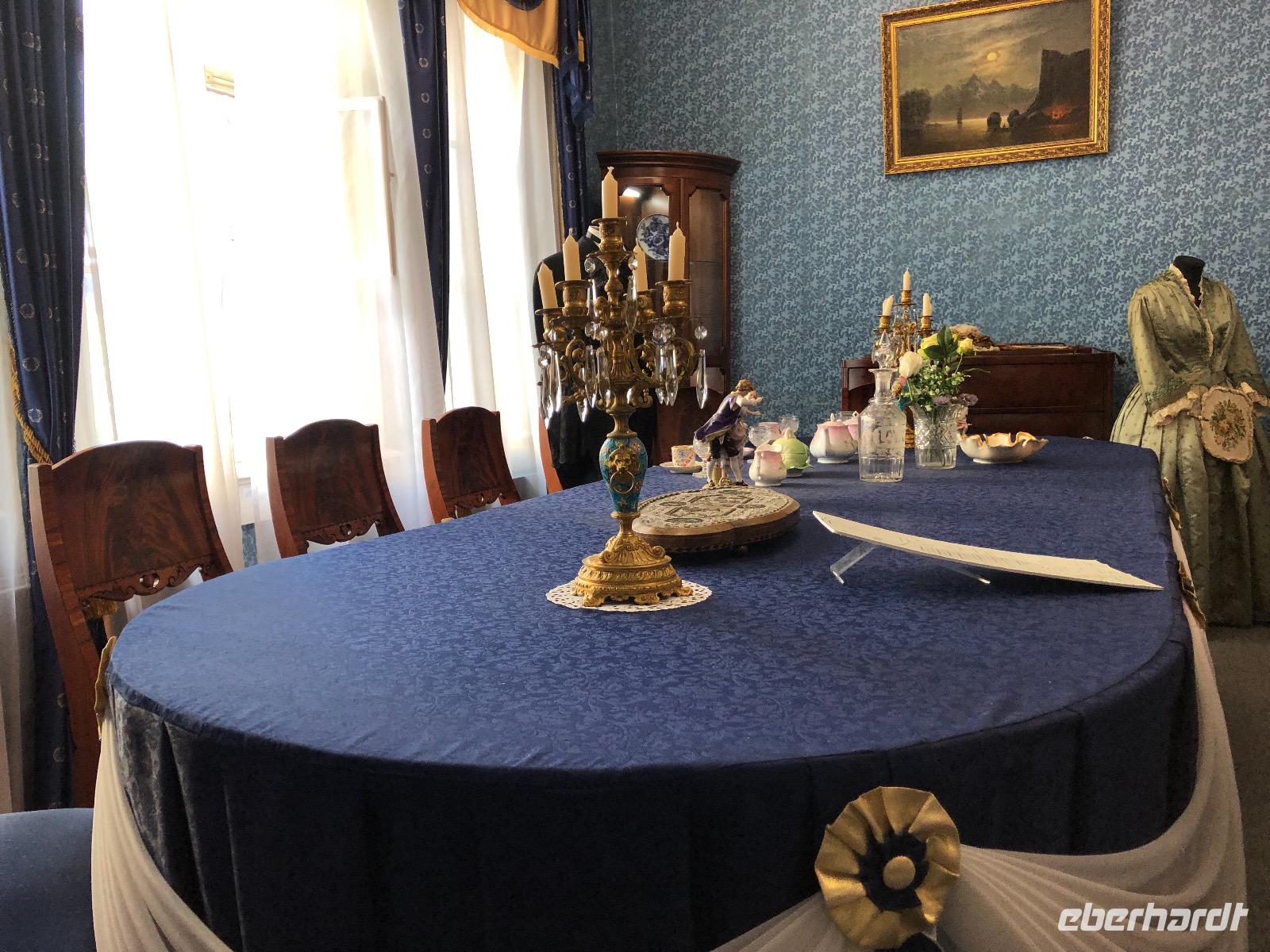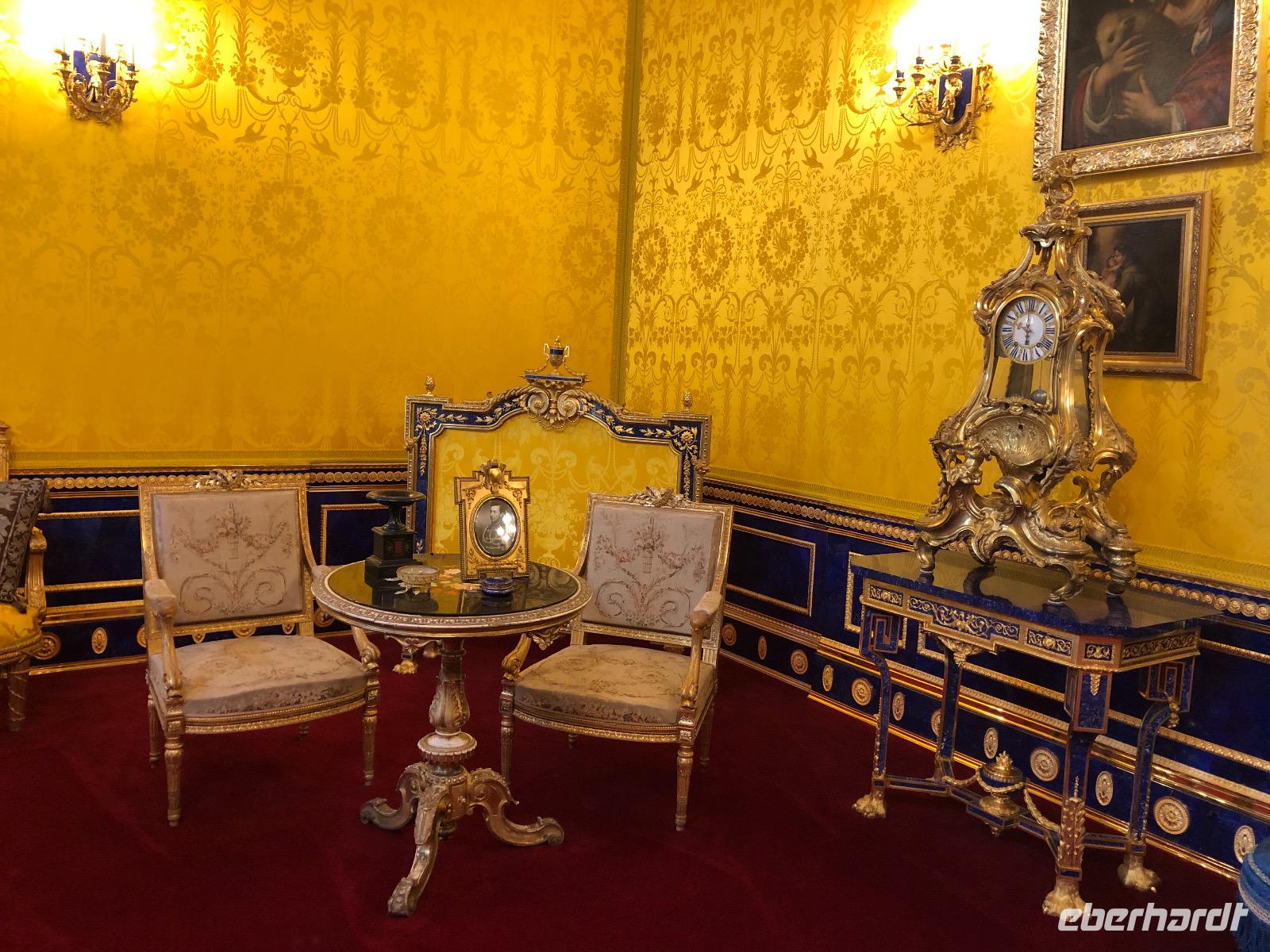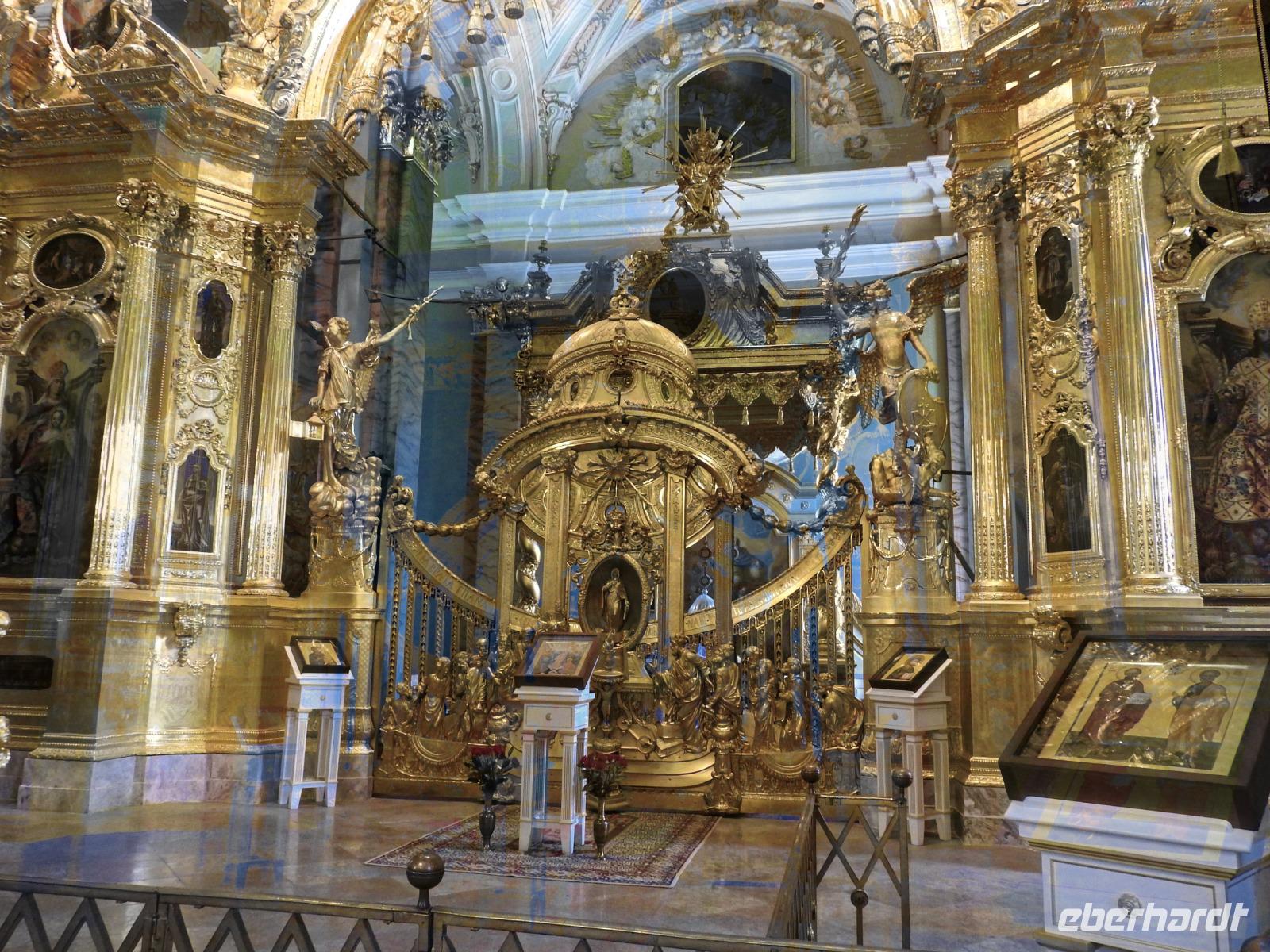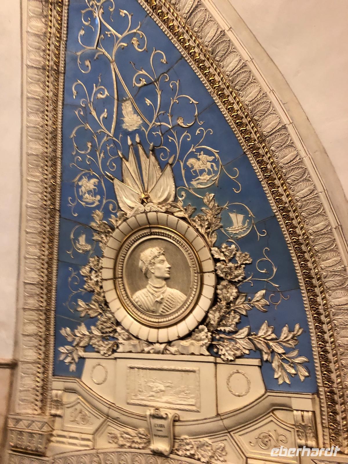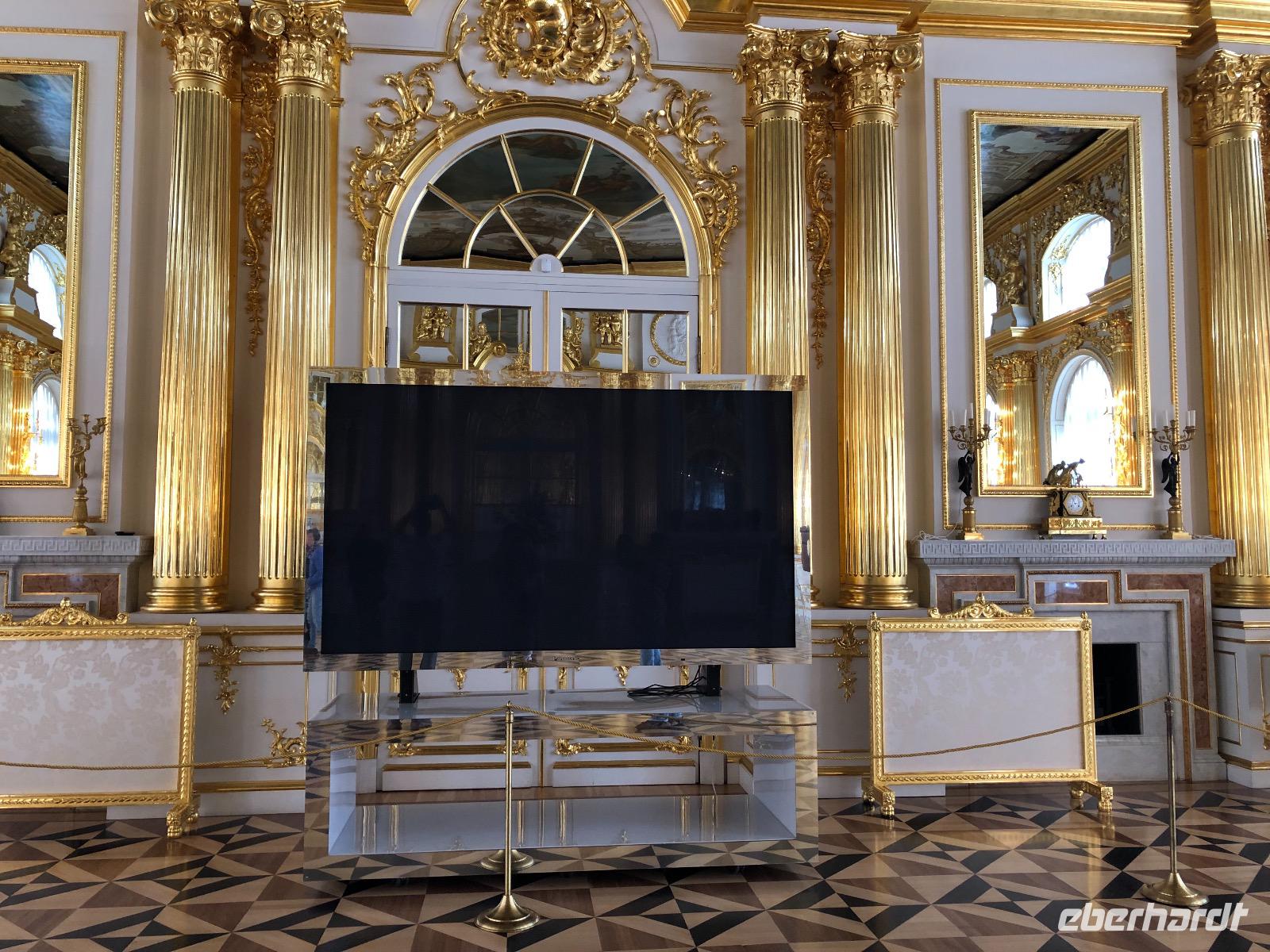 Am Nachmittag erwartet uns ein weiterer Palast. Wir fahren nach Zarskoje Selo. Wieder benötigen wir ca. eine Stunde. Die barocke Fassade des Katharinenpalastes leuchtet in hellem Blau. Sie ist dreihundert Meter lang und mit Säulen, Pfeilern und Skulpturen sowie kostbaren Fensterrahmen geschmückt. Allerdings ist ein großer Teil der Fassade eingerüstet. Nachdem wir durch einen Nebeneingang den Palast betreten haben, durchschreiten wir den großen Saal mit seinen Spiegeln, goldenen Schnitzereien und den großen Deckengemälden. In einem Speisesaal ist die Tafel mit kostbarem Geschirr gedeckt. Es gibt einen blauen Salon, einen grünen, ein Zimmer mit chinesischen Lackmöbeln und viele Räume mit unterschiedlicher Funktion und Ausstattung. Höhepunkt der Besichtigung ist natürlich das Bernsteinzimmer, in dem alles, aber auch alles aus Bernstein errichtet wurde. Was wir heute sehen, ist ein Nachbau, das Original ging in den Wirren des Zweiten Weltkrieges verloren.