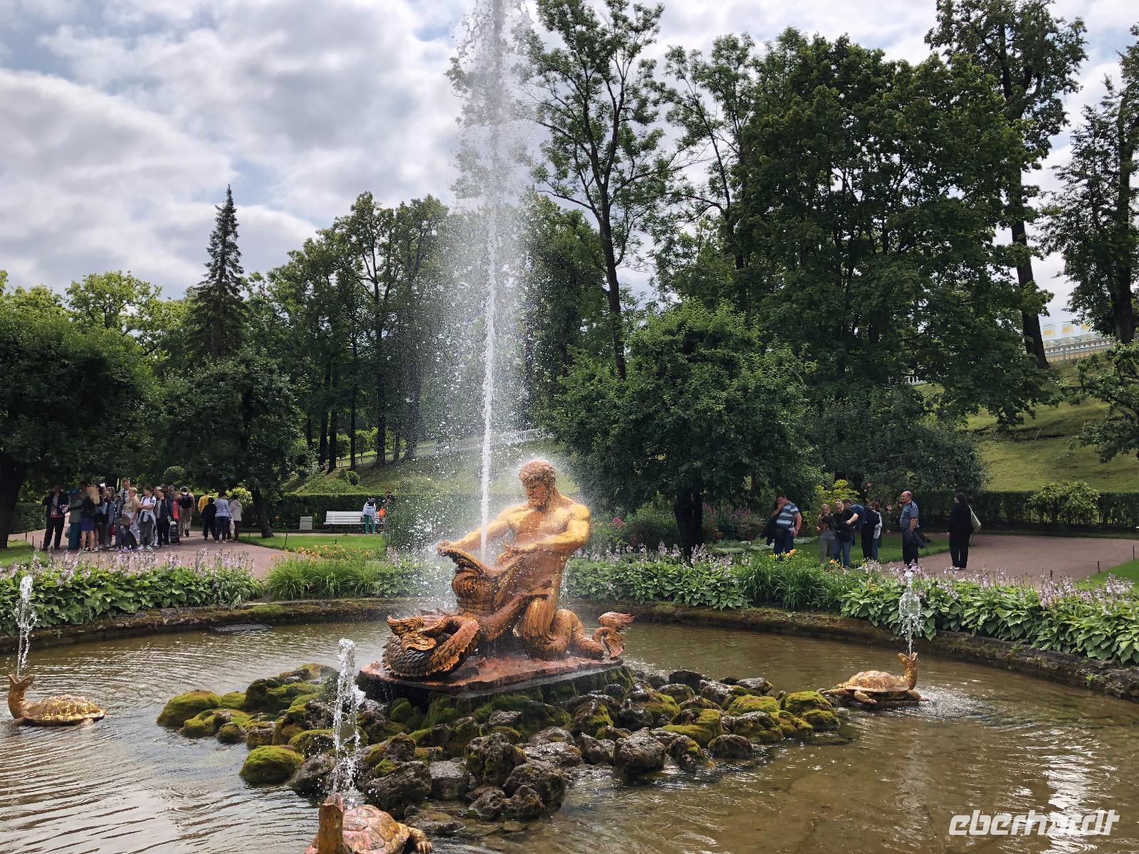 Gold und Prunk erwartet uns heute. Am Vormittag fahren wir nach Peterhof. Etwa eine Stunde dauert die Fahrt. Unser Bus hält oberhalb des Grand Palace, also des Großen Palastes. Entlang einiger Souvenirstände spazieren wir zur Anlage. Hier zeigt uns Irina, wo wir nachher essen können. Wir erreichen den Palast. Links von uns liegt die fantastische Springbrunnenanlage, die große Kaskade. Wir haben Glück und die Sonne lässt sich blicken, was zur Folge hat, dass die vielen goldenen Skulpturen noch schöner aussehen. Irina unternimmt mit uns einen Spaziergang durch weite Teile des Parks. Wir kommen an Adam und Eva vorbei, deren Figuren weitere Springbrunnen schmücken. Nach einiger Zeit erreichen wir das Ufer der Ostsee. Von hier hatte sich Peter der Große einen direkten Zugang zu seiner Palastanlage bauen lassen. Zum Ende der Besichtigung haben wir Freizeit zum individuellen Spaziergang und/oder zum Mittagessen. In einem Selbstbedienungsrestaurant probieren wir russische Soljanka aus Plastikschüsseln und der Kaffee schmeckt ausgezeichnet.