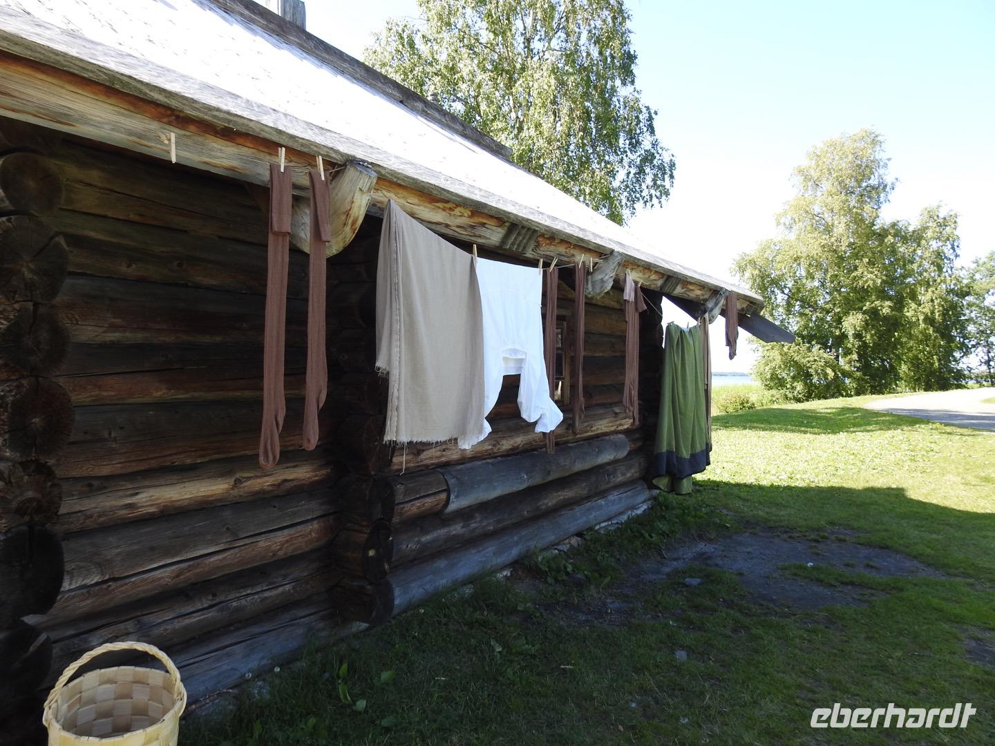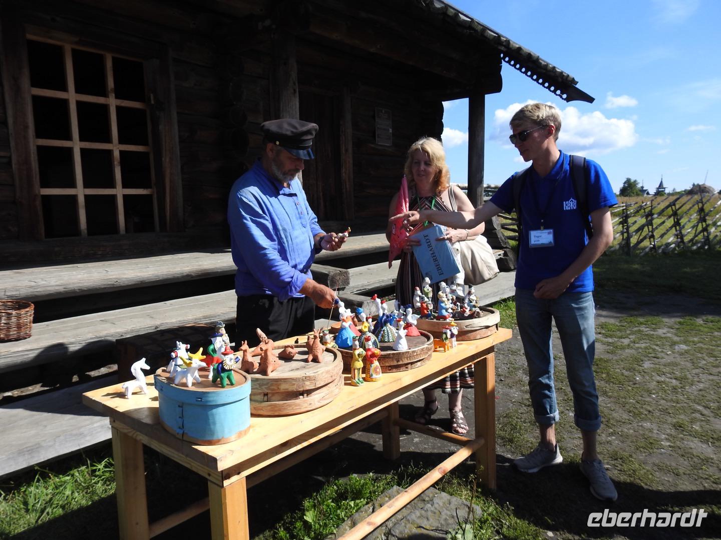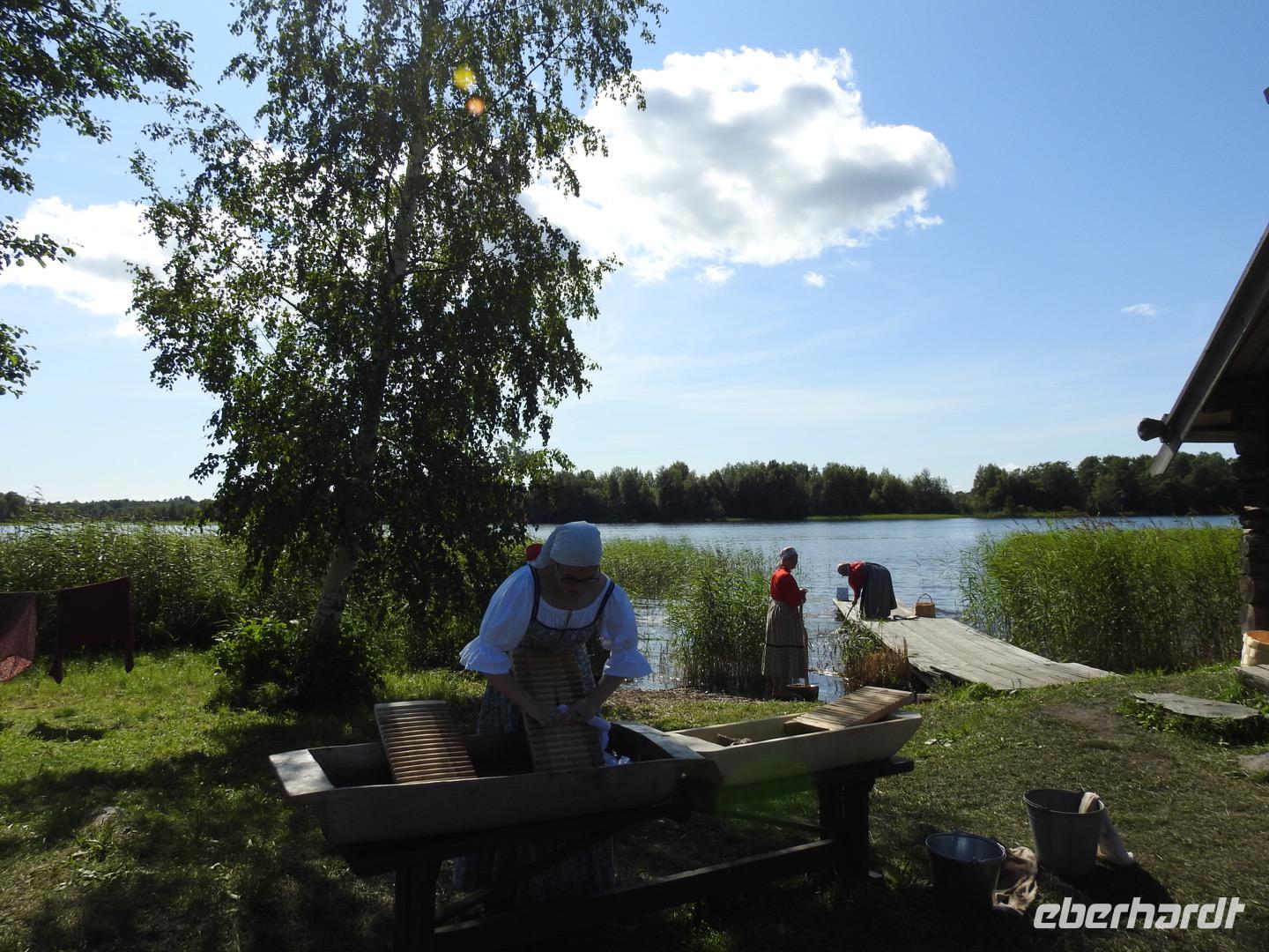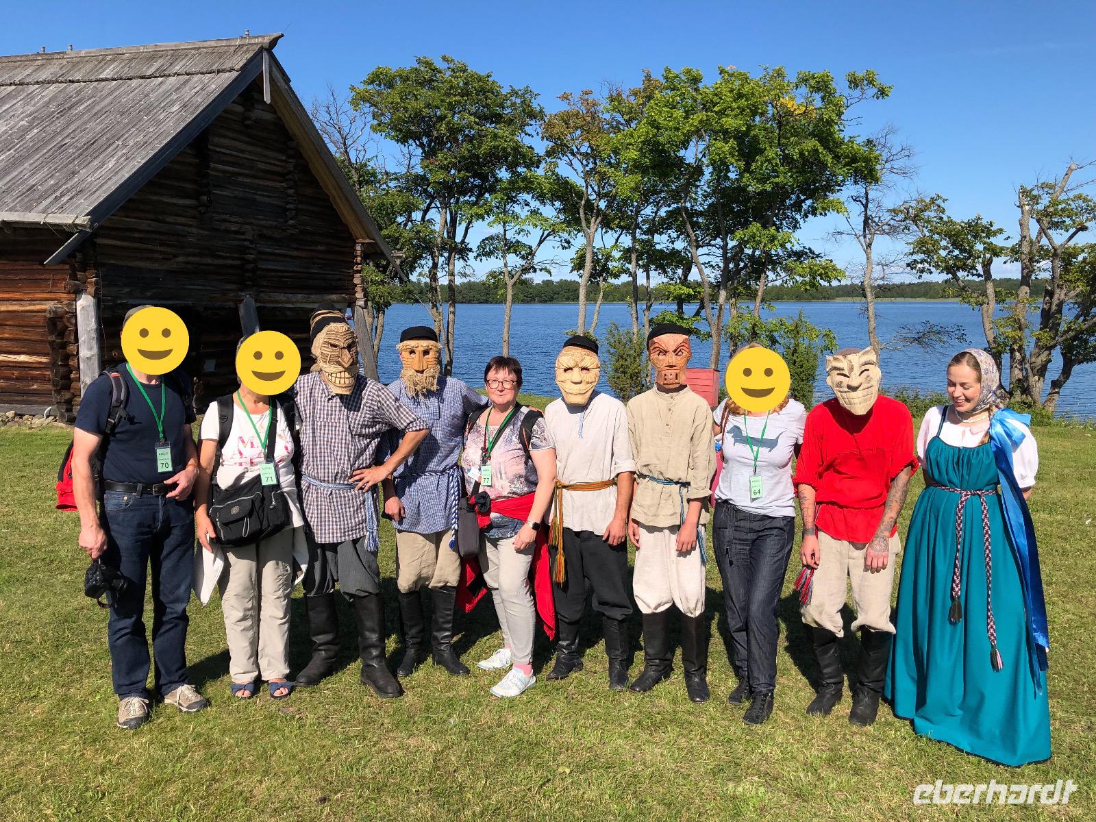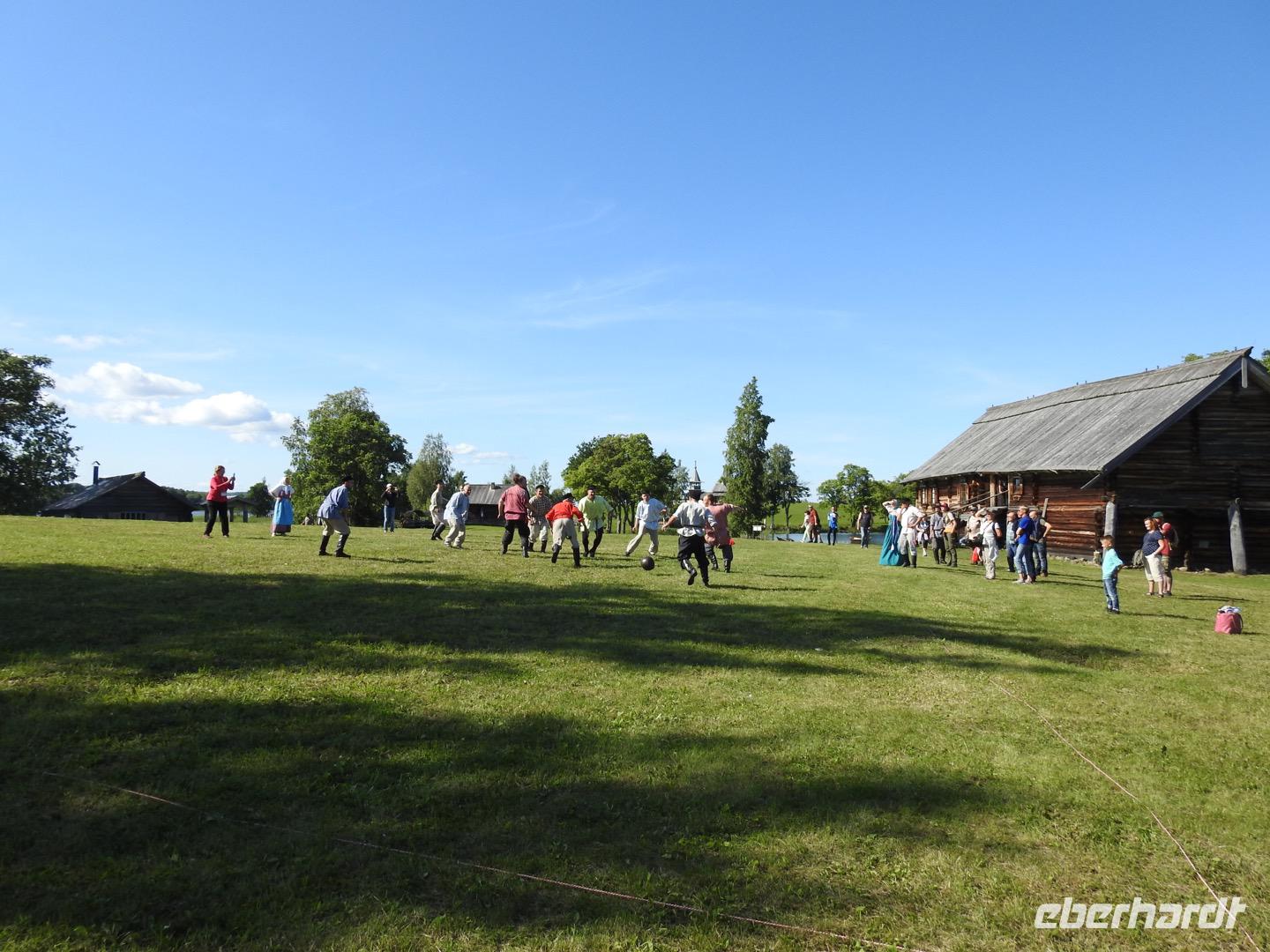 Besonders neugierig waren wir auf die Christi-Verklärungskirche, die auf allen Bildern, die wir vorher von Kishi gesehen haben, abgebildet ist. Sie sieht tatsächlich aus wie auf einer Postkarte. Beeindruckend blinken die zweiundzwanzig Zwiebeltürmchen auf dem hellen Holzbau. Jegor erklärt uns, wie die Kirche gebaut wurde und warum sie dreihundert Jahre bestehen konnte. Gleich nebenan befindet sich die Maria-Schutz-Kirche mit ihrem achteckigen Turm und ihren acht Zwiebeltürmchen. Der zu beiden Gebäuden zugehörige Glockenturm befindet sich außerhalb. Wir besichtigen ein altes Bauernhaus, in dem wir erfahren, wie schwer das Leben seiner Bewohner früher war. Hier sitzt auch eine junge Frau an einem Webstuhl und präsentiert das alte Handwerk. Überall haben wir jetzt die Gelegenheit kennenzulernen, wie die Menschen hier früher gelebt und gearbeitet haben. Und wir dürfen überall mitmachen! Wäsche waschen, im Fluss oder am Waschbrett, Wäsche klopfen u.s.w. Hier stellt jemand Figuren her, durch die man pfeifen kann, dort wird geschnitzt. Zum Abschluss lädt uns Jegor ein, einem traditionellen Ballspiel beizuwohnen. Aus einem Bauernhaus kommt eine Gruppe junger Bauernburschen, die sich sofort mit den davorstehenden Jungs in die Haare kriegen. Ein Wort gibt das andere und auch wer kein Russisch kann, versteht, worum es geht. Beide Gruppen beanspruchen die Fischgründe für sich. Als sie anfangen, sich zu prügeln, schreitet ein weiser Mann ein, der ihnen rät, den Konflikt anderweitig auszutragen, mit eben jenem Ballspiel. Und so ist es dann auch. Das Spiel ähnelt eher dem Raufball, denn es geht lediglich darum, den Ball über die Linie der Gegenmannschaft aus dem Feld zu schlagen. Eine Mannschaft gewinnt und alle sind glücklich, dass wir zugeschaut haben. Jetzt zeigen die jungen Männer uns noch stolz ihre Holzmasken und lassen sich gern fotografieren. Wir fühlen uns willkommen. Bis zur Rückfahrt nach Petrosawodsk ist es noch Zeit, einen Kaffee zu genießen. Nach der Rückfahrt und dem Check In im Hotel kehren wir zum Abendessen in ein karelisches Restaurant ein. Zur Vorspeise gibt es mit Hirsebrei gefülltes Brot und Kartoffelsalat. Das Hauptgericht sind Kartoffeln mit viel Fleisch in einem Töpfchen zubereitet, das mit Brot verschlossen ist. Kaffee und Kuchen runden die Sache ab. Nicht zu vergessen sind die vier Schnäpse aus verschiedenen Beeren und Kräutern der Region. Wir sind so gut gelaunt, dass wir den Abend mit gemeinsam gesungenen Liedern ausklingen lassen.
