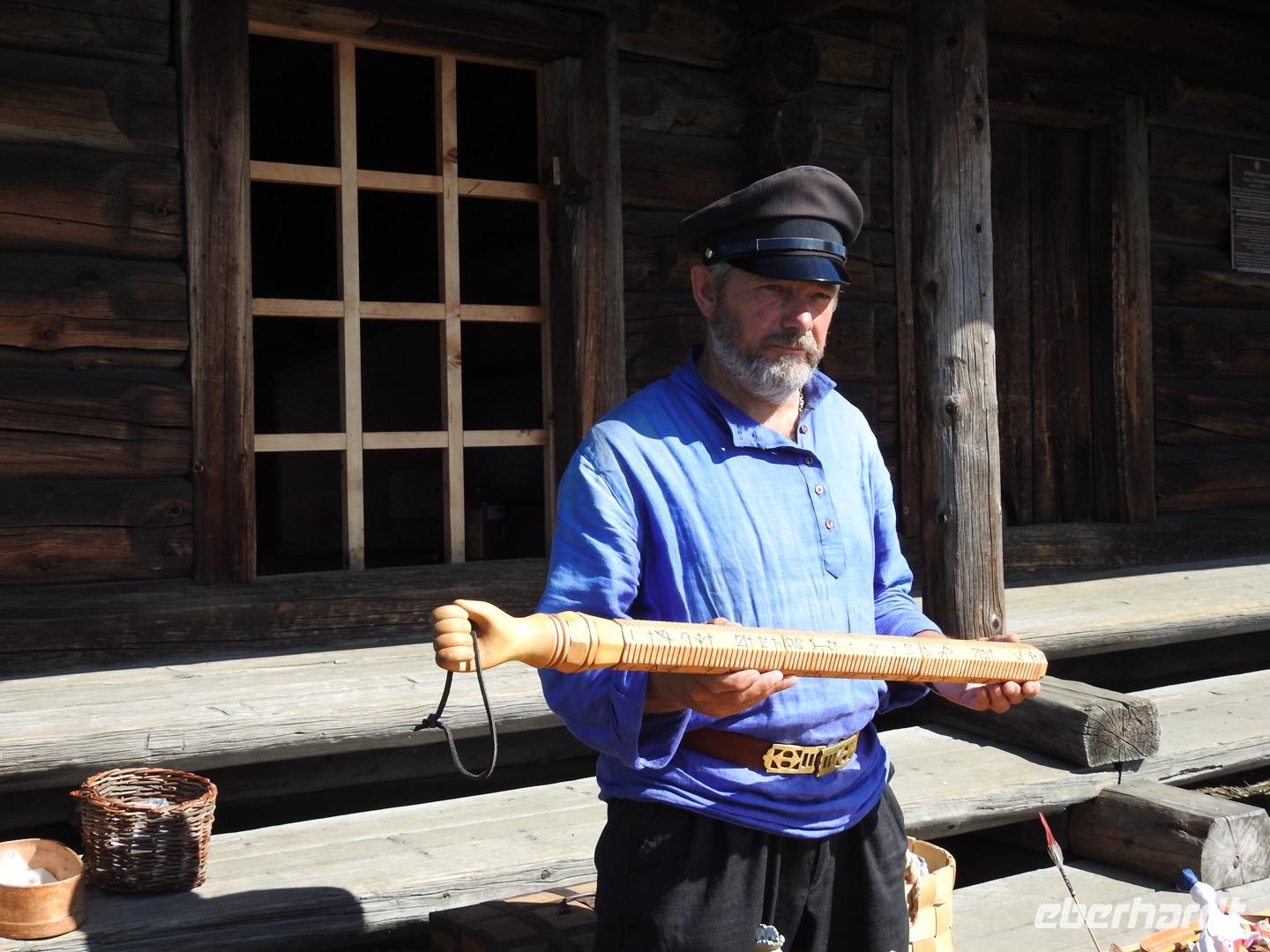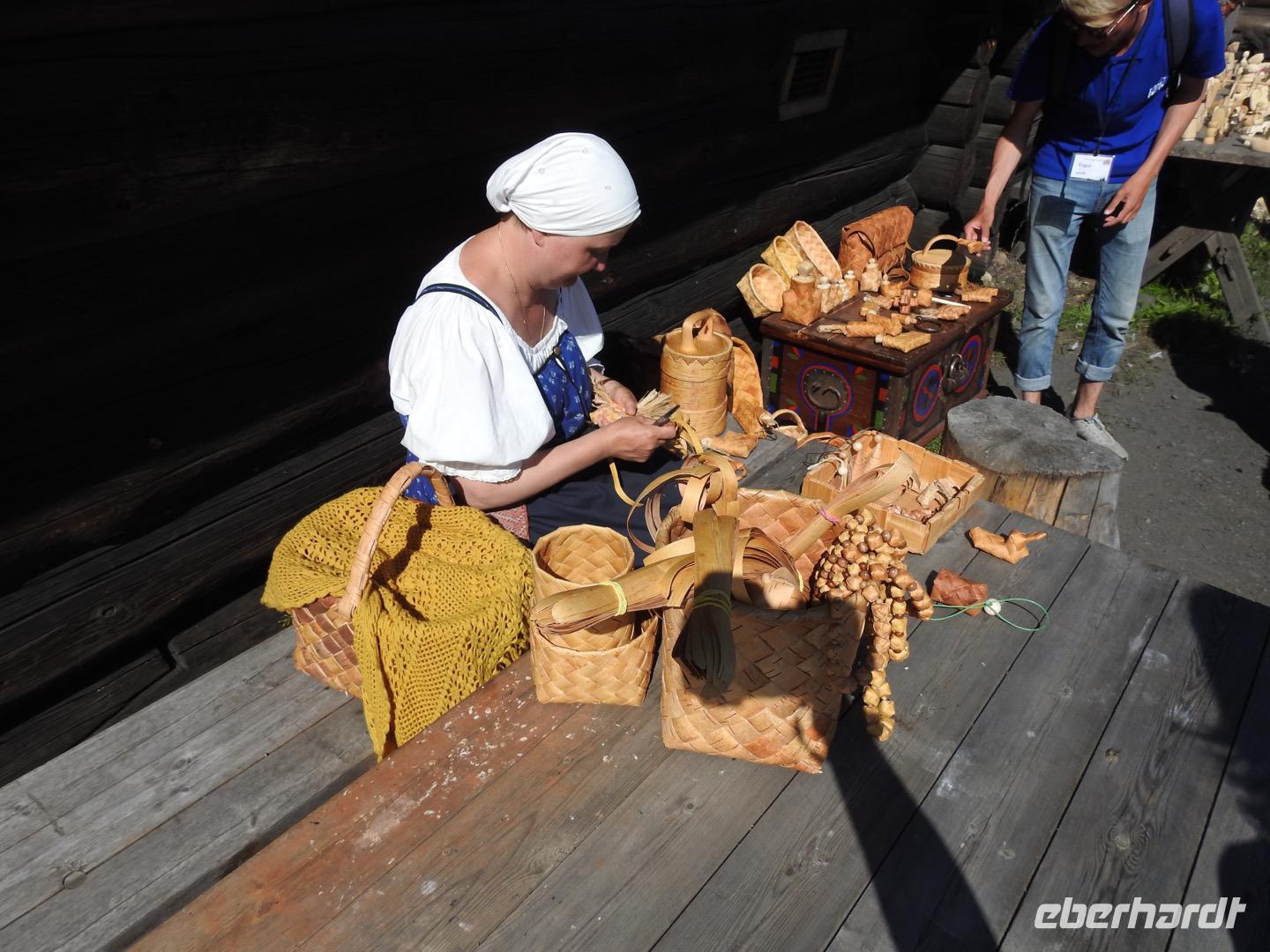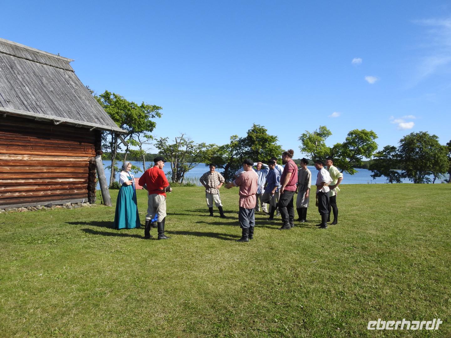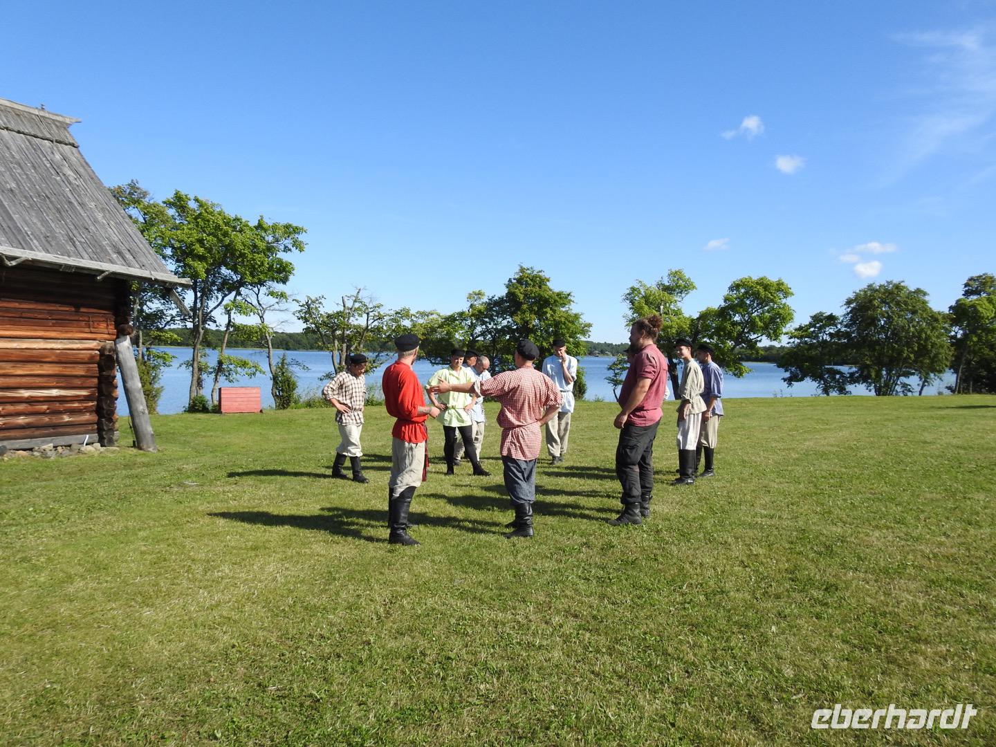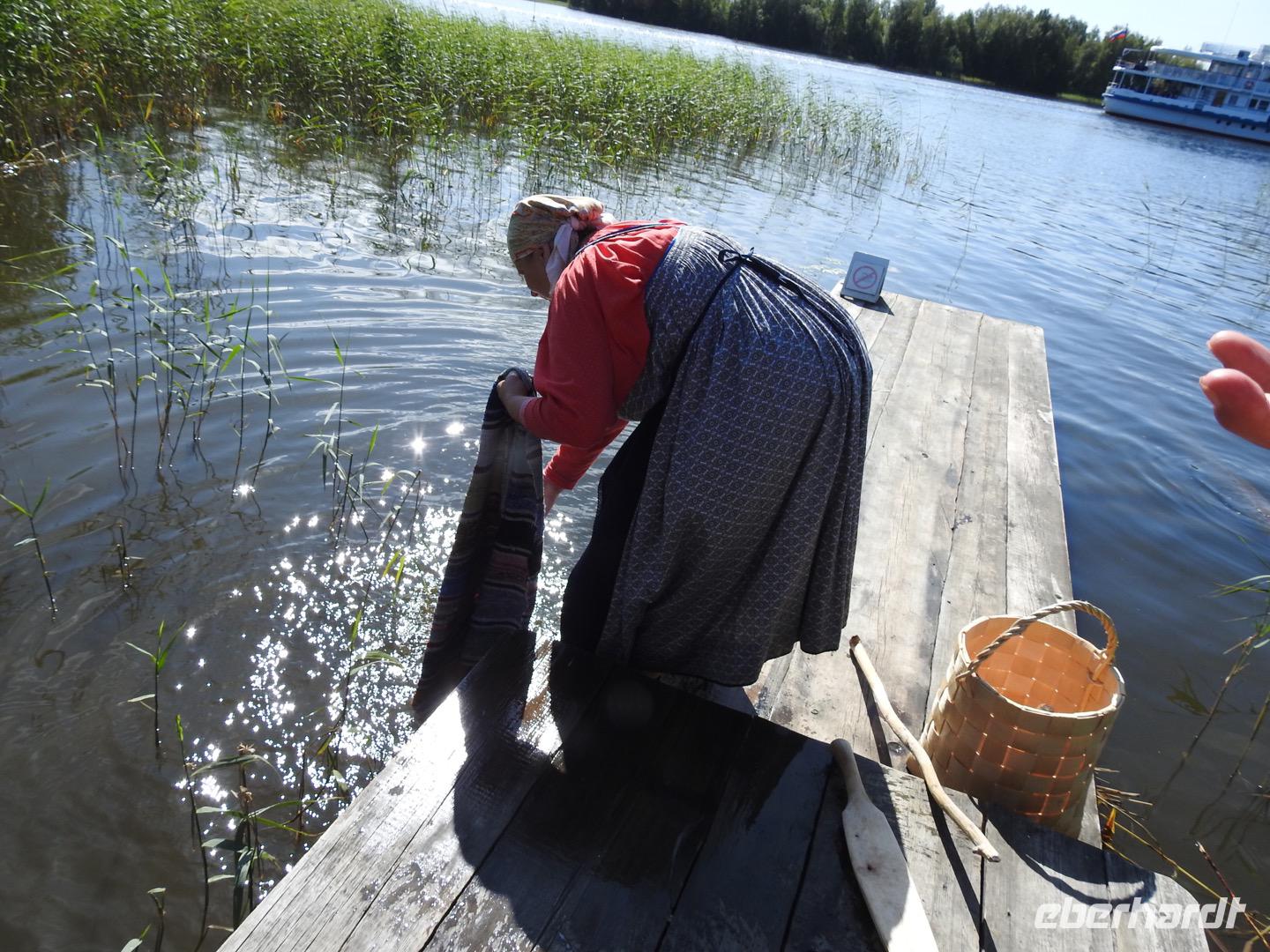 Besonders neugierig waren wir auf die Christi-Verklärungskirche, die auf allen Bildern, die wir vorher von Kishi gesehen haben, abgebildet ist. Sie sieht tatsächlich aus wie auf einer Postkarte. Beeindruckend blinken die zweiundzwanzig Zwiebeltürmchen auf dem hellen Holzbau. Jegor erklärt uns, wie die Kirche gebaut wurde und warum sie dreihundert Jahre bestehen konnte. Gleich nebenan befindet sich die Maria-Schutz-Kirche mit ihrem achteckigen Turm und ihren acht Zwiebeltürmchen. Der zu beiden Gebäuden zugehörige Glockenturm befindet sich außerhalb. Wir besichtigen ein altes Bauernhaus, in dem wir erfahren, wie schwer das Leben seiner Bewohner früher war. Hier sitzt auch eine junge Frau an einem Webstuhl und präsentiert das alte Handwerk. Überall haben wir jetzt die Gelegenheit kennenzulernen, wie die Menschen hier früher gelebt und gearbeitet haben. Und wir dürfen überall mitmachen! Wäsche waschen, im Fluss oder am Waschbrett, Wäsche klopfen u.s.w. Hier stellt jemand Figuren her, durch die man pfeifen kann, dort wird geschnitzt. Zum Abschluss lädt uns Jegor ein, einem traditionellen Ballspiel beizuwohnen. Aus einem Bauernhaus kommt eine Gruppe junger Bauernburschen, die sich sofort mit den davorstehenden Jungs in die Haare kriegen. Ein Wort gibt das andere und auch wer kein Russisch kann, versteht, worum es geht. Beide Gruppen beanspruchen die Fischgründe für sich. Als sie anfangen, sich zu prügeln, schreitet ein weiser Mann ein, der ihnen rät, den Konflikt anderweitig auszutragen, mit eben jenem Ballspiel. Und so ist es dann auch. Das Spiel ähnelt eher dem Raufball, denn es geht lediglich darum, den Ball über die Linie der Gegenmannschaft aus dem Feld zu schlagen. Eine Mannschaft gewinnt und alle sind glücklich, dass wir zugeschaut haben. Jetzt zeigen die jungen Männer uns noch stolz ihre Holzmasken und lassen sich gern fotografieren. Wir fühlen uns willkommen. Bis zur Rückfahrt nach Petrosawodsk ist es noch Zeit, einen Kaffee zu genießen. Nach der Rückfahrt und dem Check In im Hotel kehren wir zum Abendessen in ein karelisches Restaurant ein. Zur Vorspeise gibt es mit Hirsebrei gefülltes Brot und Kartoffelsalat. Das Hauptgericht sind Kartoffeln mit viel Fleisch in einem Töpfchen zubereitet, das mit Brot verschlossen ist. Kaffee und Kuchen runden die Sache ab. Nicht zu vergessen sind die vier Schnäpse aus verschiedenen Beeren und Kräutern der Region. Wir sind so gut gelaunt, dass wir den Abend mit gemeinsam gesungenen Liedern ausklingen lassen.