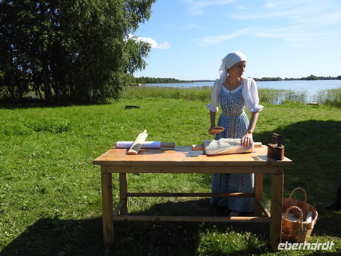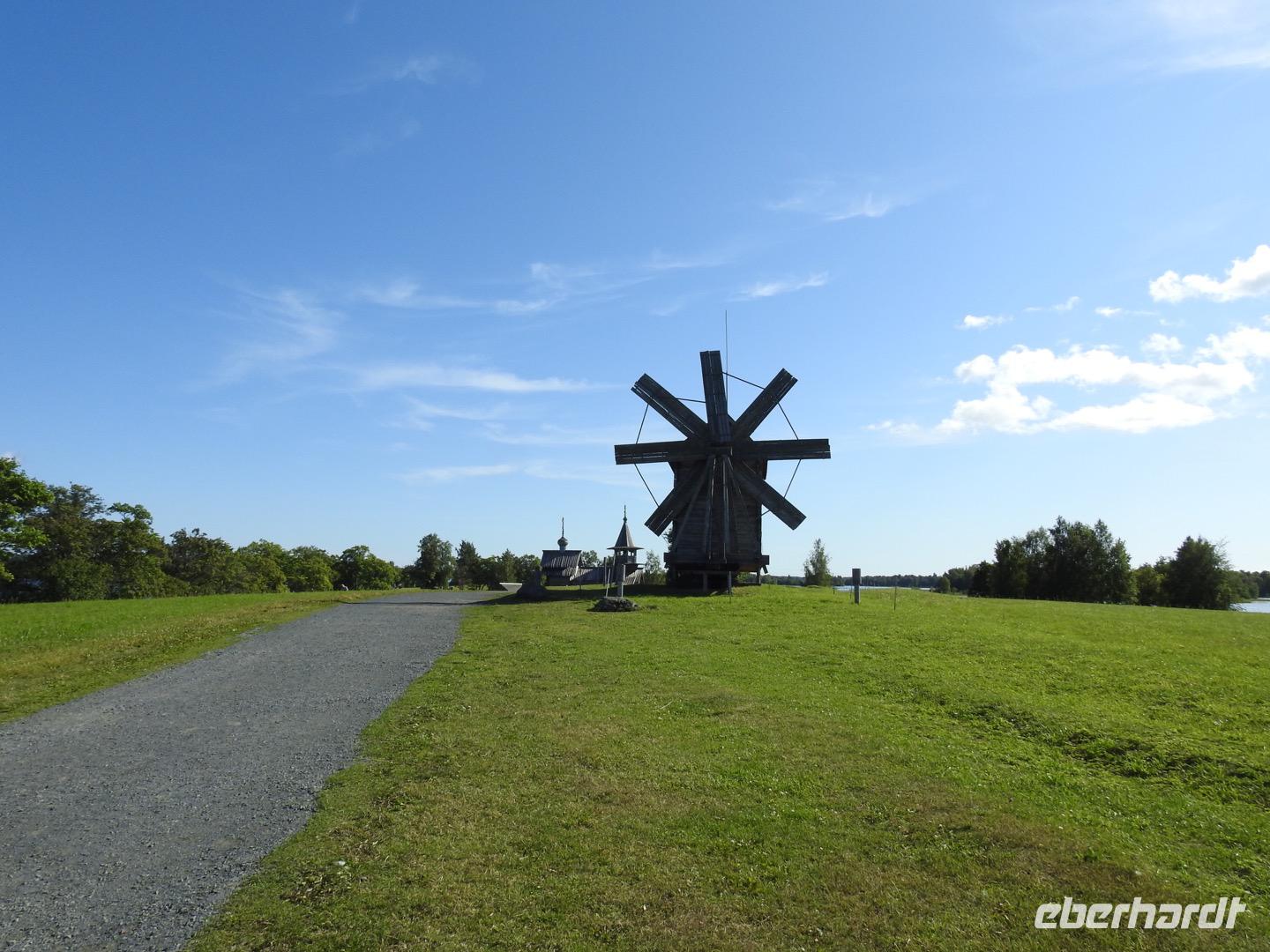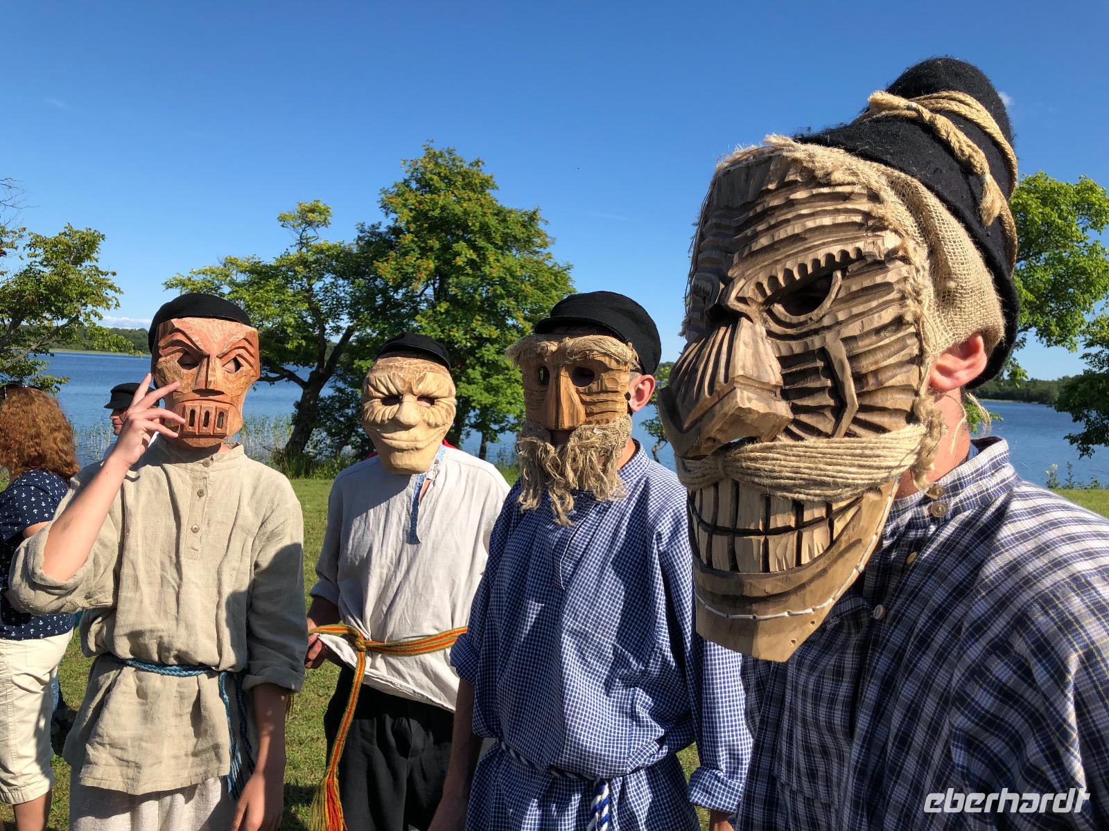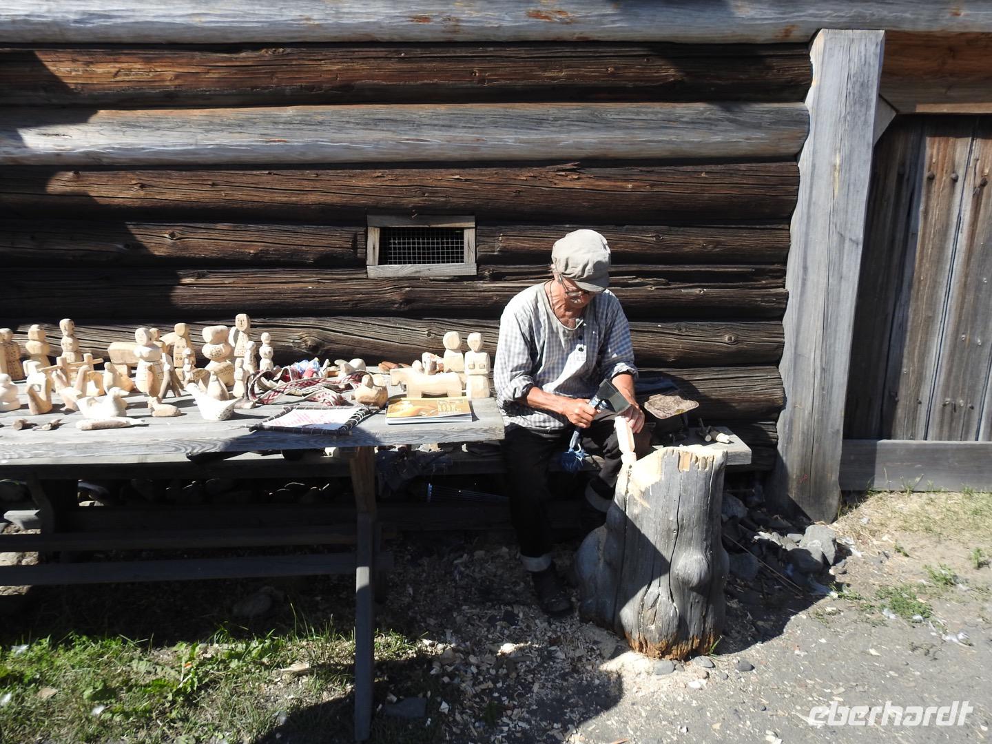 Besonders neugierig waren wir auf die Christi-Verklärungskirche, die auf allen Bildern, die wir vorher von Kishi gesehen haben, abgebildet ist. Sie sieht tatsächlich aus wie auf einer Postkarte. Beeindruckend blinken die zweiundzwanzig Zwiebeltürmchen auf dem hellen Holzbau. Jegor erklärt uns, wie die Kirche gebaut wurde und warum sie dreihundert Jahre bestehen konnte. Gleich nebenan befindet sich die Maria-Schutz-Kirche mit ihrem achteckigen Turm und ihren acht Zwiebeltürmchen. Der zu beiden Gebäuden zugehörige Glockenturm befindet sich außerhalb. Wir besichtigen ein altes Bauernhaus, in dem wir erfahren, wie schwer das Leben seiner Bewohner früher war. Hier sitzt auch eine junge Frau an einem Webstuhl und präsentiert das alte Handwerk. Überall haben wir jetzt die Gelegenheit kennenzulernen, wie die Menschen hier früher gelebt und gearbeitet haben. Und wir dürfen überall mitmachen! Wäsche waschen, im Fluss oder am Waschbrett, Wäsche klopfen u.s.w. Hier stellt jemand Figuren her, durch die man pfeifen kann, dort wird geschnitzt. Zum Abschluss lädt uns Jegor ein, einem traditionellen Ballspiel beizuwohnen. Aus einem Bauernhaus kommt eine Gruppe junger Bauernburschen, die sich sofort mit den davorstehenden Jungs in die Haare kriegen. Ein Wort gibt das andere und auch wer kein Russisch kann, versteht, worum es geht. Beide Gruppen beanspruchen die Fischgründe für sich. Als sie anfangen, sich zu prügeln, schreitet ein weiser Mann ein, der ihnen rät, den Konflikt anderweitig auszutragen, mit eben jenem Ballspiel. Und so ist es dann auch. Das Spiel ähnelt eher dem Raufball, denn es geht lediglich darum, den Ball über die Linie der Gegenmannschaft aus dem Feld zu schlagen. Eine Mannschaft gewinnt und alle sind glücklich, dass wir zugeschaut haben. Jetzt zeigen die jungen Männer uns noch stolz ihre Holzmasken und lassen sich gern fotografieren. Wir fühlen uns willkommen. Bis zur Rückfahrt nach Petrosawodsk ist es noch Zeit, einen Kaffee zu genießen. Nach der Rückfahrt und dem Check In im Hotel kehren wir zum Abendessen in ein karelisches Restaurant ein. Zur Vorspeise gibt es mit Hirsebrei gefülltes Brot und Kartoffelsalat. Das Hauptgericht sind Kartoffeln mit viel Fleisch in einem Töpfchen zubereitet, das mit Brot verschlossen ist. Kaffee und Kuchen runden die Sache ab. Nicht zu vergessen sind die vier Schnäpse aus verschiedenen Beeren und Kräutern der Region. Wir sind so gut gelaunt, dass wir den Abend mit gemeinsam gesungenen Liedern ausklingen lassen.