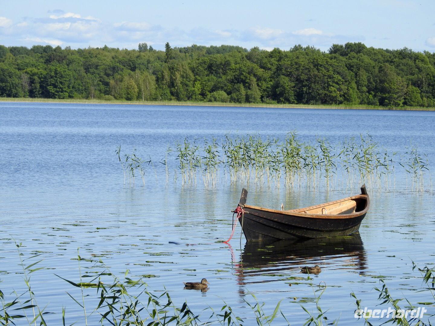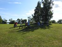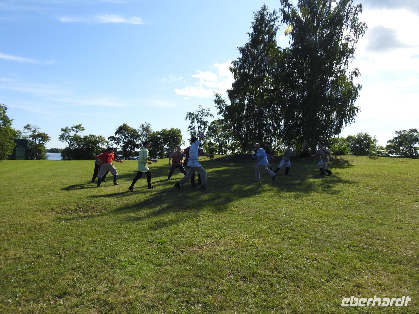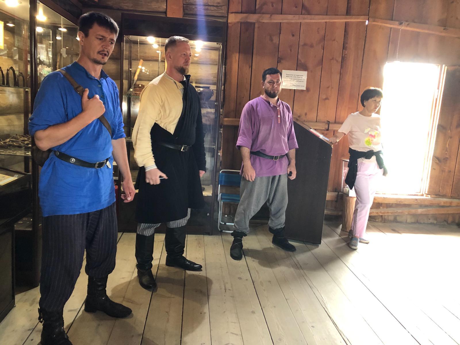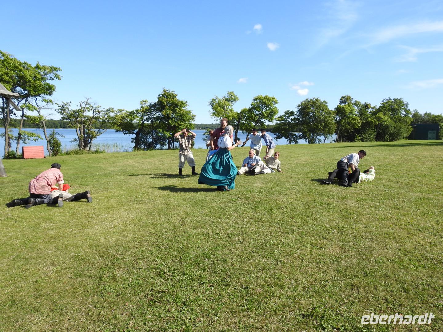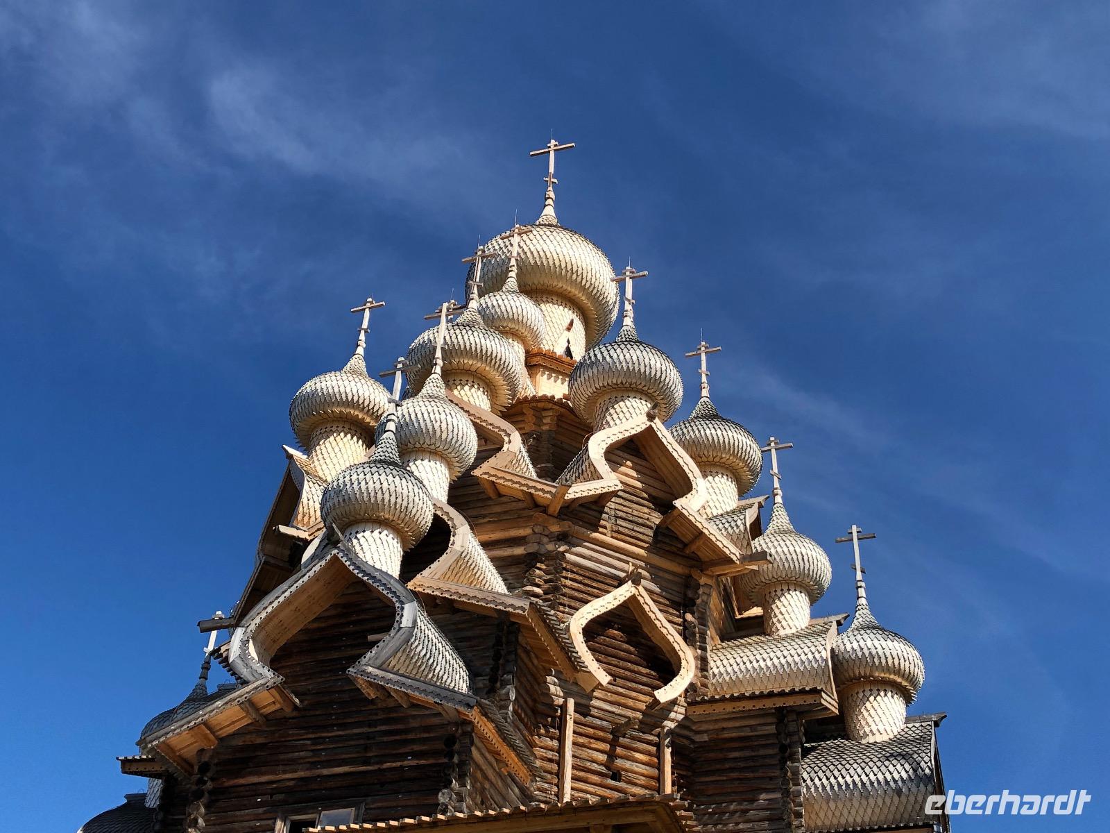 Besonders neugierig waren wir auf die Christi-Verklärungskirche, die auf allen Bildern, die wir vorher von Kishi gesehen haben, abgebildet ist. Sie sieht tatsächlich aus wie auf einer Postkarte. Beeindruckend blinken die zweiundzwanzig Zwiebeltürmchen auf dem hellen Holzbau. Jegor erklärt uns, wie die Kirche gebaut wurde und warum sie dreihundert Jahre bestehen konnte. Gleich nebenan befindet sich die Maria-Schutz-Kirche mit ihrem achteckigen Turm und ihren acht Zwiebeltürmchen. Der zu beiden Gebäuden zugehörige Glockenturm befindet sich außerhalb. Wir besichtigen ein altes Bauernhaus, in dem wir erfahren, wie schwer das Leben seiner Bewohner früher war. Hier sitzt auch eine junge Frau an einem Webstuhl und präsentiert das alte Handwerk. Überall haben wir jetzt die Gelegenheit kennenzulernen, wie die Menschen hier früher gelebt und gearbeitet haben. Und wir dürfen überall mitmachen! Wäsche waschen, im Fluss oder am Waschbrett, Wäsche klopfen u.s.w. Hier stellt jemand Figuren her, durch die man pfeifen kann, dort wird geschnitzt. Zum Abschluss lädt uns Jegor ein, einem traditionellen Ballspiel beizuwohnen. Aus einem Bauernhaus kommt eine Gruppe junger Bauernburschen, die sich sofort mit den davorstehenden Jungs in die Haare kriegen. Ein Wort gibt das andere und auch wer kein Russisch kann, versteht, worum es geht. Beide Gruppen beanspruchen die Fischgründe für sich. Als sie anfangen, sich zu prügeln, schreitet ein weiser Mann ein, der ihnen rät, den Konflikt anderweitig auszutragen, mit eben jenem Ballspiel. Und so ist es dann auch. Das Spiel ähnelt eher dem Raufball, denn es geht lediglich darum, den Ball über die Linie der Gegenmannschaft aus dem Feld zu schlagen. Eine Mannschaft gewinnt und alle sind glücklich, dass wir zugeschaut haben. Jetzt zeigen die jungen Männer uns noch stolz ihre Holzmasken und lassen sich gern fotografieren. Wir fühlen uns willkommen. Bis zur Rückfahrt nach Petrosawodsk ist es noch Zeit, einen Kaffee zu genießen. Nach der Rückfahrt und dem Check In im Hotel kehren wir zum Abendessen in ein karelisches Restaurant ein. Zur Vorspeise gibt es mit Hirsebrei gefülltes Brot und Kartoffelsalat. Das Hauptgericht sind Kartoffeln mit viel Fleisch in einem Töpfchen zubereitet, das mit Brot verschlossen ist. Kaffee und Kuchen runden die Sache ab. Nicht zu vergessen sind die vier Schnäpse aus verschiedenen Beeren und Kräutern der Region. Wir sind so gut gelaunt, dass wir den Abend mit gemeinsam gesungenen Liedern ausklingen lassen.