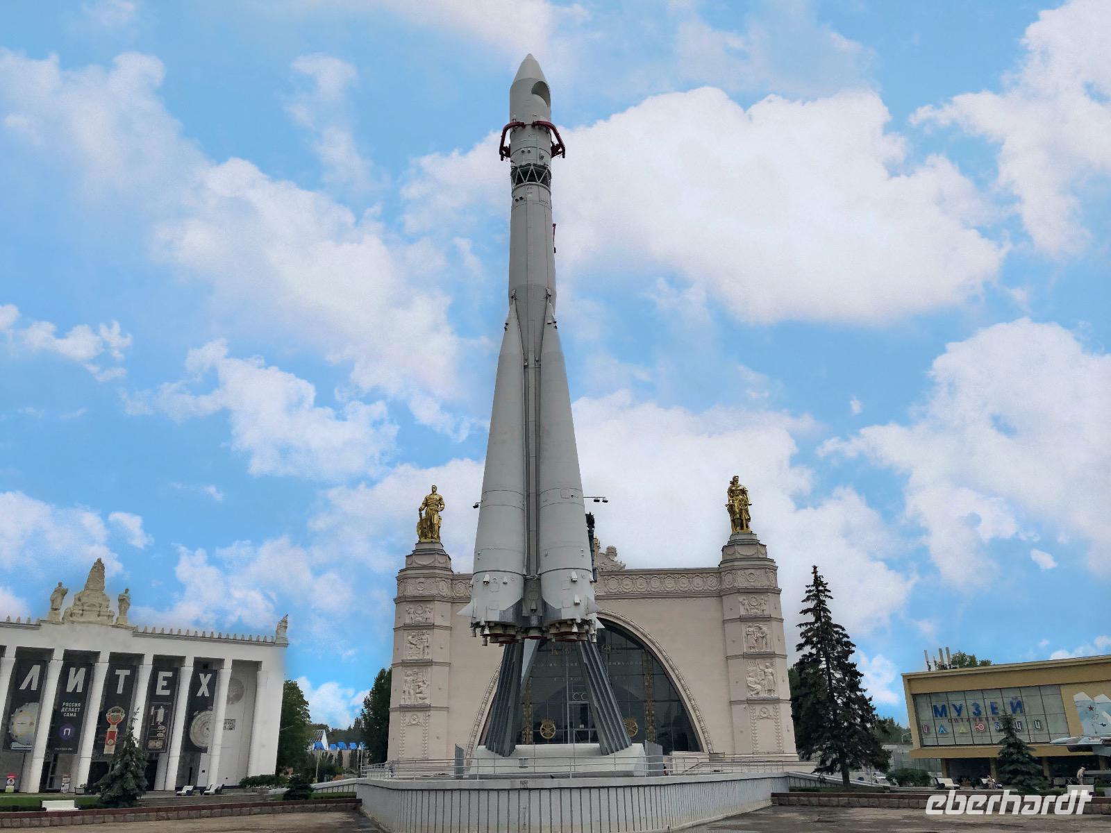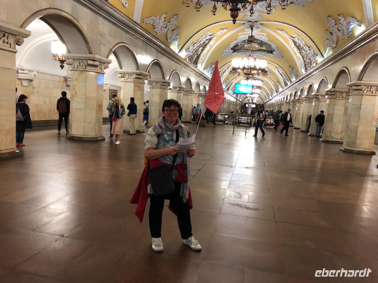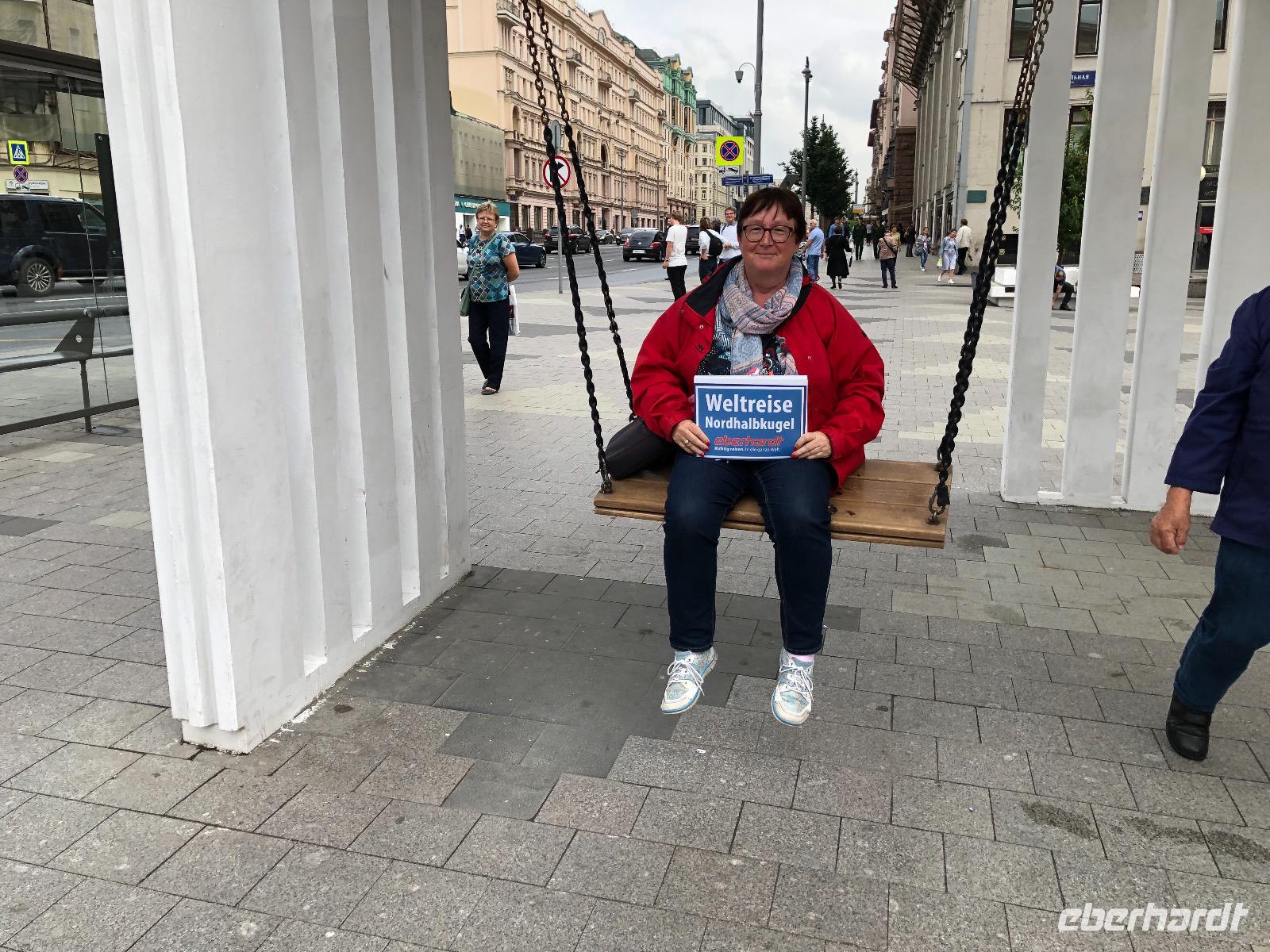 Der Tag steht zur freien Verfügung. Wir haben beschlossen, ihn gemeinsam zu verbringen und fahren zunächst mit der Metro zur Allunionsausstellung. Gut eine Stunde benötigen wir vom Hotel bis zur U-Bahn Station WDNCha. Als uns die lange Rolltreppe wieder ans Licht bringt, stehen wir vor einer Informationstafel und versuchen, uns zu orientieren. Wie groß ist die Überraschung als wir uns umdrehen und direkt vor einem Raumfahrtdenkmal stehen. Unser kollektives Ah! Und Oh! Wird von den Umstehenden wohlwollend und schmunzelnd registriert. Wir stehen also direkt vor dem Kosmonautenmuseum, halten uns aber rechts in Richtung eines großen Tores, wo wir den Eingang vermuten. Und so ist es dann auch. Wir kommen auf ein weitläufiges Gelände und spazieren durch eine breite Allee. Bereits am Eingang spüren wir, dass hier etwas Besonderes entsteht bzw. wieder aufgebaut wird. 2014 wurde die Allunionsausstellung geschlossen, doch nun wird an allen Ecken und Enden gewerkelt und gebaut. Einige Pavillons sind schon geöffnet, viele aber noch geschlossen. Hierher müssen wir wohl in ein paar Jahren noch einmal wieder kommen. Wir erreichen einen riesigen Springbrunnen, der von vergoldeten Figuren umringt wird. Es ist der Brunnen der Freundschaft. Unser Weg führt uns bis zu dem Modell der Rakete, die einst Juri Gagarin als ersten Menschen ins Weltall brachte. Hier kehren wir um, obwohl es noch viel zu sehen gäbe. Nun beginnen wir unser Metrohopping. An vielen interessanten Stationen steigen wir zum Besichtigen und Fotografieren aus. Jede Station widmet sich einem anderen Thema, alle sind aufwändig gestaltet. Die schönste und am meisten fotografierteste Station Komsomolskaja bildet den Abschluss unserer Rundfahrt. Von hier aus fahren wir zurück zum Hotel. Nach einer kurzen Erfrischungspause holt uns unser Fahrer Valerie ab und bringt uns zum Restaurant Tschaikowski, das sich im gleichnamigen Theater befindet. Wir sind zu früh und sollen in einer halben Stunde noch einmal wiederkommen. Gesagt, getan. Wir schauen uns in der Gegend um und entdecken genau gegenüber eine Schaukelkonstruktion für Erwachsene. Nach und nach gelingt es uns sogar, eine freie Schaukel zu erobern und so haben wir unseren Spaß und die halbe Stunde vergeht wie im Flug. Als wir erneut im Restaurant vorsprechen, werden wir erwartet und an unsere Tische geführt. Das Etablissement ist gewaltig, aber trotzdem gemütlich. Unsere Tische sind liebevoll eingedeckt und kaum, dass wir sitzen, wird der erste Gang gereicht, ein köstlicher Gemüsesalat. Anschließend gibt es Bortscht, Pommes und Schaschlik und einen prall gefüllten Windbeutel zum Nachtisch. Satt und zufrieden lassen wir uns von Valerie zum Flughafen chauffieren. Bald sind alle Schalter gefunden, wir sind eingecheckt und haben die Sicherheitskontrolle passiert. Ein wenig Aufregung verbreitet sich, als der Flug um zwei Stunden verschoben und dann doch wieder um eine Stunde nach vorn verändert wird. Aber alles ist gut und so fliegen wir in knapp sechs Stunden mit Sibirian Airlines nach Irkutsk.