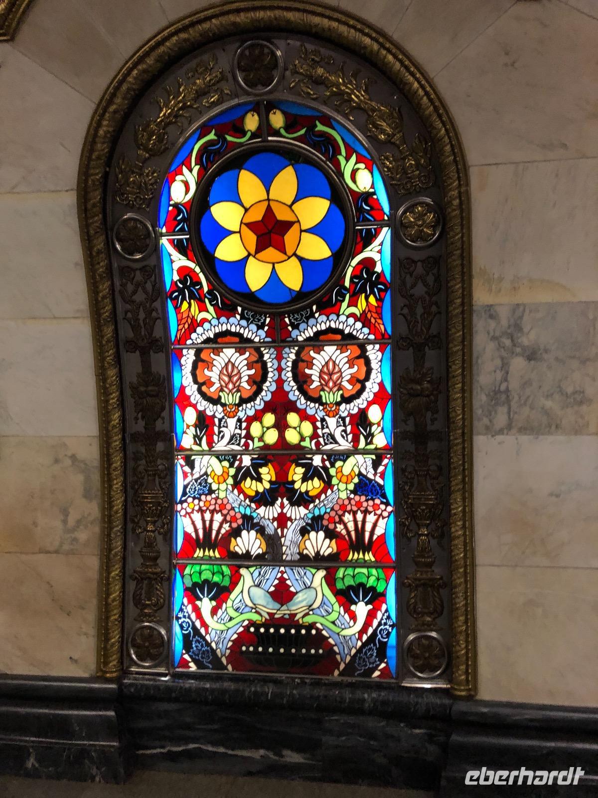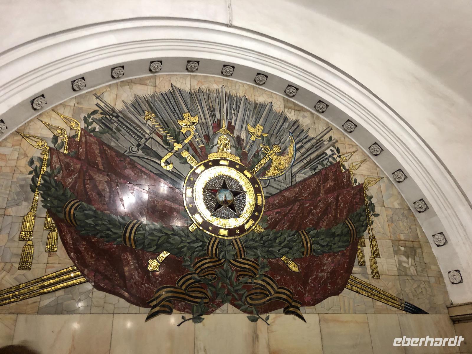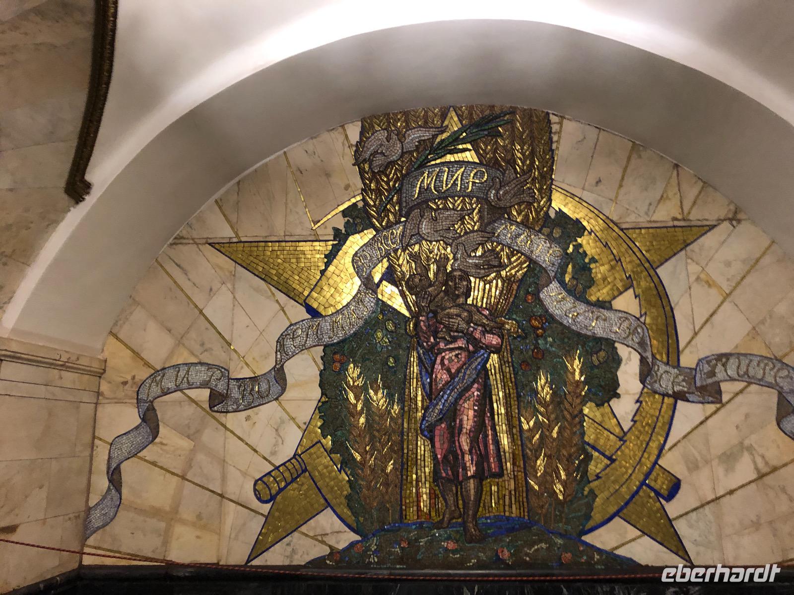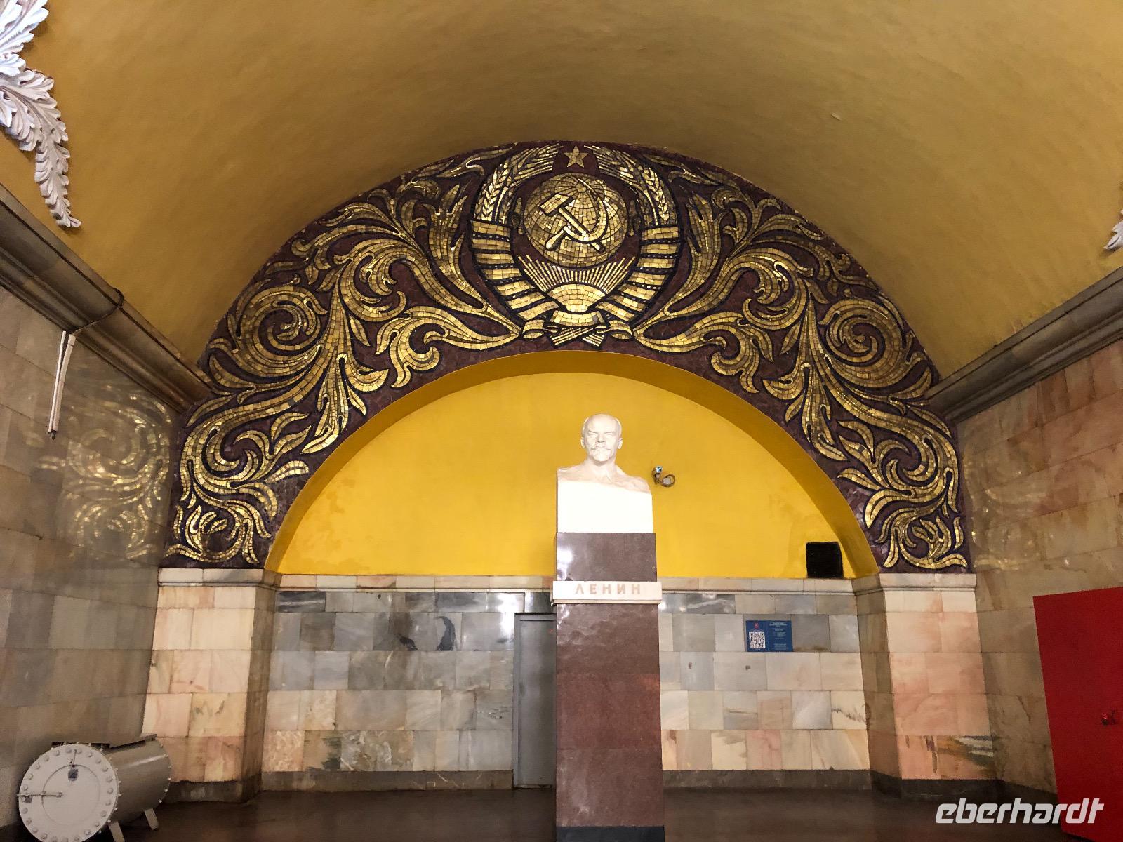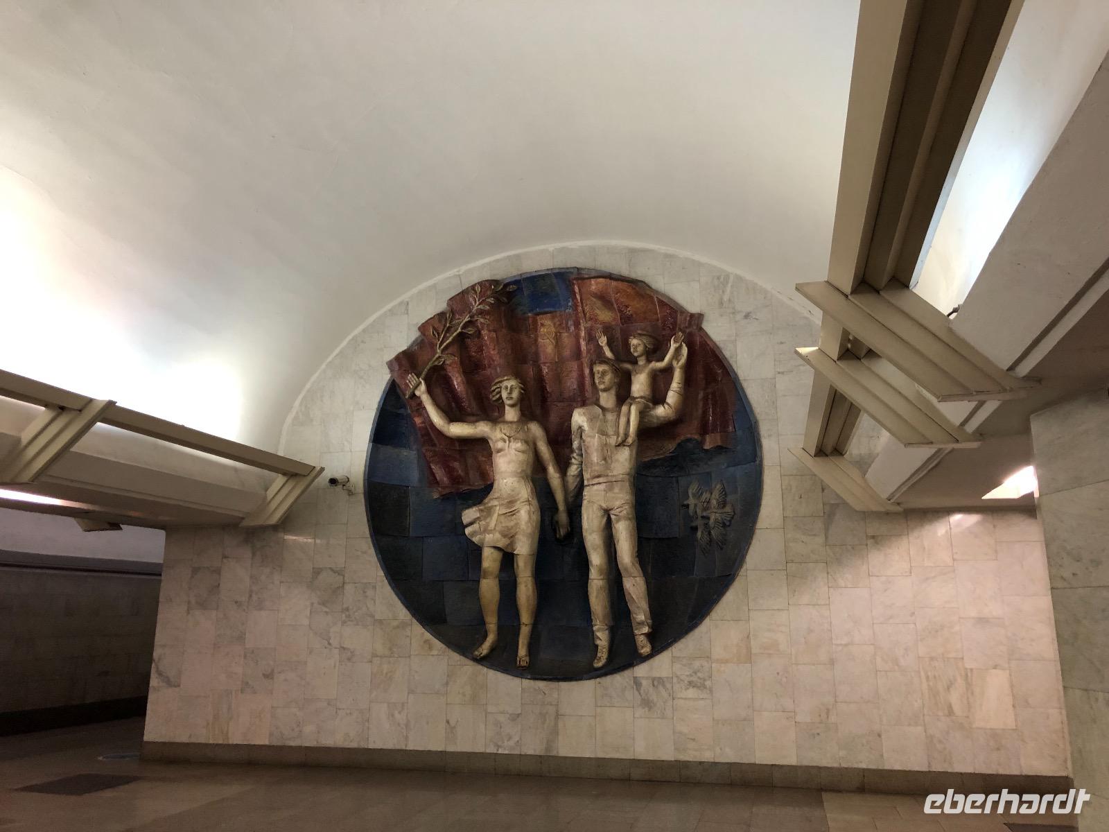 WOW: Nach dem Abendessen im Hotel, wo es heute köstlich schmeckenden Lachs gibt, unternehmen wir eine Fahrt mit der Metro. Ca. zehn Minuten Fußweg von unserem Hotel befindet sich eine Metrostation der roten Linie Nummer 1. Nachdem wir uns die Fahrkarten besorgt haben, die hier in Form eines Jetons ausgegeben werden, fahren wir mit einer Rolltreppe tief unter die Erde. Wir fahren acht Stationen bis Avtovo. Das ist die Station, wo die Säulen aus Glas sind und sich am Ende des Bahnsteigs ein schönes Mosaik befindet. Von hier aus fahren wir zurück und steigen an einigen Stationen aus. Alle sind unterschiedlich gestaltet, mal werden Szenen aus dem russischen Alltag (1950er Jahre) dargestellt, mal werden technische Errungenschaften der Sowjetunion gerühmt und eine Station ist dem großen Dichter Puschkin gewidmet. Nach fast zwei Stunden endet unsere Fahrt, dort, wo wir eingestiegen sind. Mit einem Gläschen Wodka begießen wir die erfolgreiche Fahrt mit der Metro, die für die Meisten eine Premiere war.