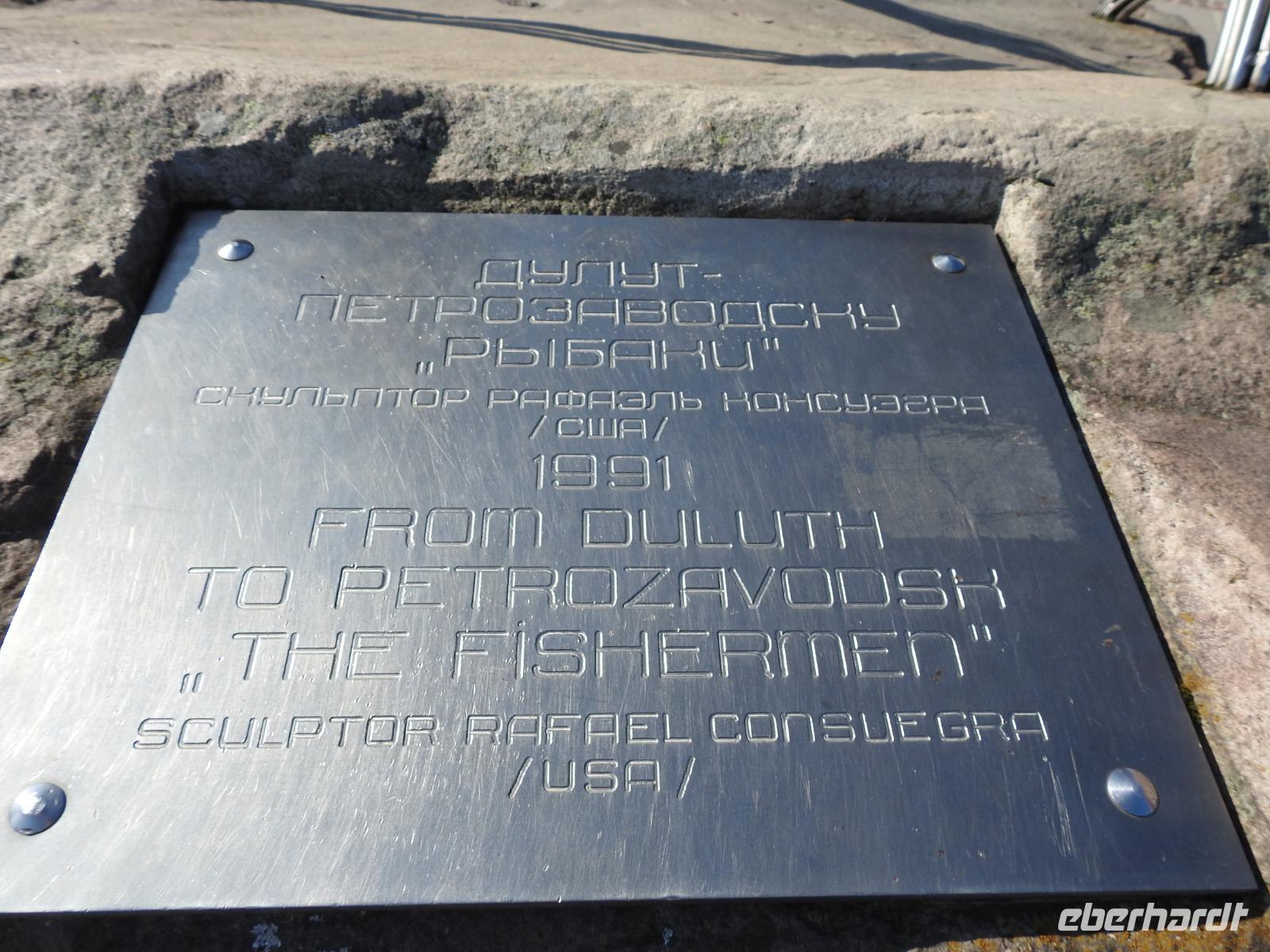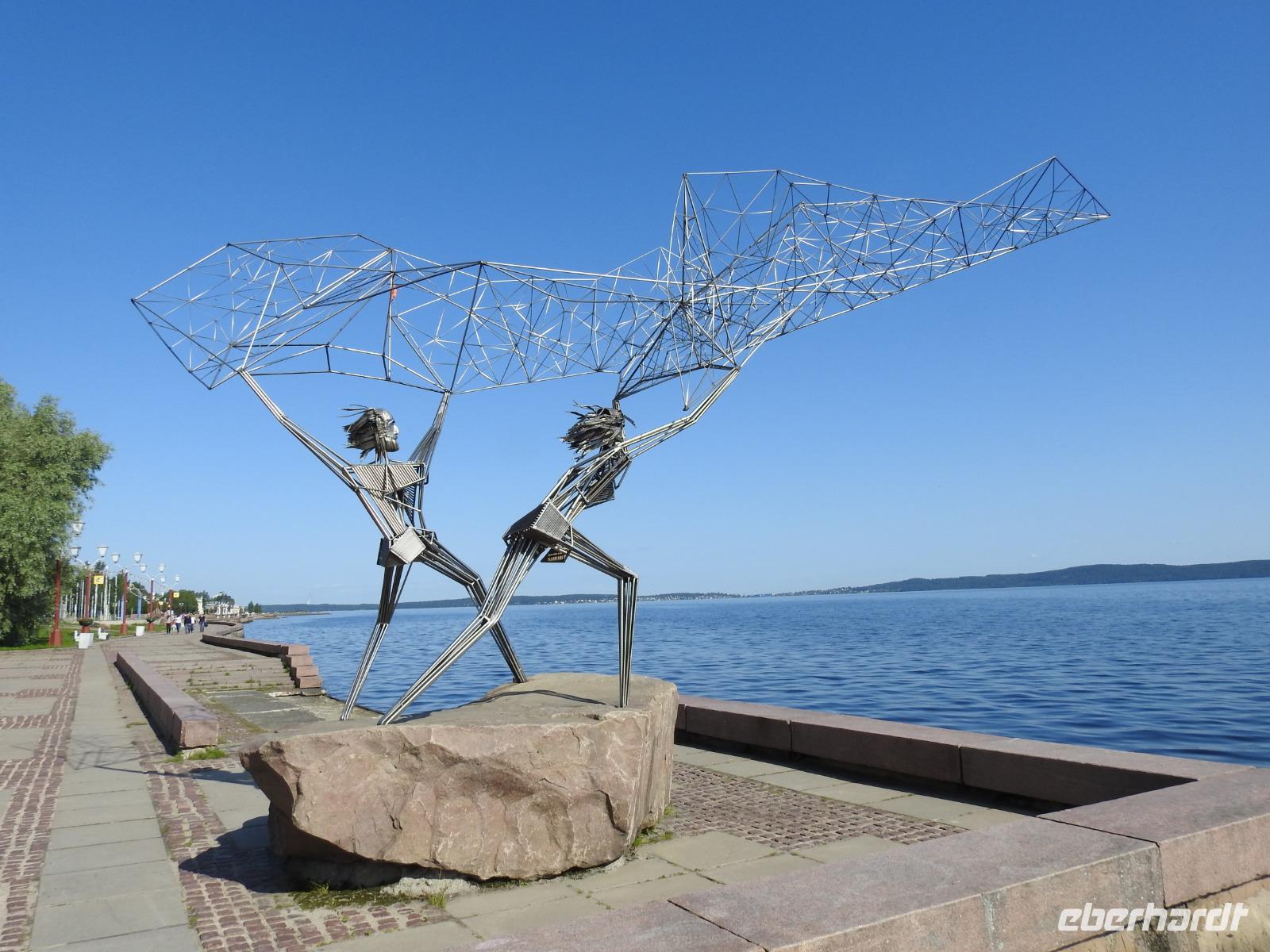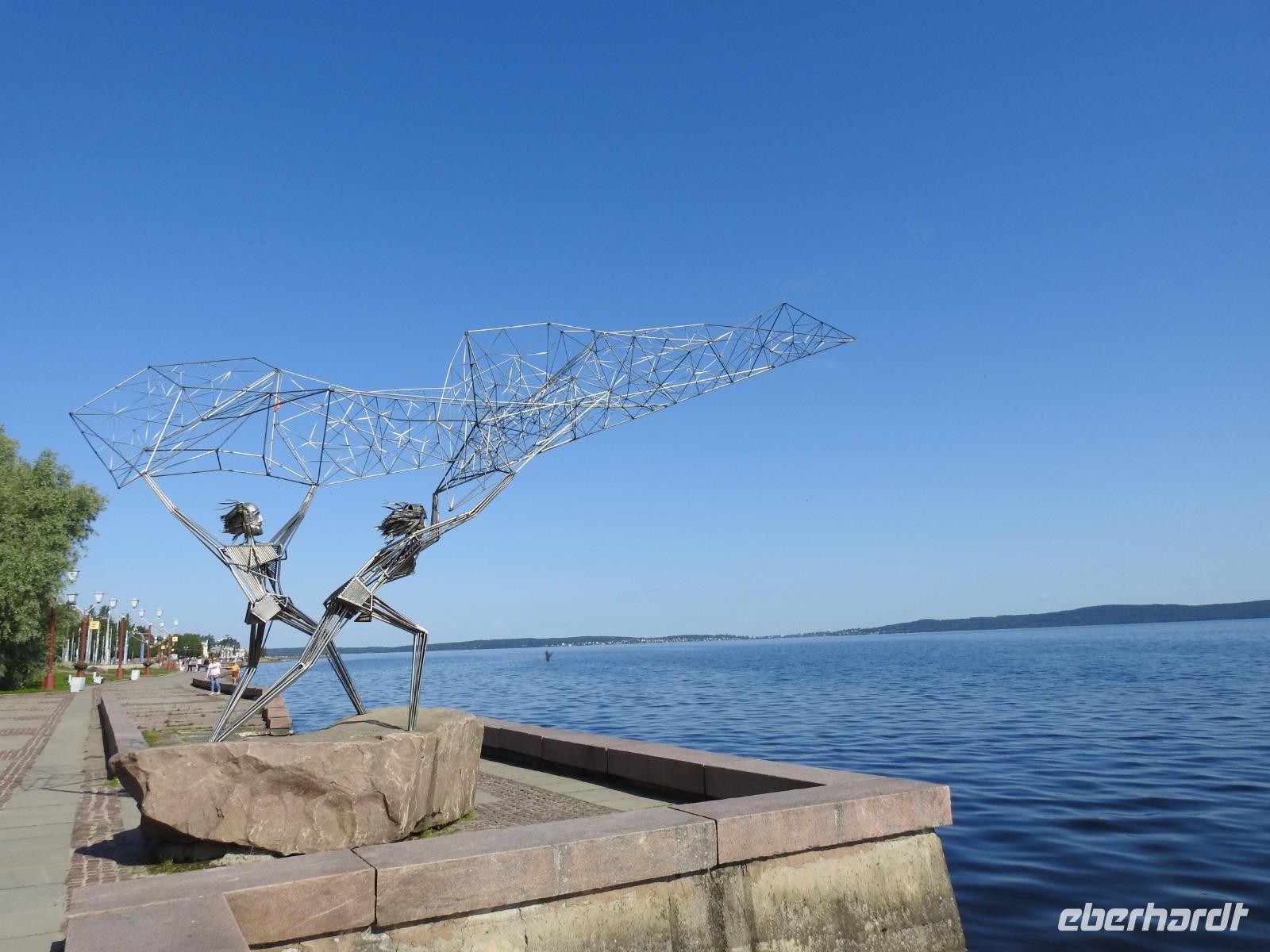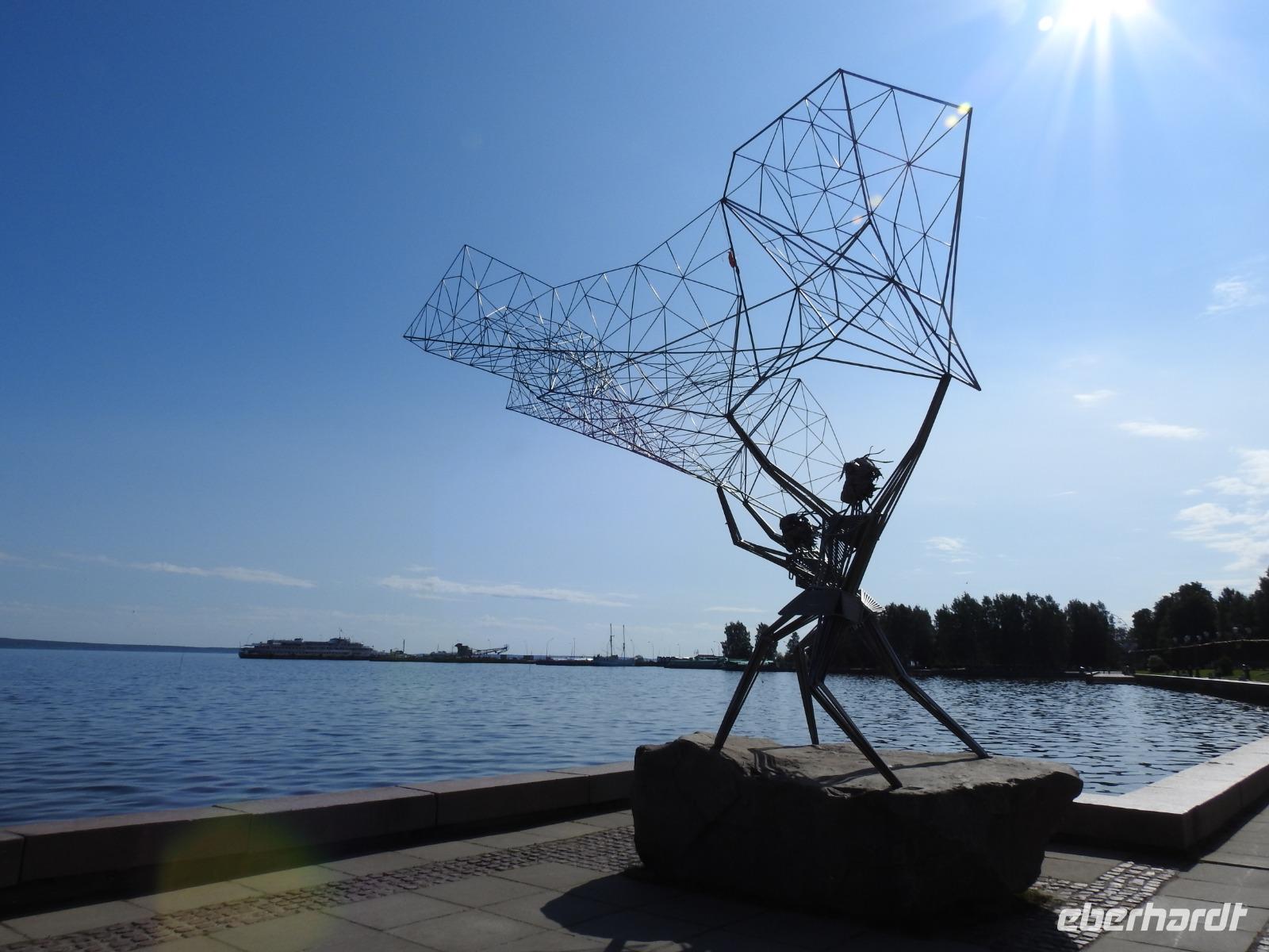 Nach dem Frühstück verladen wir unser großes Gepäck in den wirklich kleinen Bus. Aber irgendwie passt alles hinein. Wir fahren wieder zum Onegasee und unternehmen einen Spaziergang entlang der Uferpromenade. Überall sind Skulpturen aufgestellt, die Petrosawodsk von Partnerstädten geschenkt wurden. Am auffälligsten sind die FISCHER, zwei Figuren aus Metall über denen ein stilisiertes Fischernetz schwebt. Das Bronzedenkmal für Peter den Großen, das sich am Ende der Uferpromenade befindet, ist die älteste Skulptur und stammt aus dem Jahre 1873.
