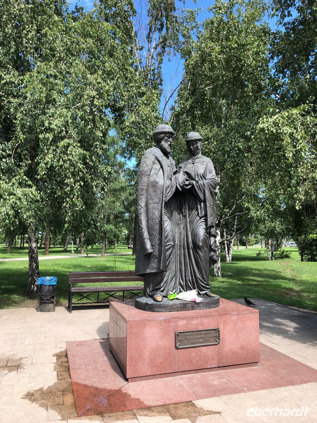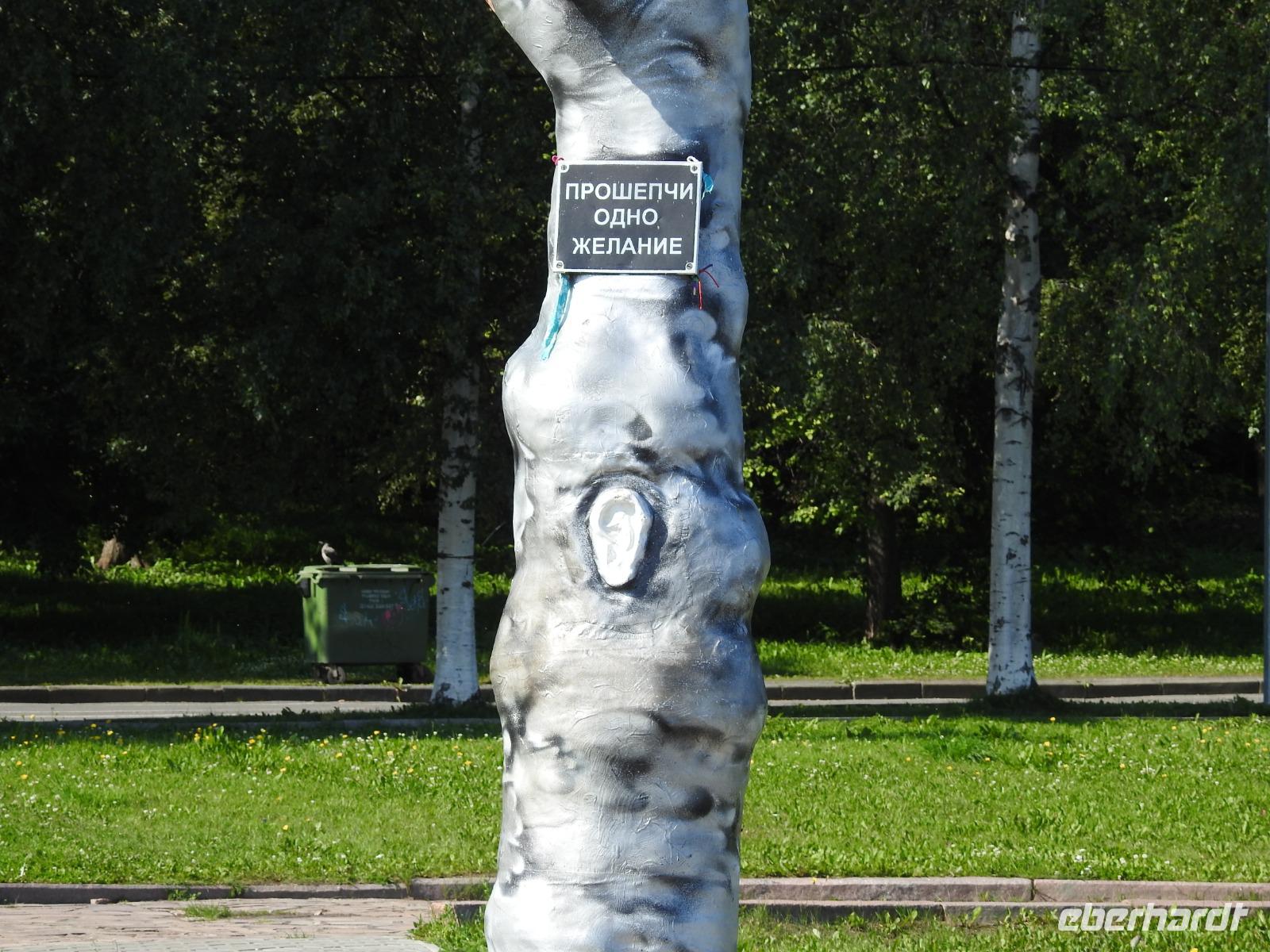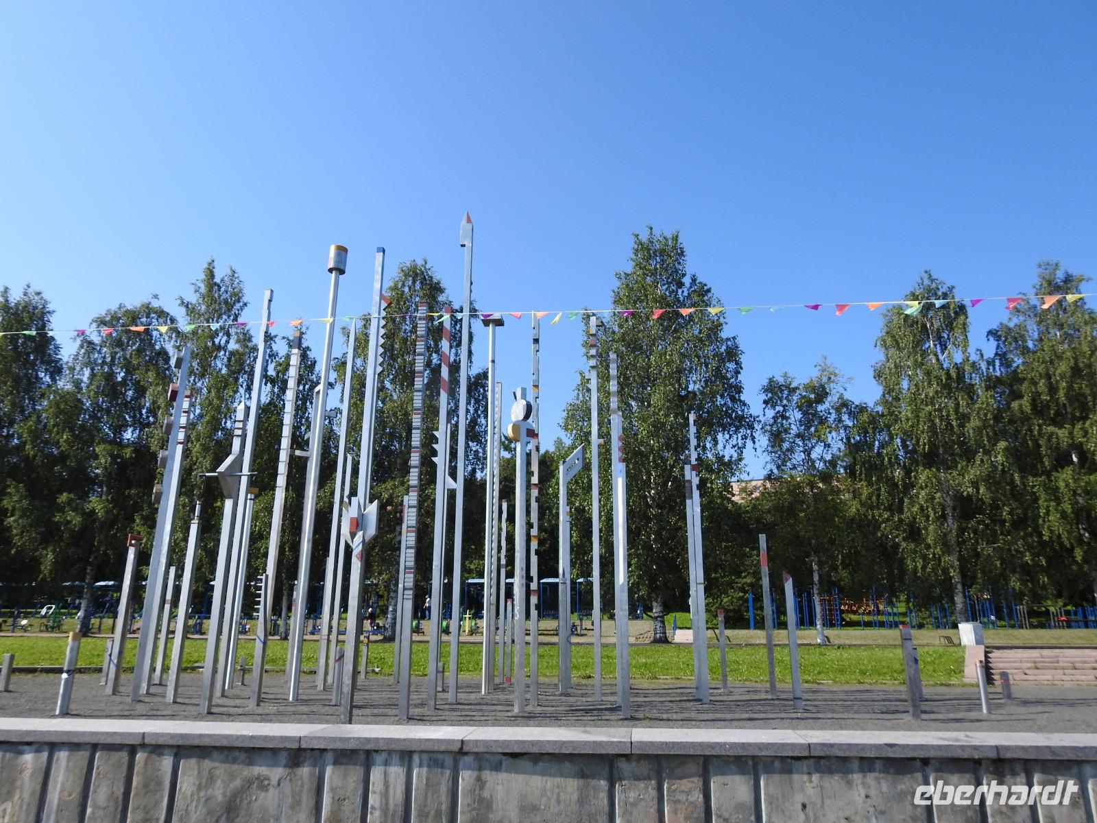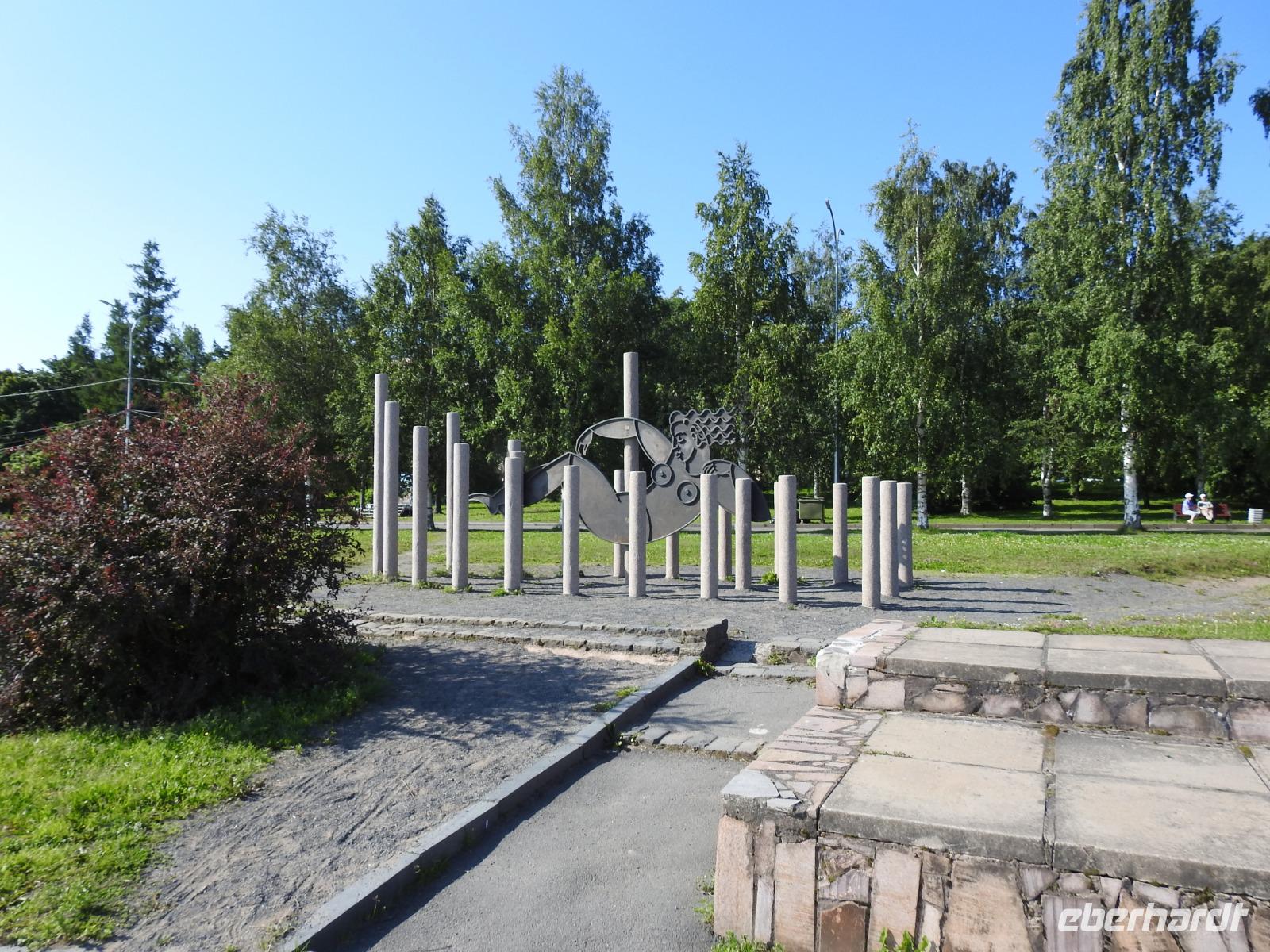 Nach dem Frühstück verladen wir unser großes Gepäck in den wirklich kleinen Bus. Aber irgendwie passt alles hinein. Wir fahren wieder zum Onegasee und unternehmen einen Spaziergang entlang der Uferpromenade. Überall sind Skulpturen aufgestellt, die Petrosawodsk von Partnerstädten geschenkt wurden. Am auffälligsten sind die FISCHER, zwei Figuren aus Metall über denen ein stilisiertes Fischernetz schwebt. Das Bronzedenkmal für Peter den Großen, das sich am Ende der Uferpromenade befindet, ist die älteste Skulptur und stammt aus dem Jahre 1873.